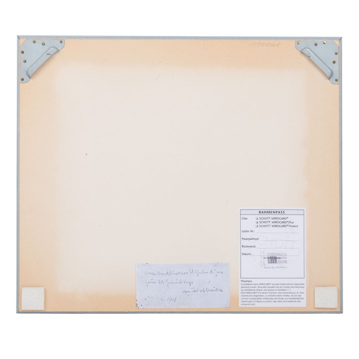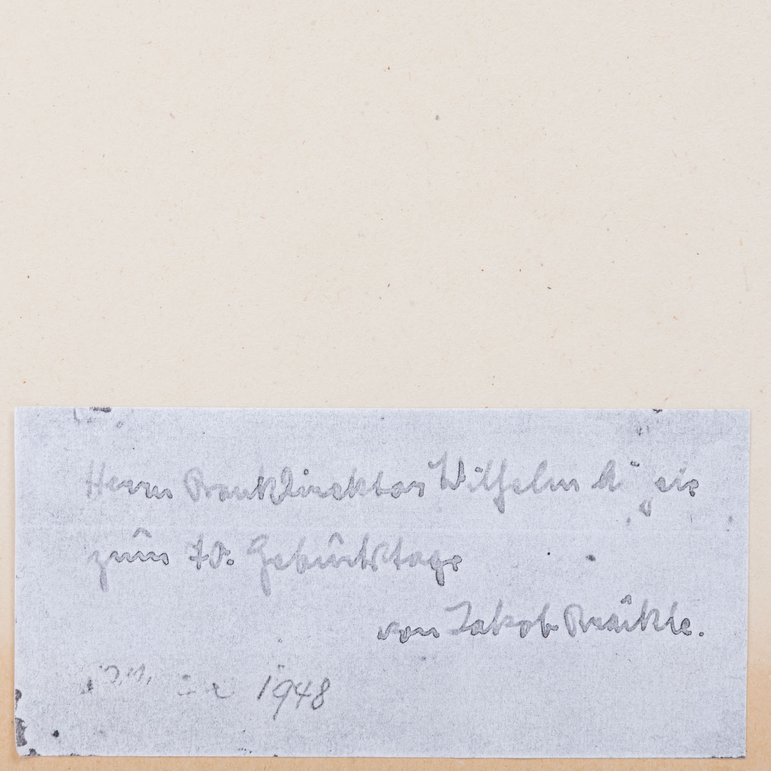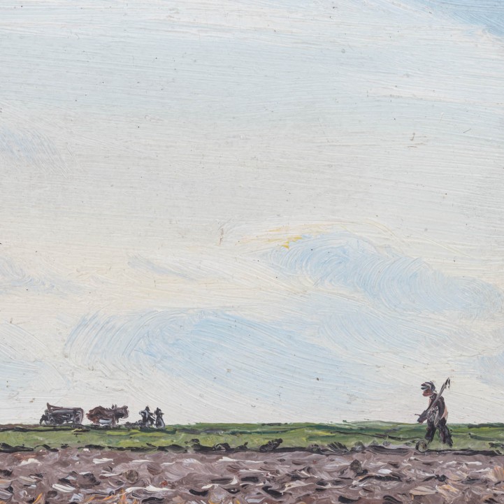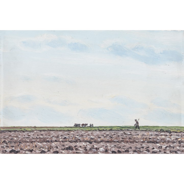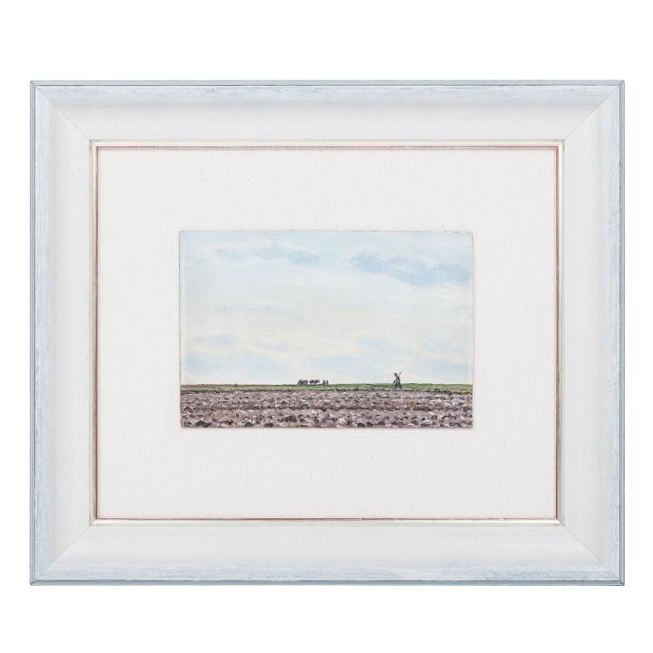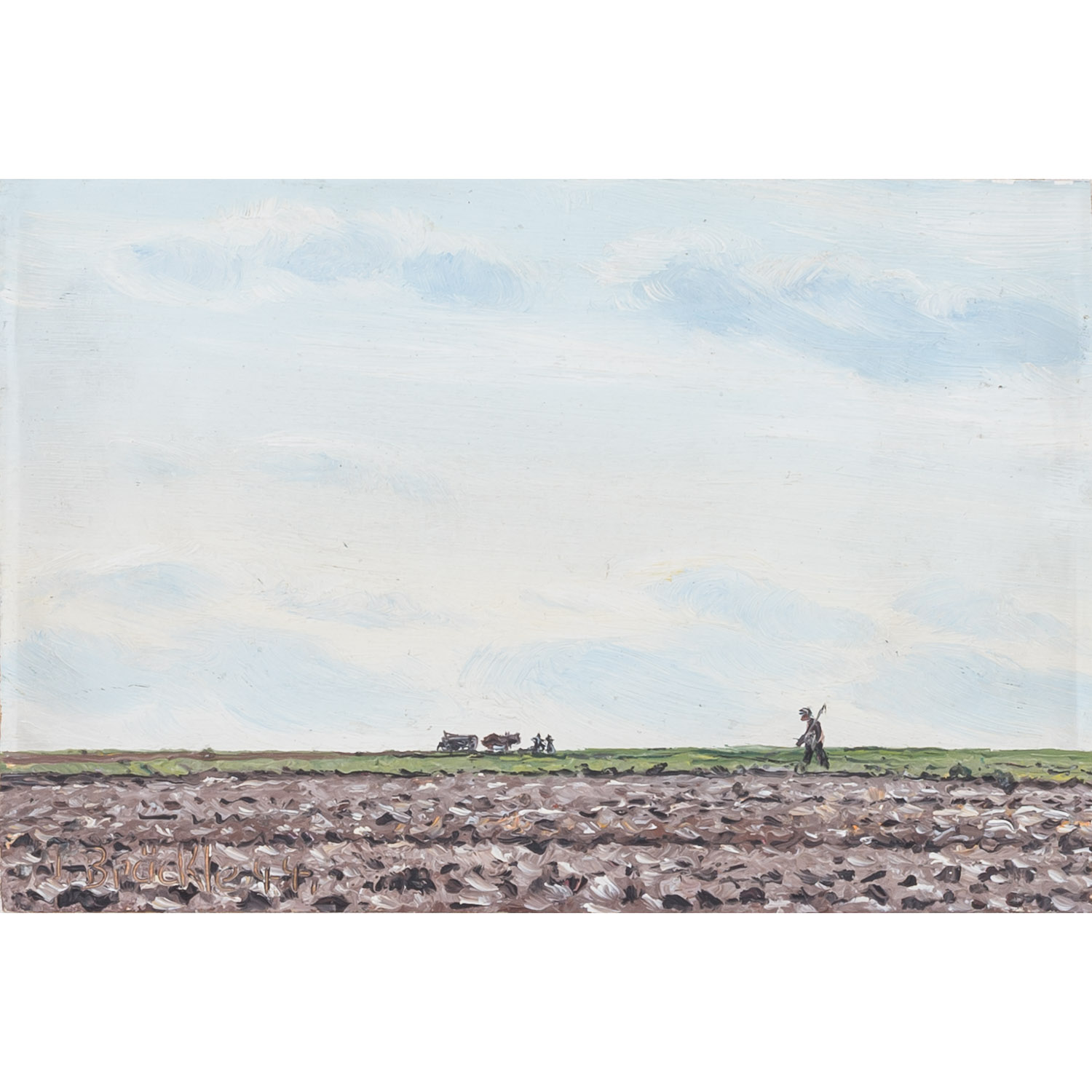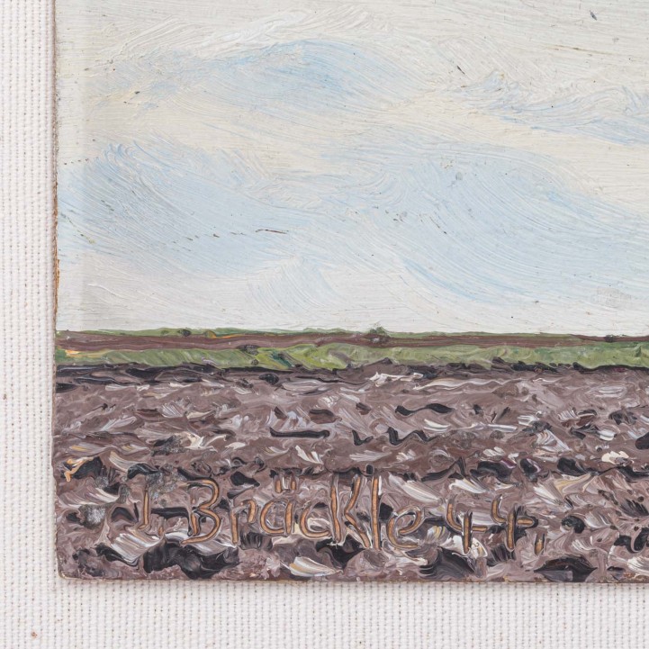 Feld und Wiese unter blauem Himmel, am Horizont ein Bauer und ein Wagen, u.li. Ritzsignatur und -datierung 'J. Bräckle 44.', Öl/Karton auf Leinwand aufgezogen, HxB: ca. 12x18 cm (31,5x37 cm mit Rahmen). Leichte Alters- und Schmutzspuren, wenige kleine Farbabplatzer an der Kante. Mit Rahmen. VERSO Kopie mit Widmung 'Herrn Bankdirektor Wilhelm Aichele(?) zum 70. Geburtstag, von Jakob Bräckle', 1948 (wohl von der ursprünglichen Bildrückseite). Wir danken Herr Dr. Uwe Degreif, Biberach für die freundliche Bestätigung anhand der Fotos.
