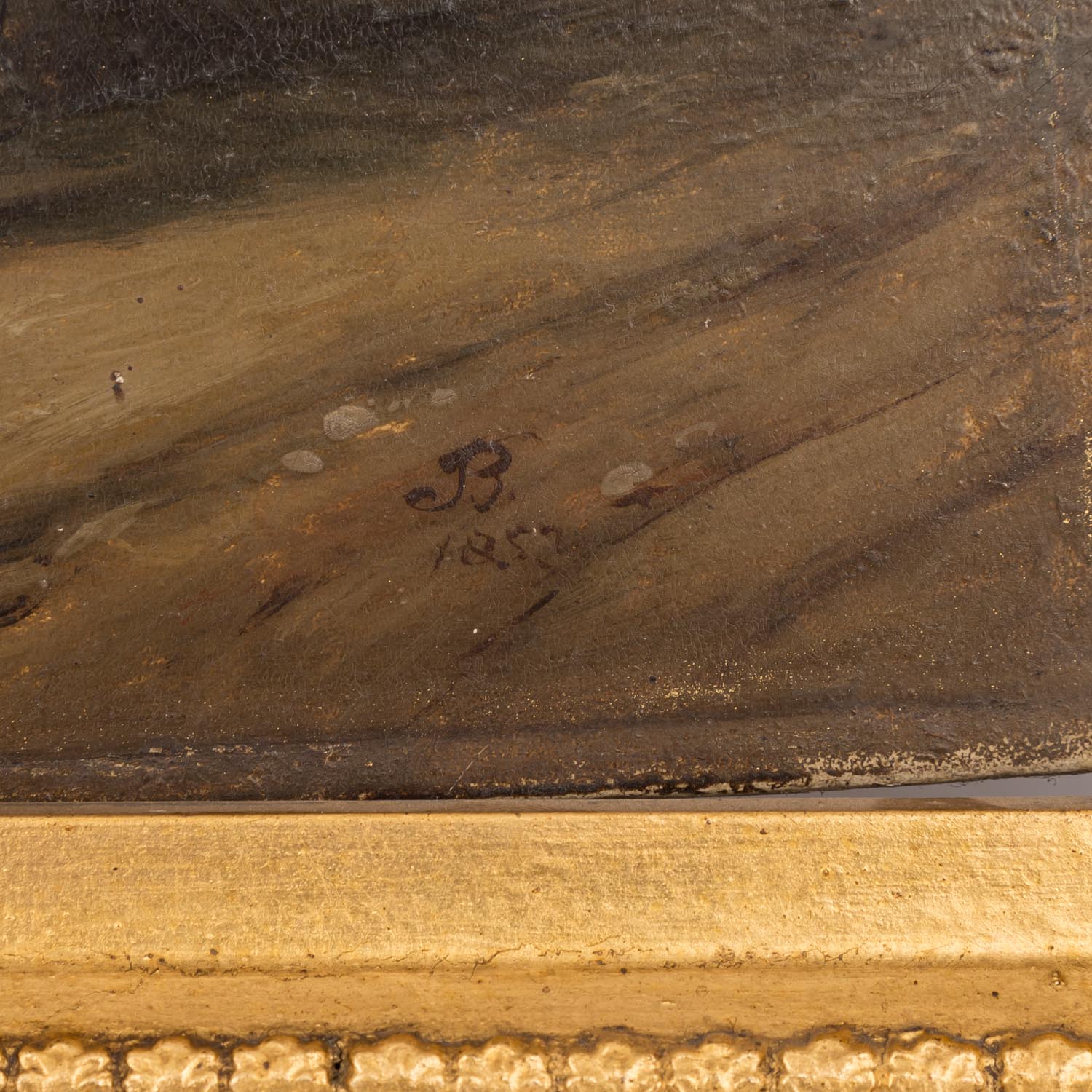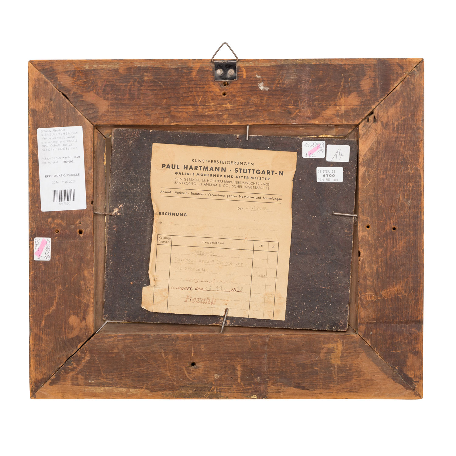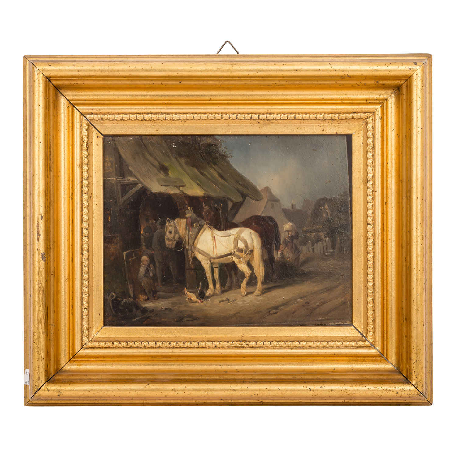 BRAUN, Reinhold, ATTRIBUTED (1821-1884), ""Horses in front of the smithy"", monogr. and dated 'B. 1852 ', oil / wood, HxW: approx. 18.5x24 cm (32x38 cm with frame). Part. Color flaking / rubbing. With frame (slightly damaged). VERSO invoice of the art auctions Paul Hartmann, Stuttgart dated December 16, 1938 with description.