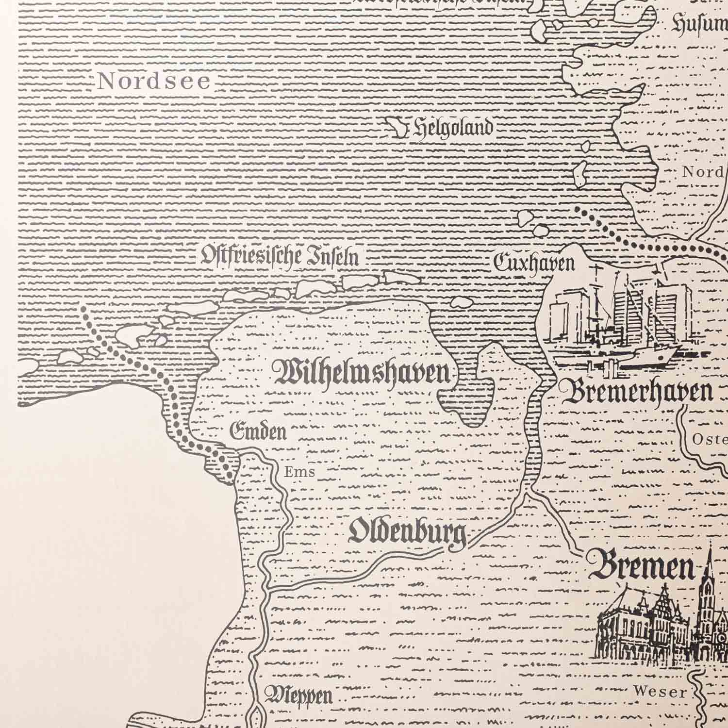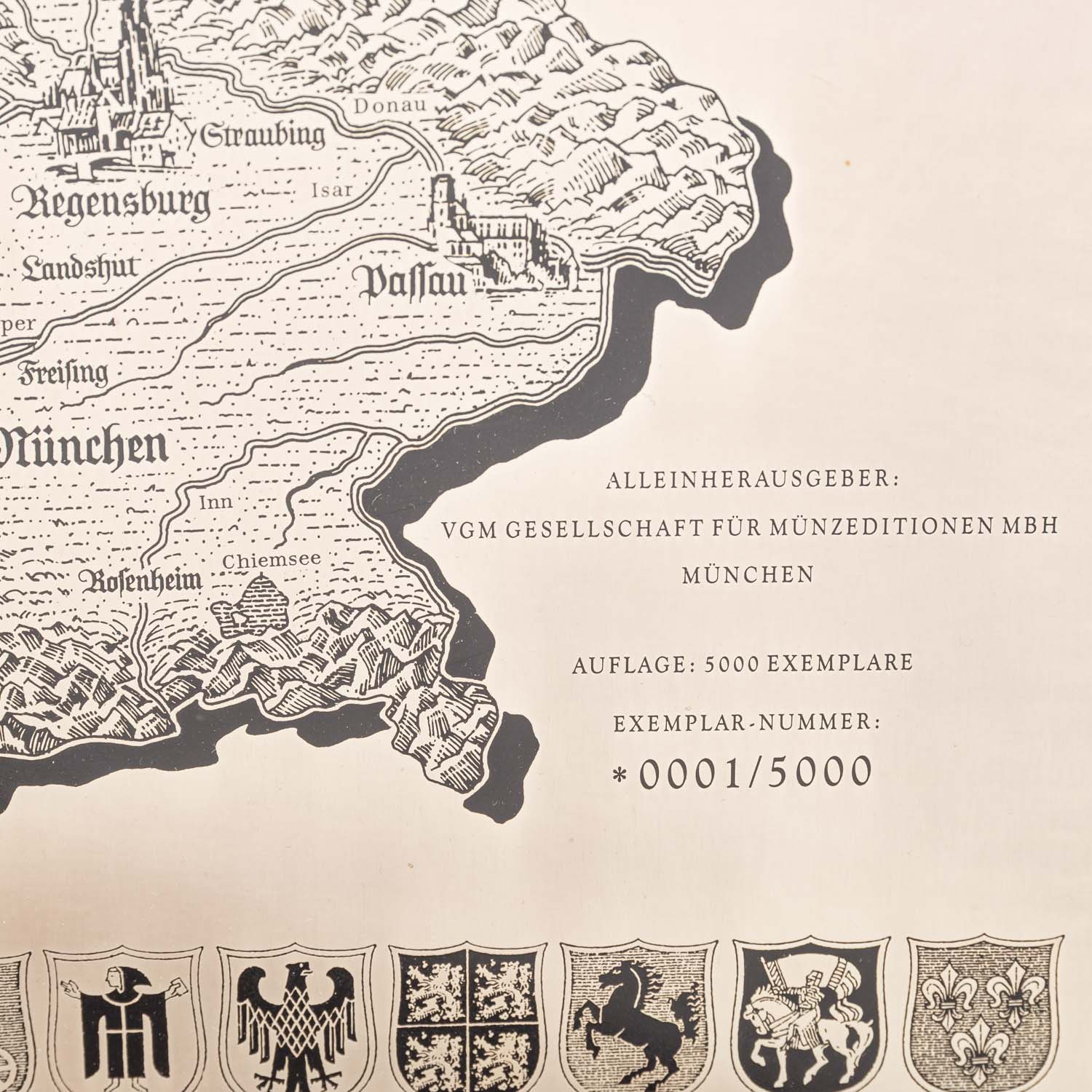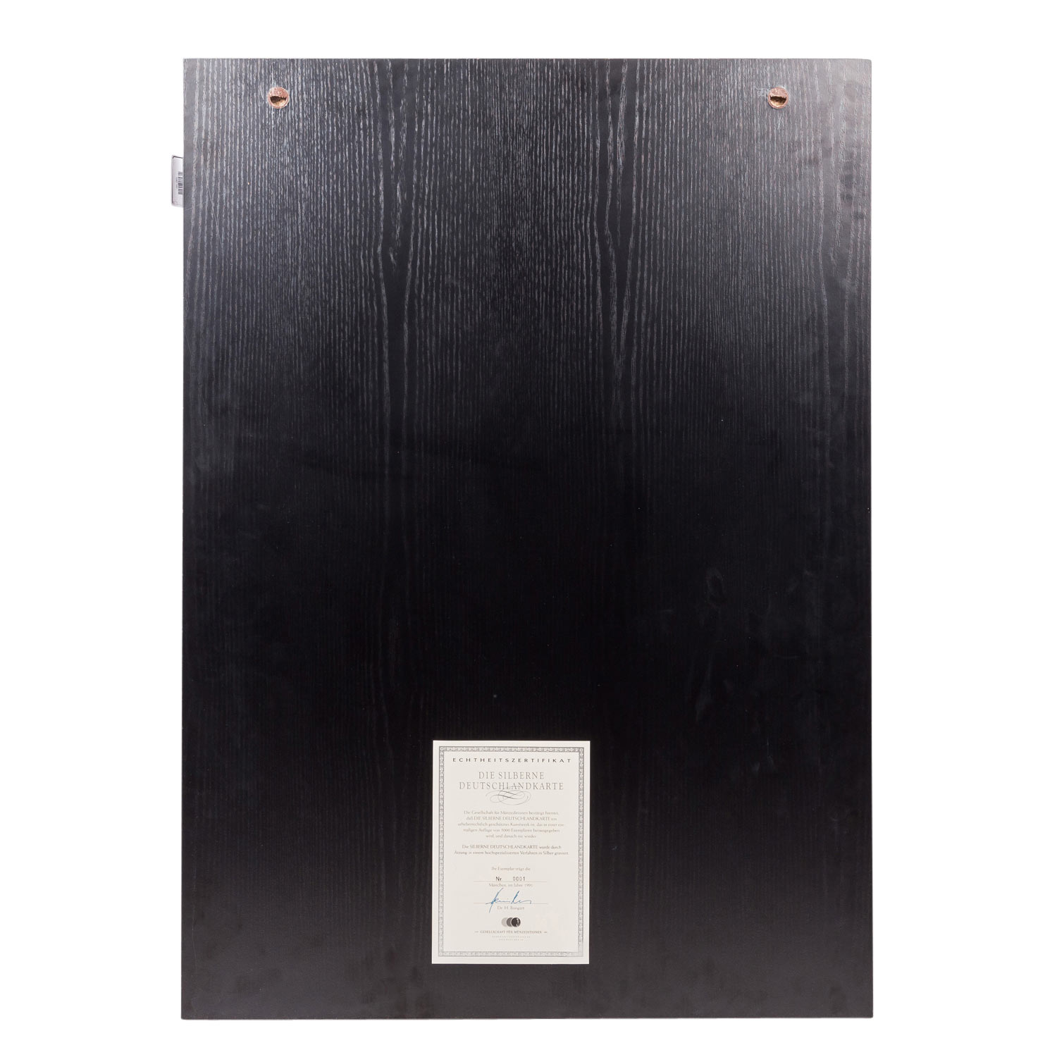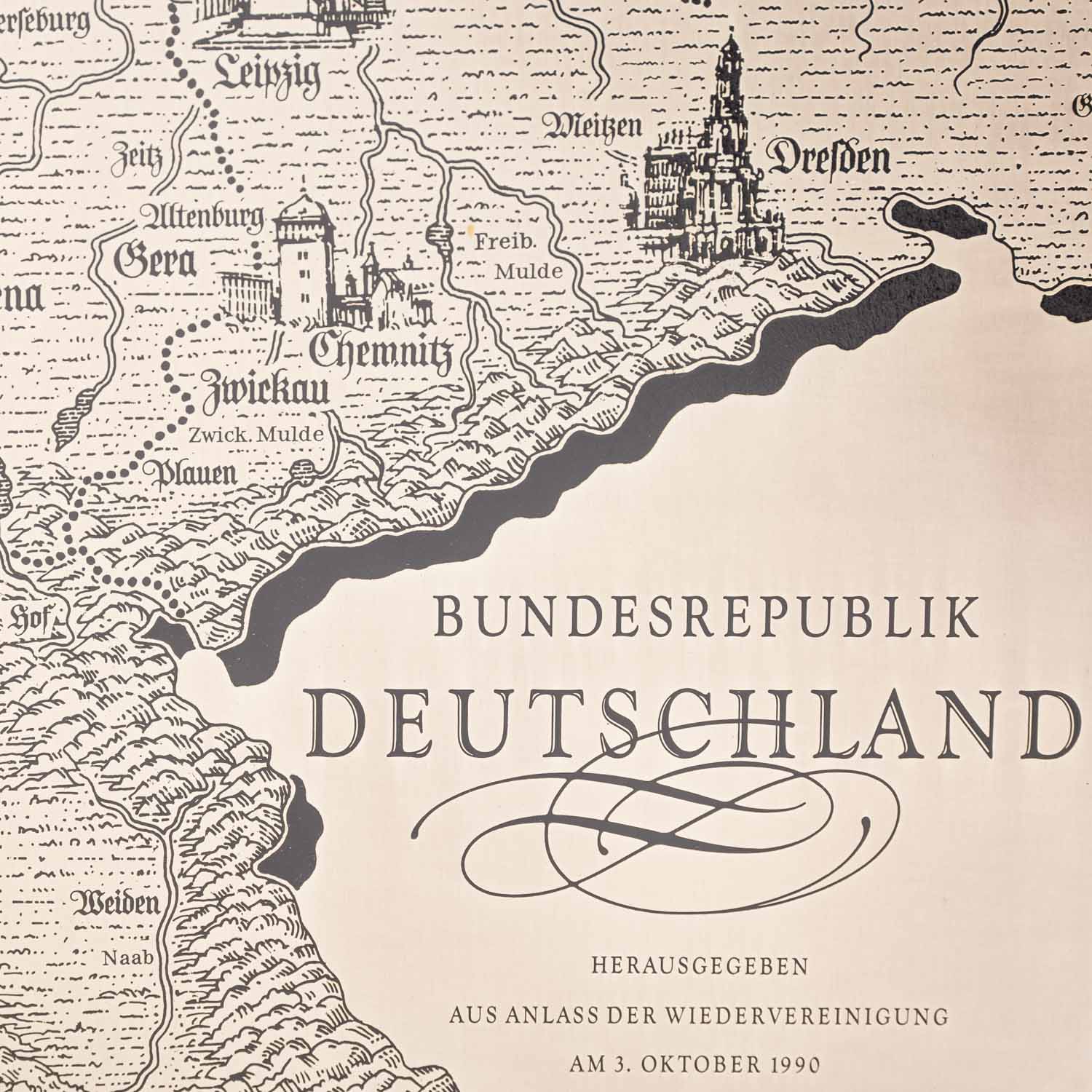 Herausgegeben zum Anlass der Wiedervereinigung am 3.10.1990. In Silber gravierte Karte der BRD. Limitierte Auflage Nr. 1/5000. Gesamtgewicht ca. 11,5kg. Maße mit Rahmen 65cm x 92 cm. Mit Alters-und Gebrauchsspuren.