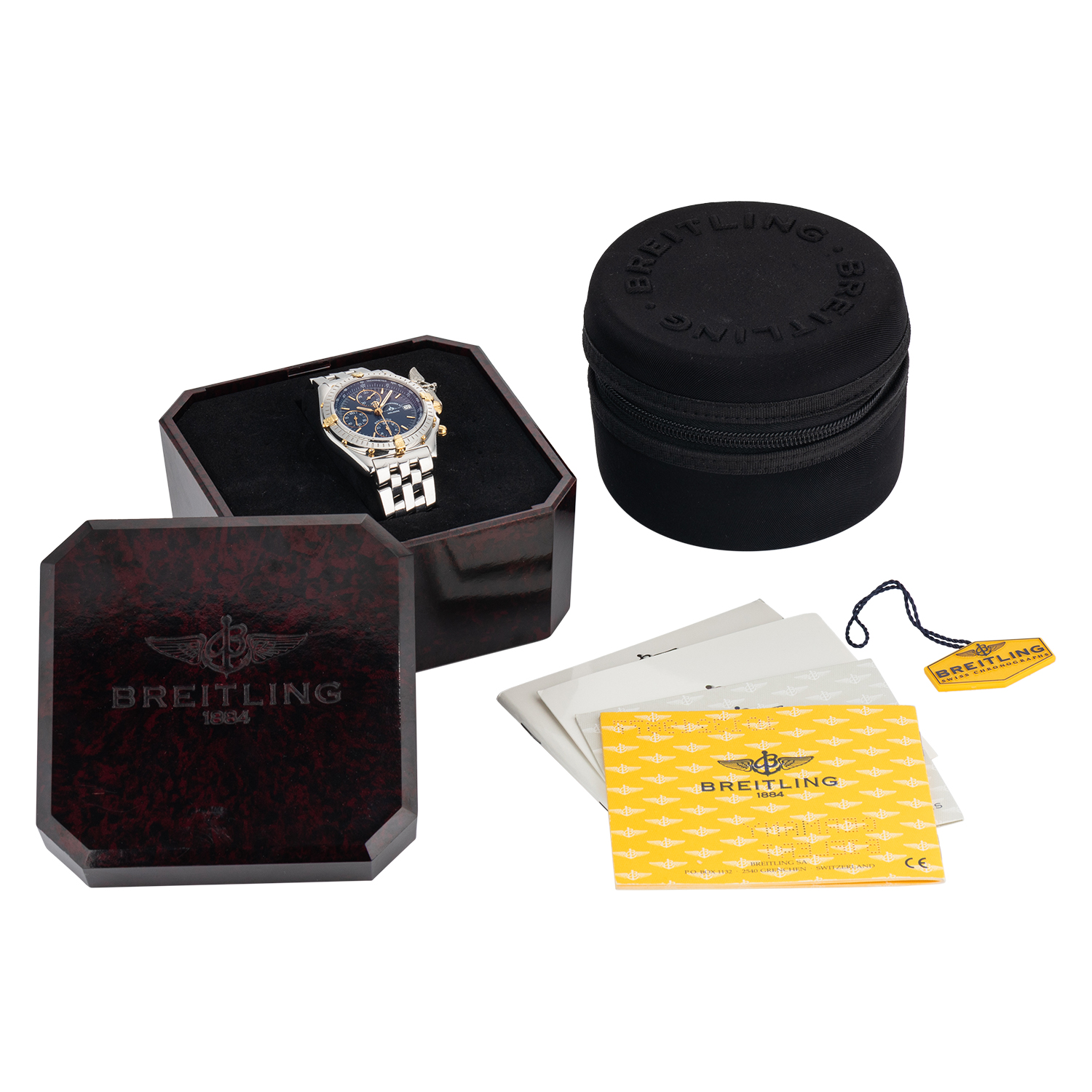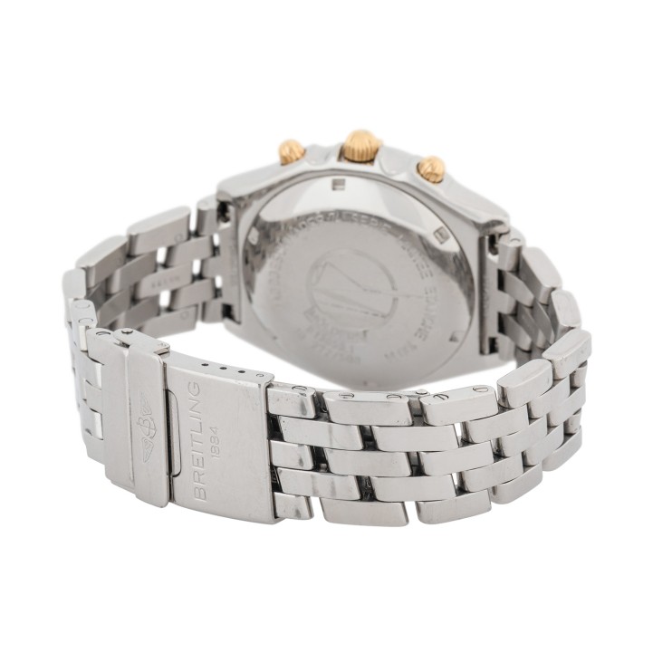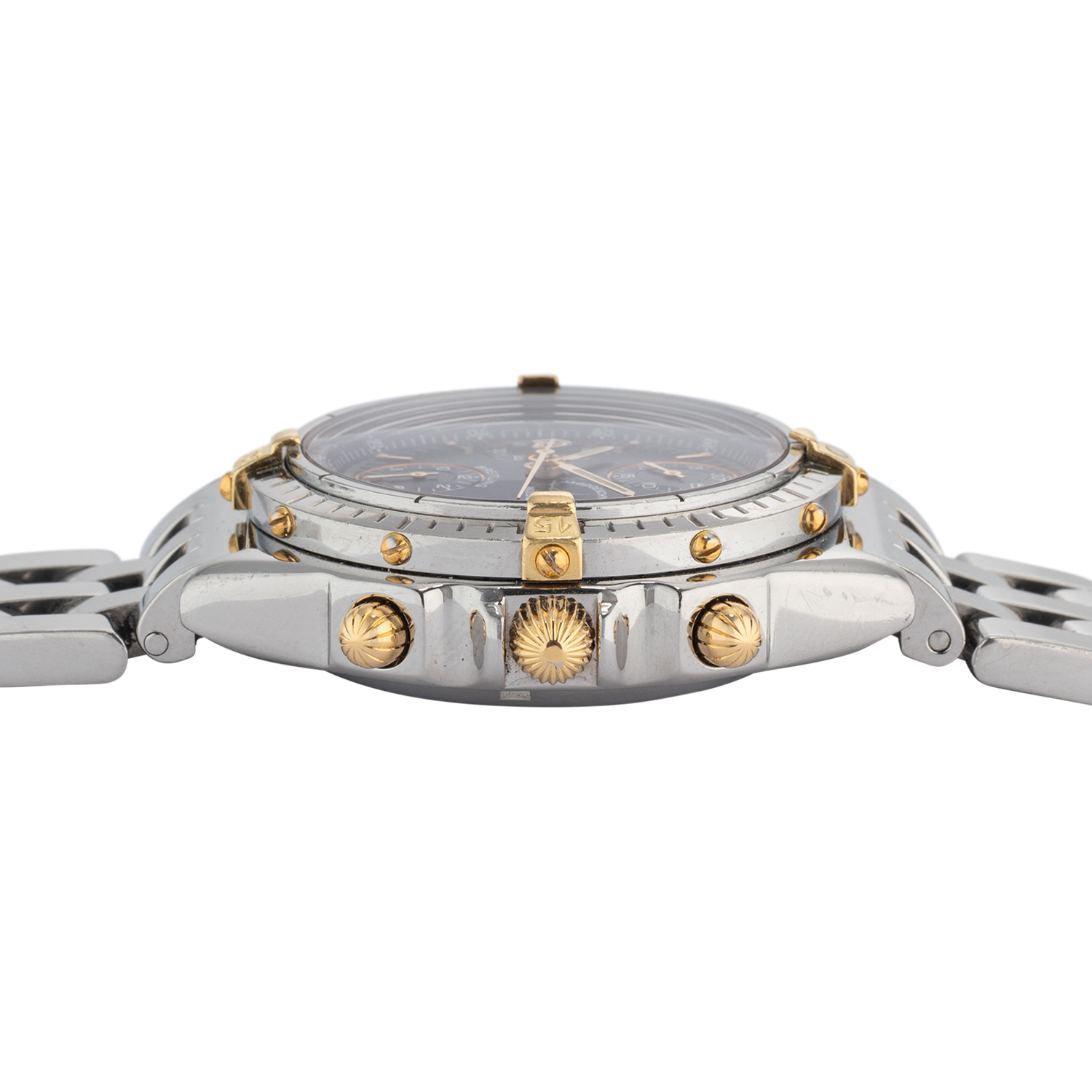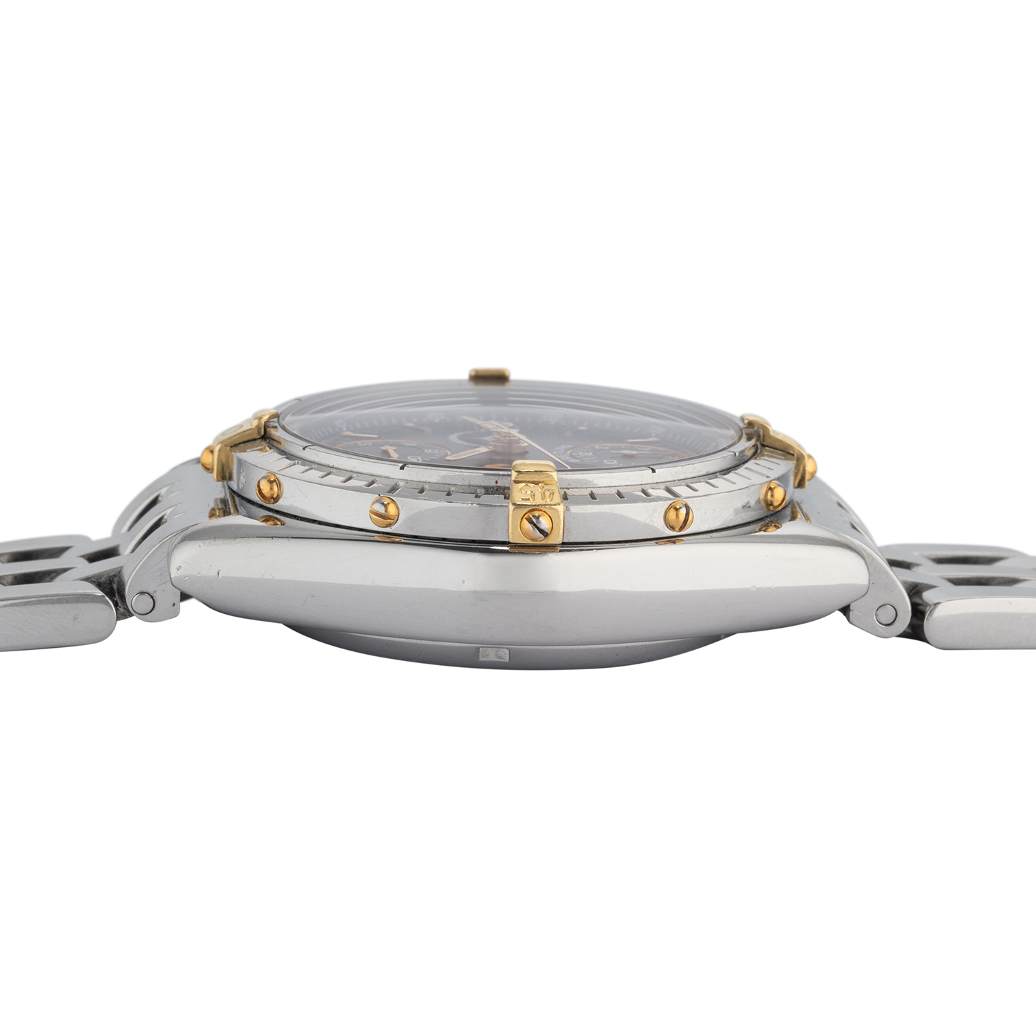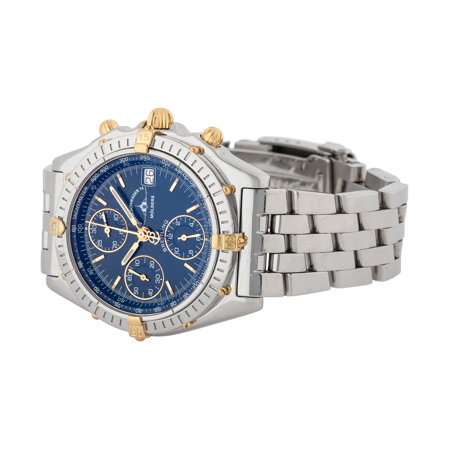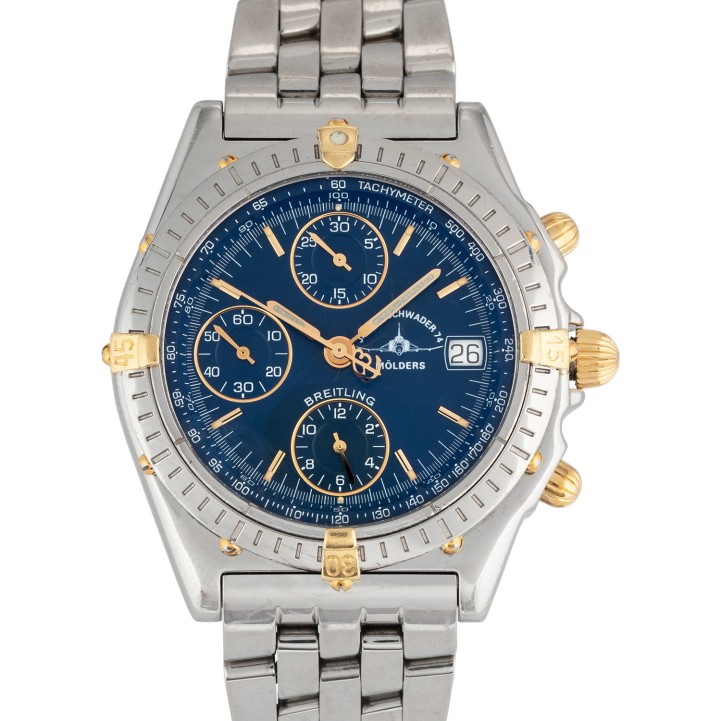 Edelstahl / 18K Gelbgold limitierte Serie, Nr. 272/500. Automatikwerk Kal. 13 auf Basis von Valjoux 7750 mit guten Gangwerten (+3 s/d, 268° Amplitude). Dunkelblaues Zifferblatt mit Stabindizes, drei Hilfszifferblätter, Datumsanzeige, Tachymeterskala und zentraler Stoppsekunde. Einseitig drehbare Taucherlünette. Fünfreihiges Edelstahl Gliederarmband mit Sicherheitsfaltschließe. Gebraucht mit Tragespuren. Box und Papiere aus 06/1997 sowie Hangtag anbei, Erstkaufrechnung von Juwelier Eckstein in Saarbrbücken und Reparaturbeleg (Krone, Dichtung, Stopper) von Uhren Trautmann in Kralsruhe vorhanden. Durchmesser ca. 40 mm gemessen ohne Krone. Passend bis zu einem Handgelenksumfang von ca. 20 cm.
