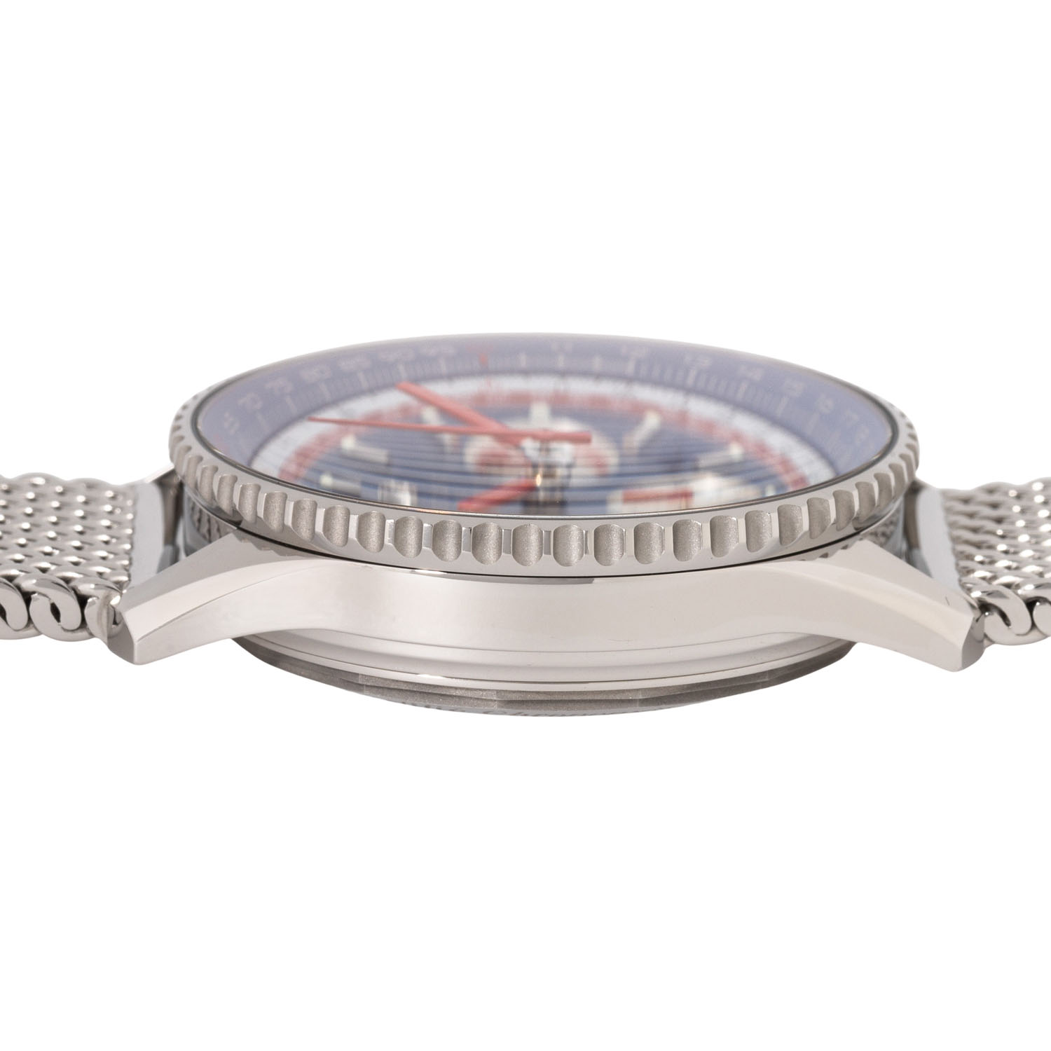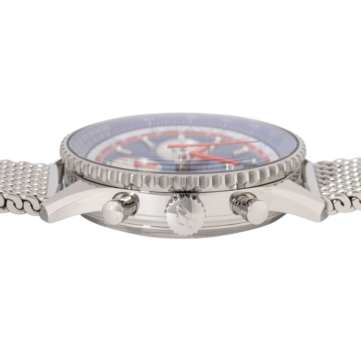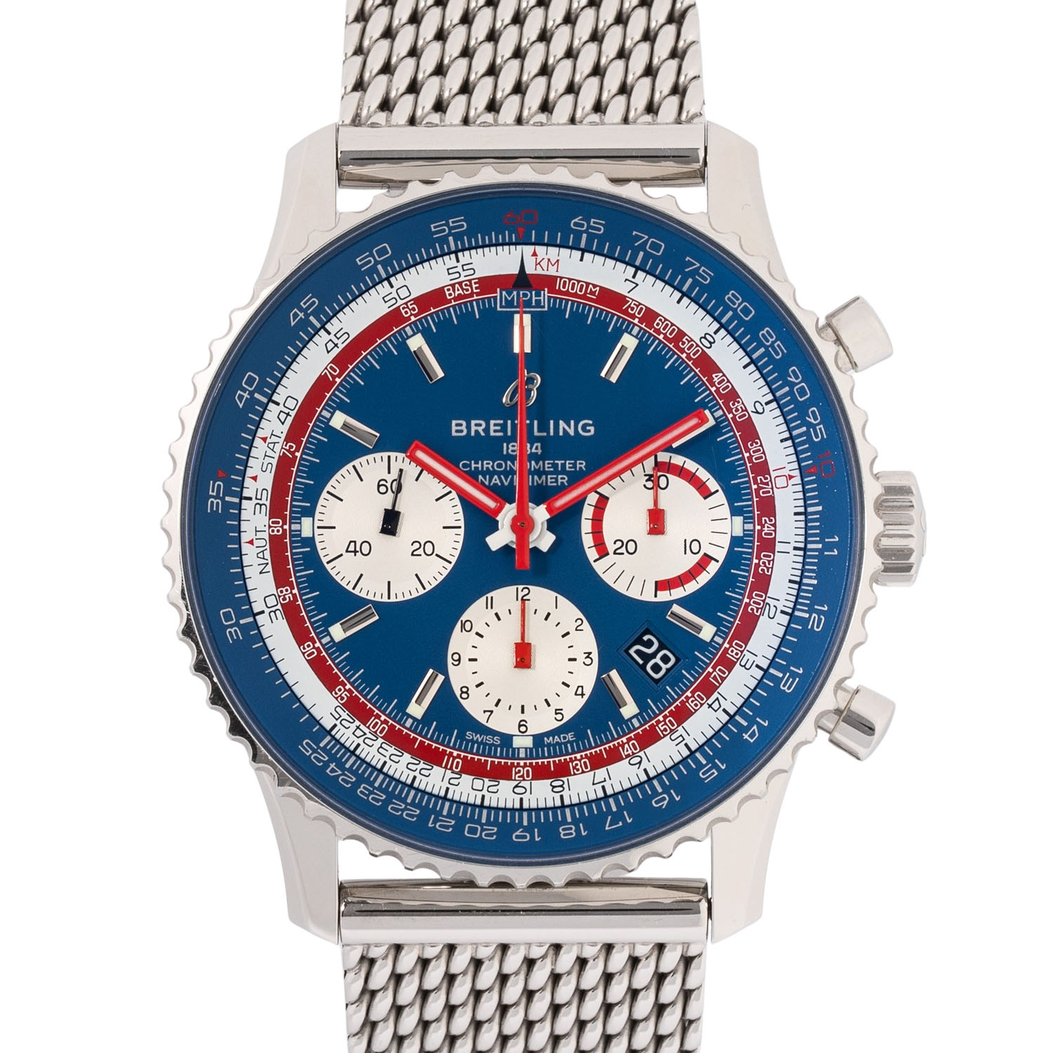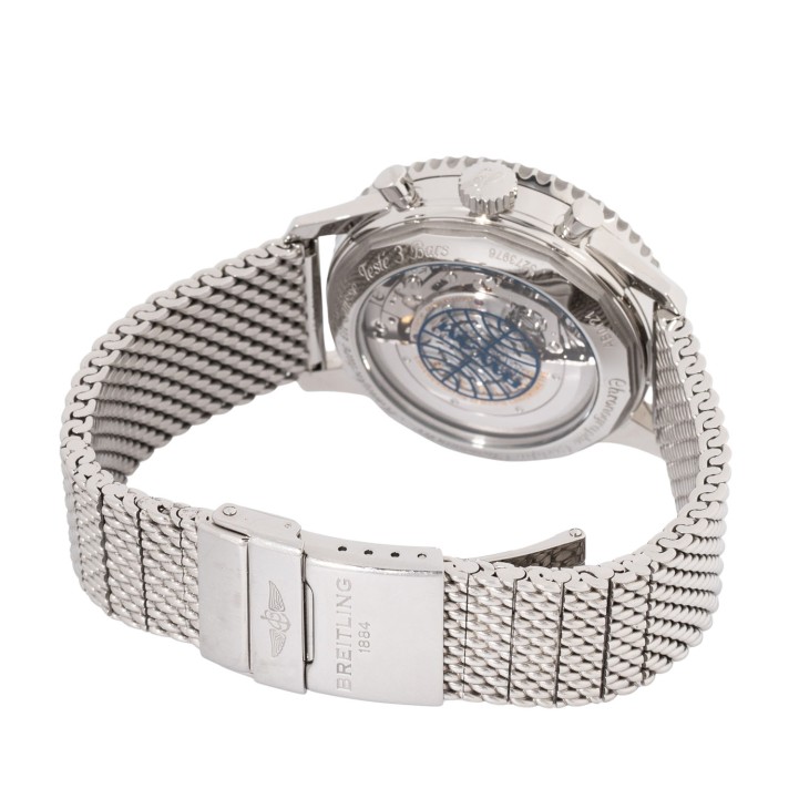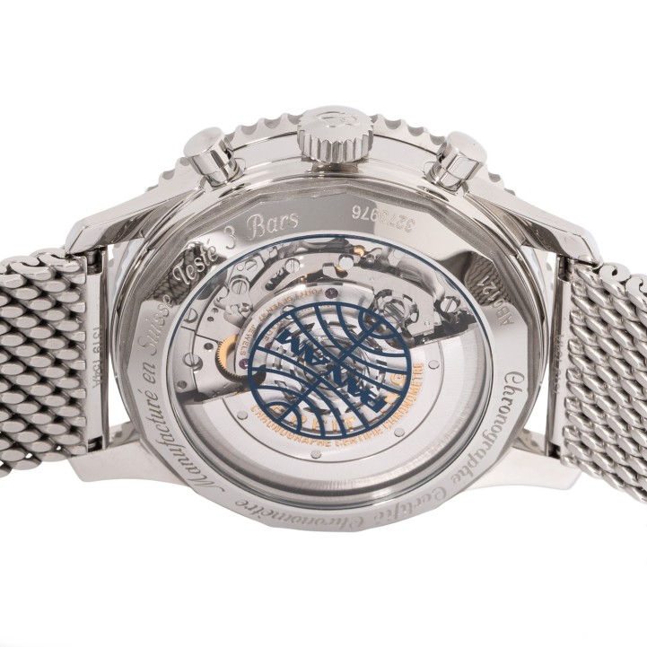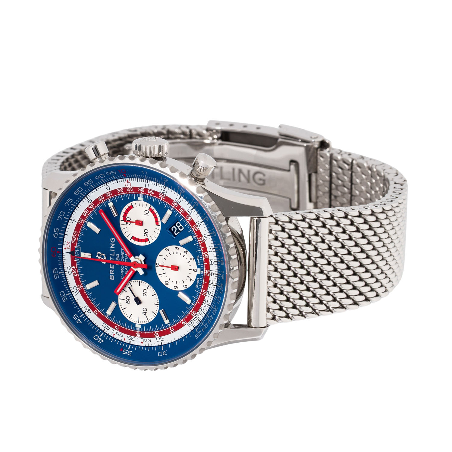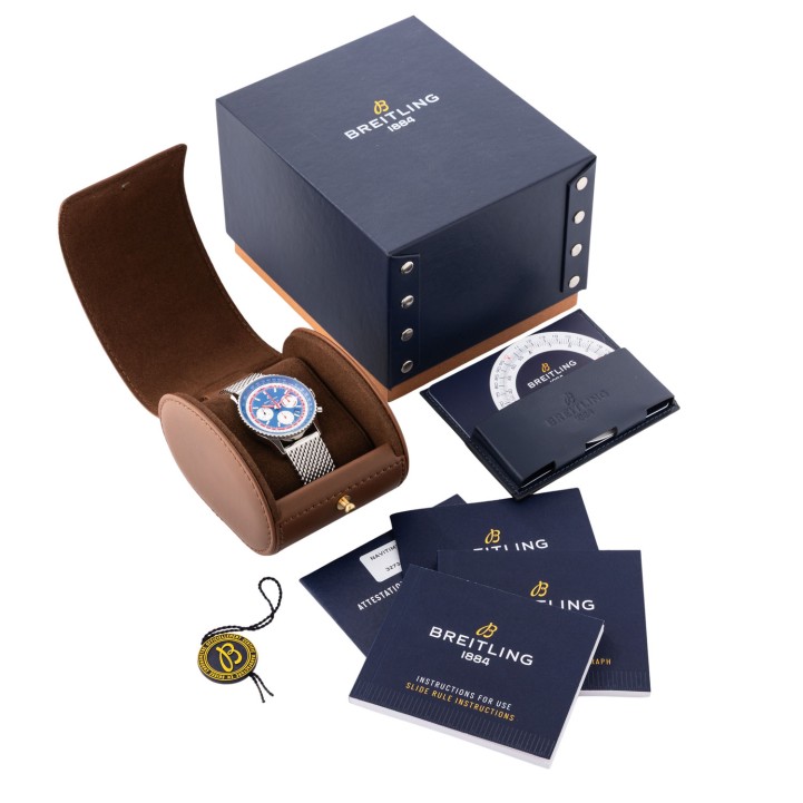 Edelstahl. Glasboden mit Pan Am Logo. Seriennummer 3273976. Automatik-Werk Kal. B01 mit sehr guten Gangwerten (+1 s/d. 304° Amplitude). Blaues Zifferblatt mit aufgesetzten Indizes, 3 Totalisatoren, kleiner Sekunde und Datumsanzeige. Breitling Edelstahl Armband mit Faltschließe. Sehr guter Zustand mit leichten Tragespuren. Original Box, Anleitungen, Hang Tag mit UVP, Rechenschieber, Card Folder, Garantieheft und Chrono Zertifikat anbei. Durchmesser ca. 43 mm (gemessen ohne Krone). Passend bis zu ca. 20 cm Handgelenkumfang.