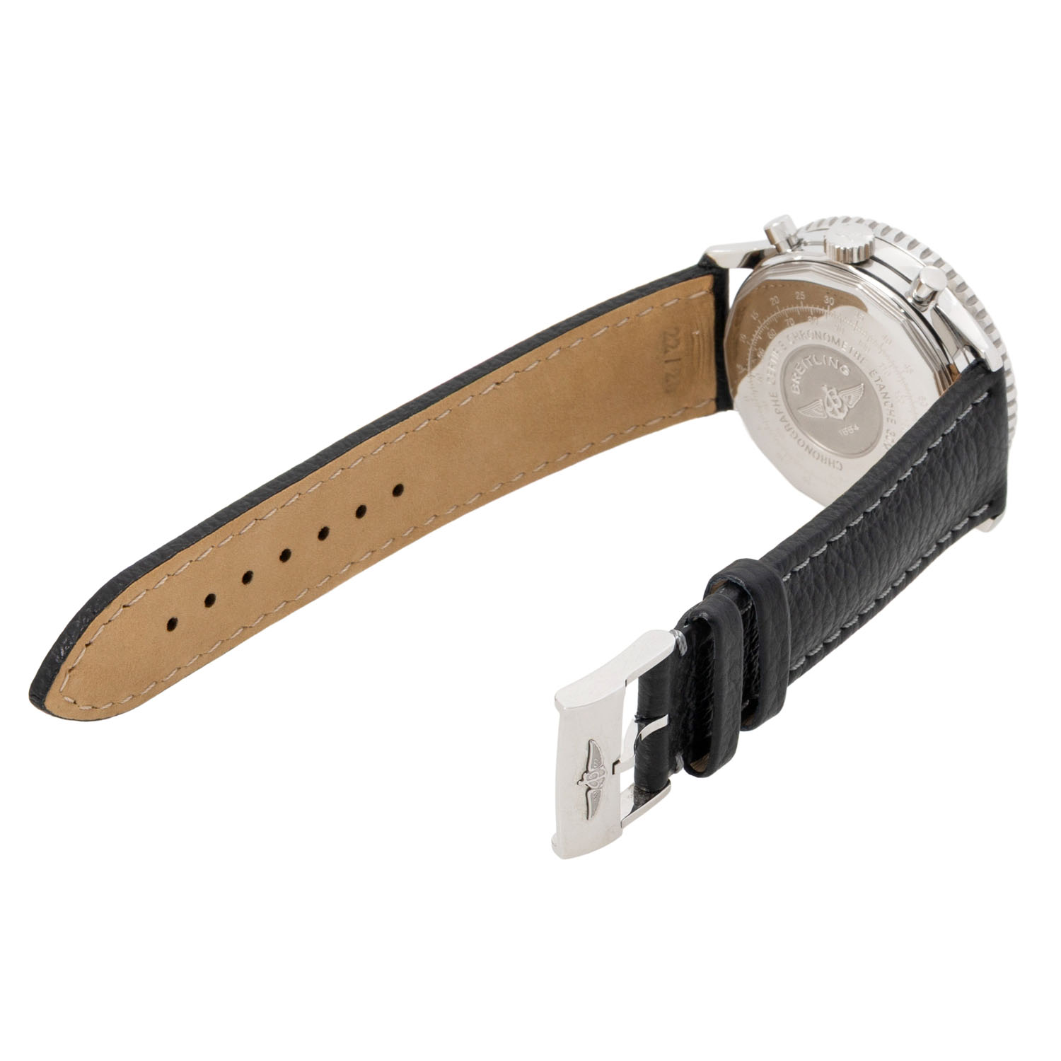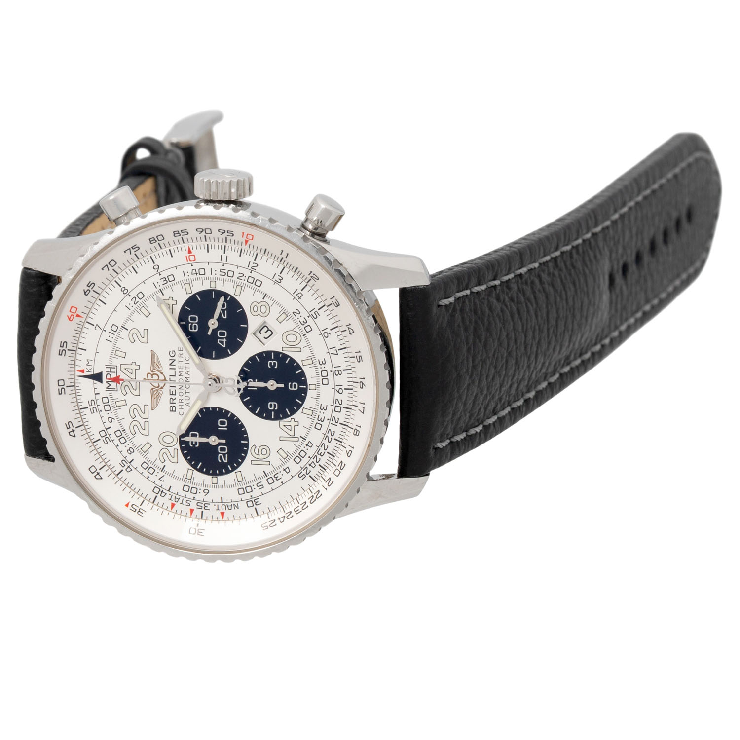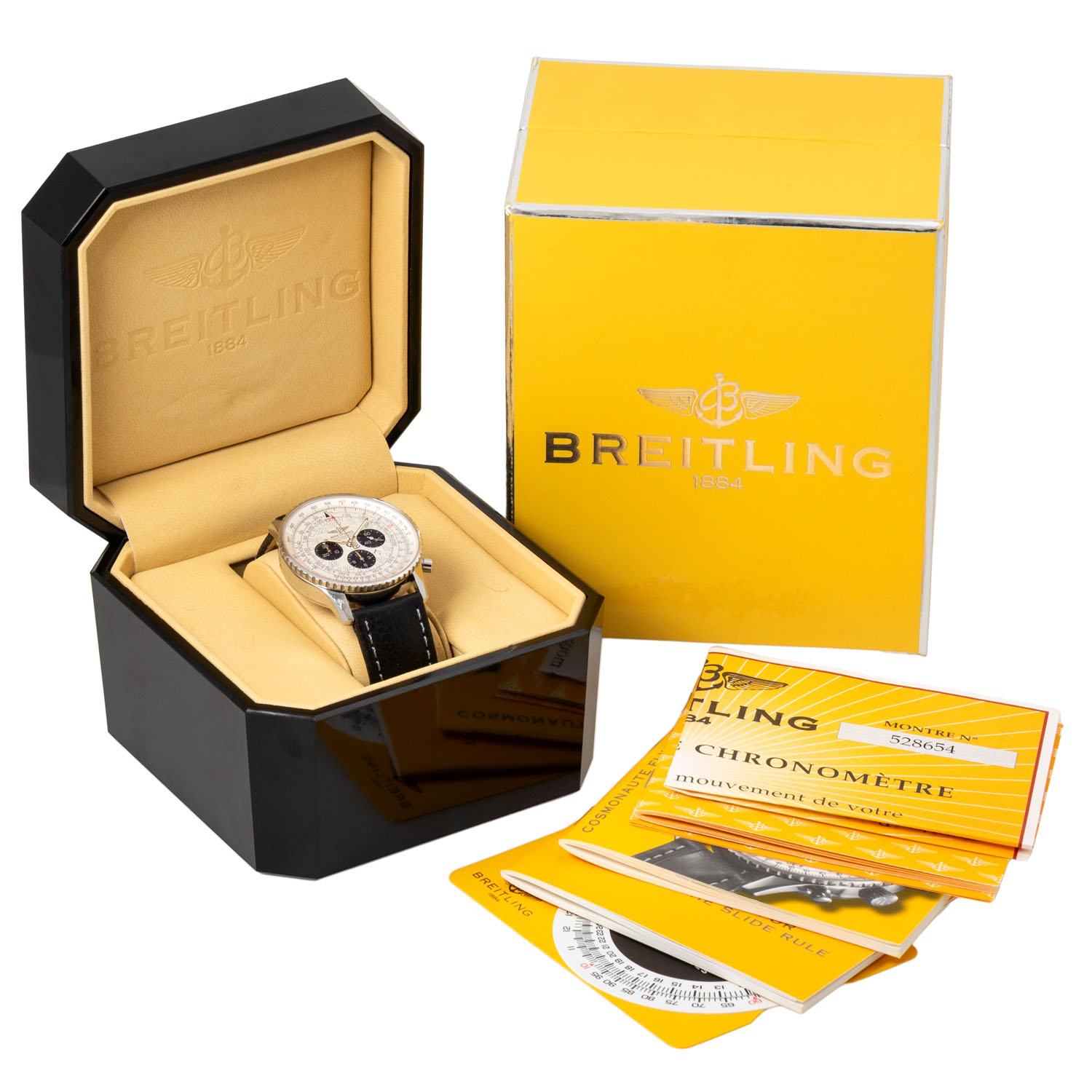Edelstahl mit Rechenschieberlünette, Seriennummer 528XXX. Automatikwerk Kal. 22 auf Basis von ETA Kal. 2892-A2 mit guten Gangwerten (+ 8s/d, 279° Amplitude). Silbernes Zifferblatt mit 24-Stunden-Skala, arabischen Ziffern, drei Hilfszifferblättern, Datumsanzeige und zentraler Stoppsekunde. Neues, schwarzes Lederarmband mit weißen Kontrastnähten und Original Breilting Edelstahl Dornschließe. Gebraucht mit Tragespuren, Kratzer am oberen linken Bandanstoß. Box und Papiere aus 03/2005 und Beleg über Gebrauchtkauf aus 01/2020 anbei. Durchmesser ca. 41 mm gemessen ohne Krone.