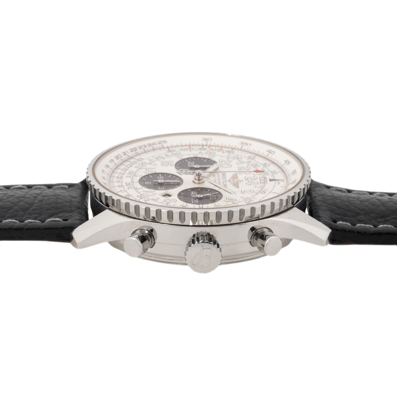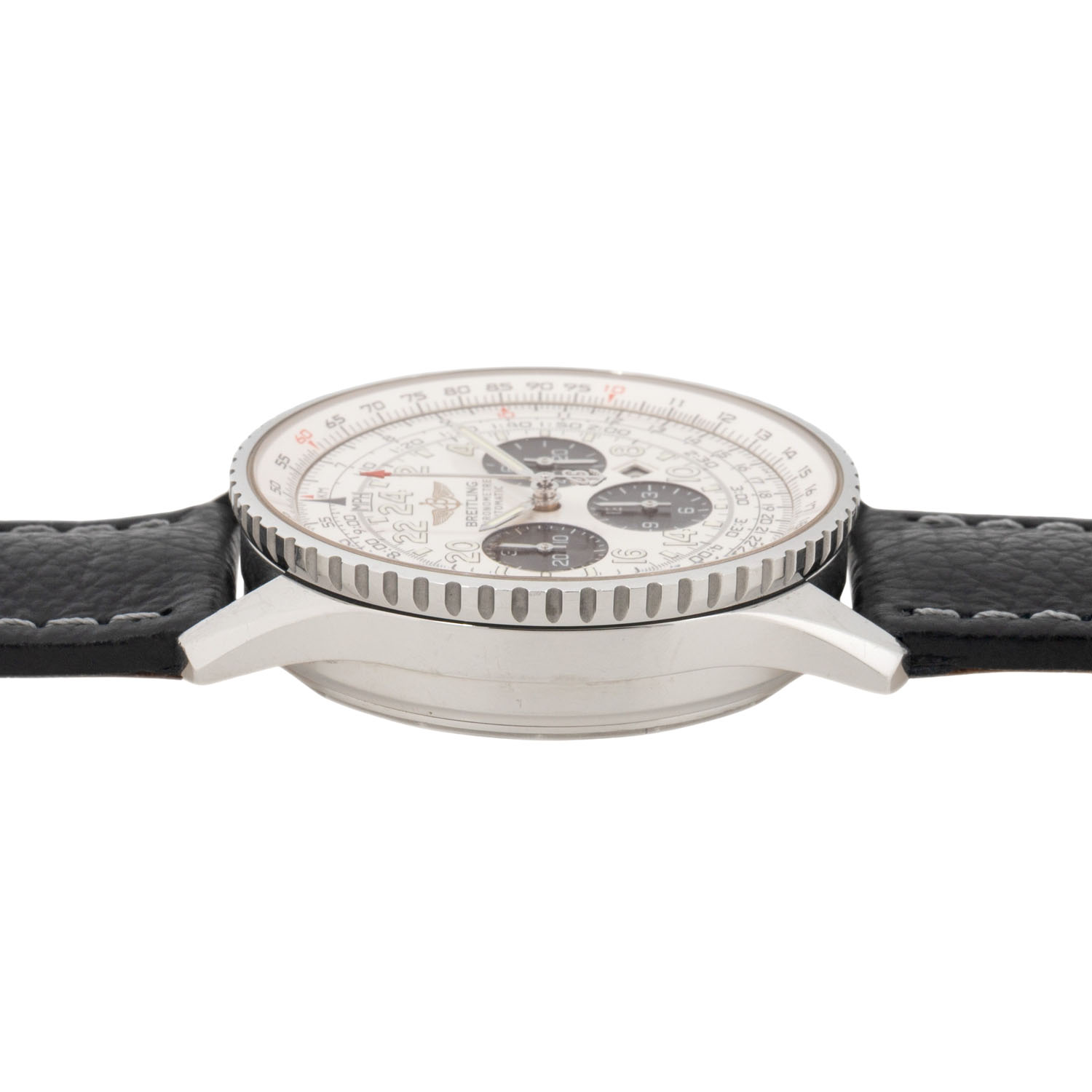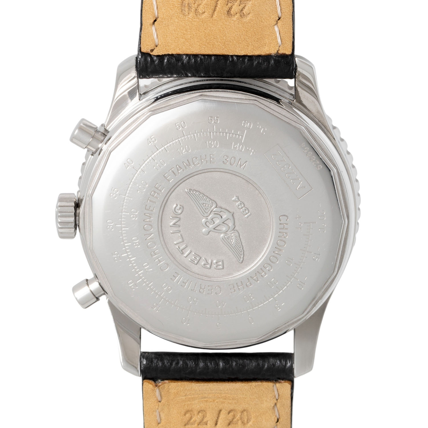 Edelstahl mit Rechenschieberlünette, Seriennummer 528XXX. Automatikwerk Kal. 22 auf Basis von ETA Kal. 2892-A2 mit guten Gangwerten (+ 8s/d, 279° Amplitude). Silbernes Zifferblatt mit 24-Stunden-Skala, arabischen Ziffern, drei Hilfszifferblättern, Datumsanzeige und zentraler Stoppsekunde. Neues, schwarzes Lederarmband mit weißen Kontrastnähten und Original Breilting Edelstahl Dornschließe. Gebraucht mit Tragespuren, Kratzer am oberen linken Bandanstoß. Box und Papiere aus 03/2005 und Beleg über Gebrauchtkauf aus 01/2020 anbei. Durchmesser ca. 41 mm gemessen ohne Krone.