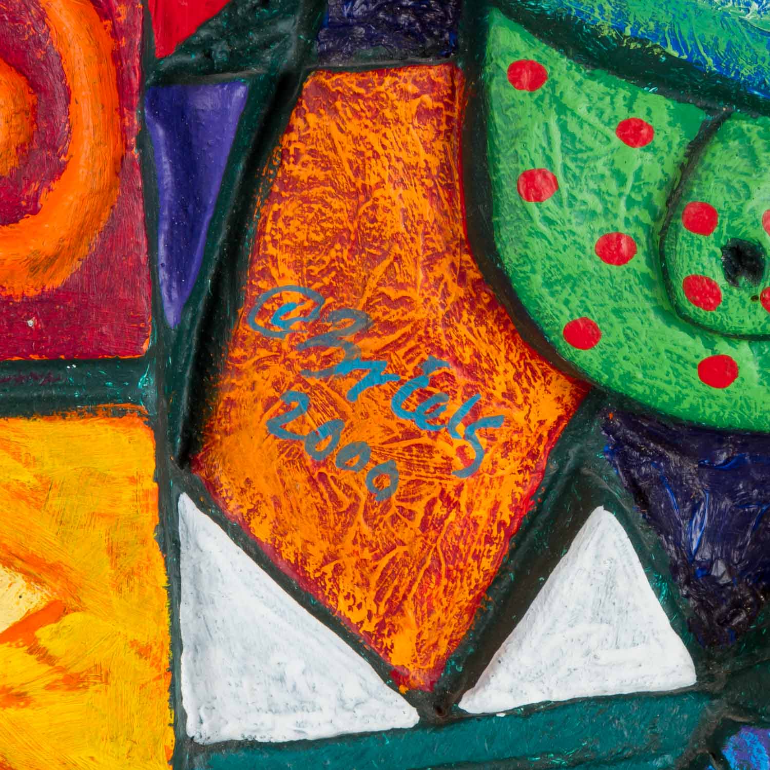 Epoxidharzguss bemalt, u.li. von Hand signiert und datiert, auf der seitlichen Kante betitelt und num. 50/50, HxB: ca, 56x39 cm. Leichte Altersspuren. VERSO anbei Etikett Galerie ARTIPICO, Schiedam/Niederlande.