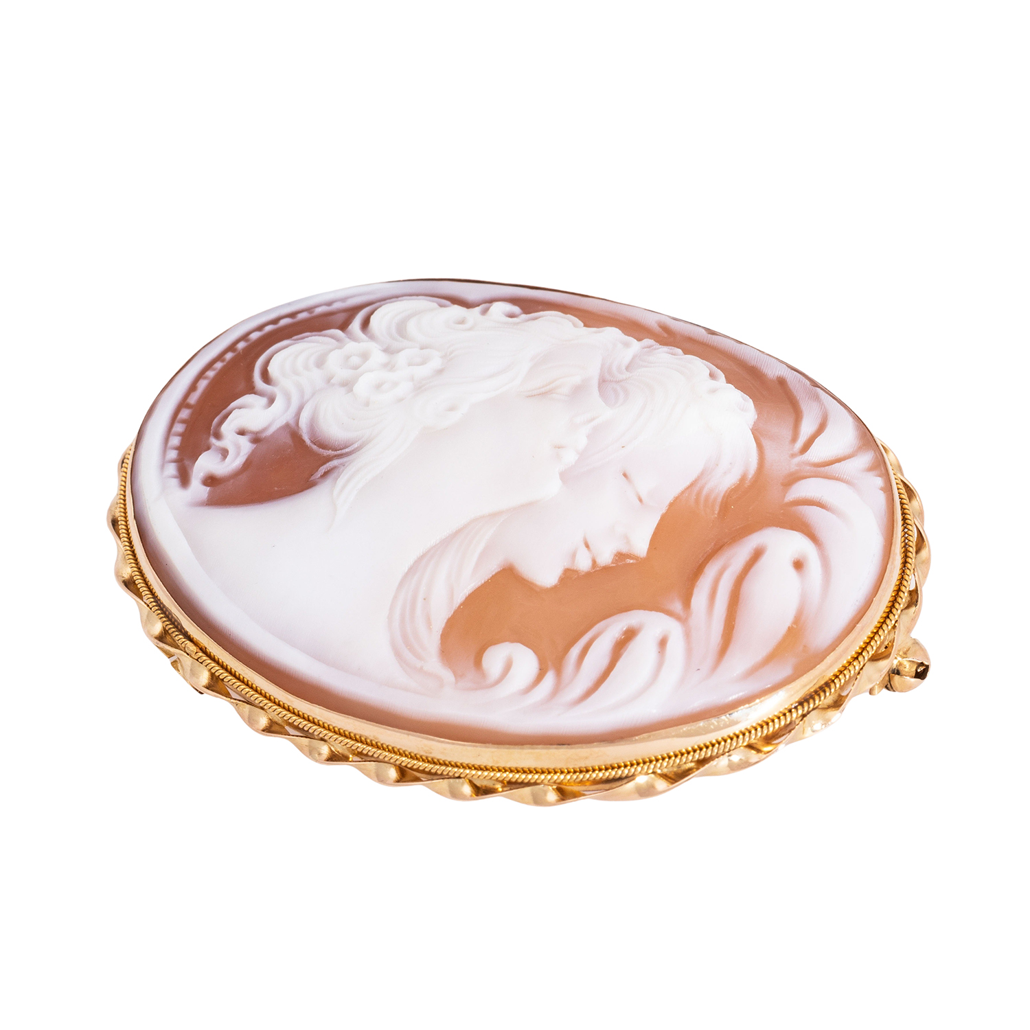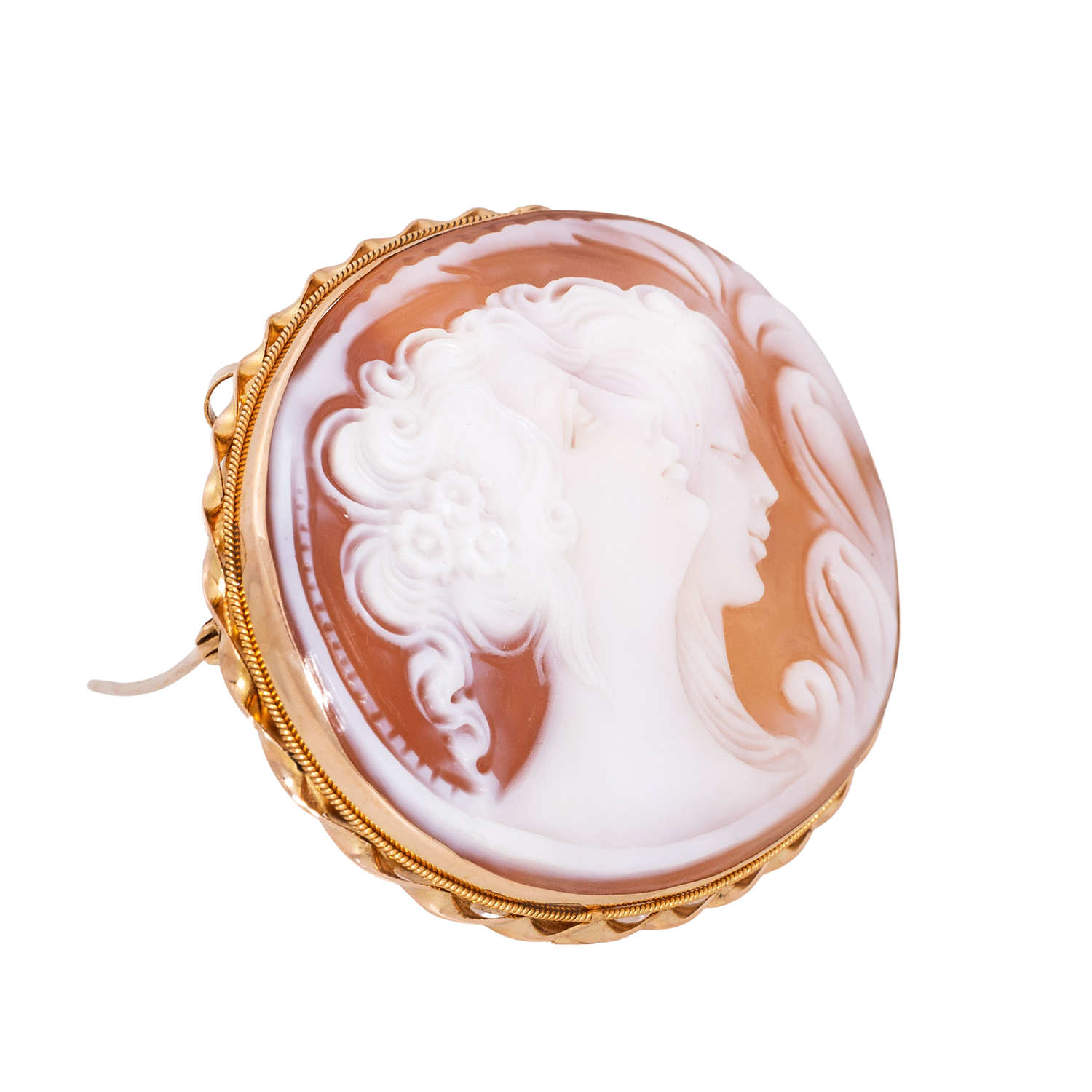 2 Frauenköpfe nach rechs schauend, oval, 50 x 38 mm, GG 14K, 10,6 g, L x B: 53 x 41 mm, Fassung mit cordiertem und tordiertem Rand, Broschierung mit Kugelhaken, 2 Aufhängeösen, Ende 20. Jh., minimale Tragespuren.