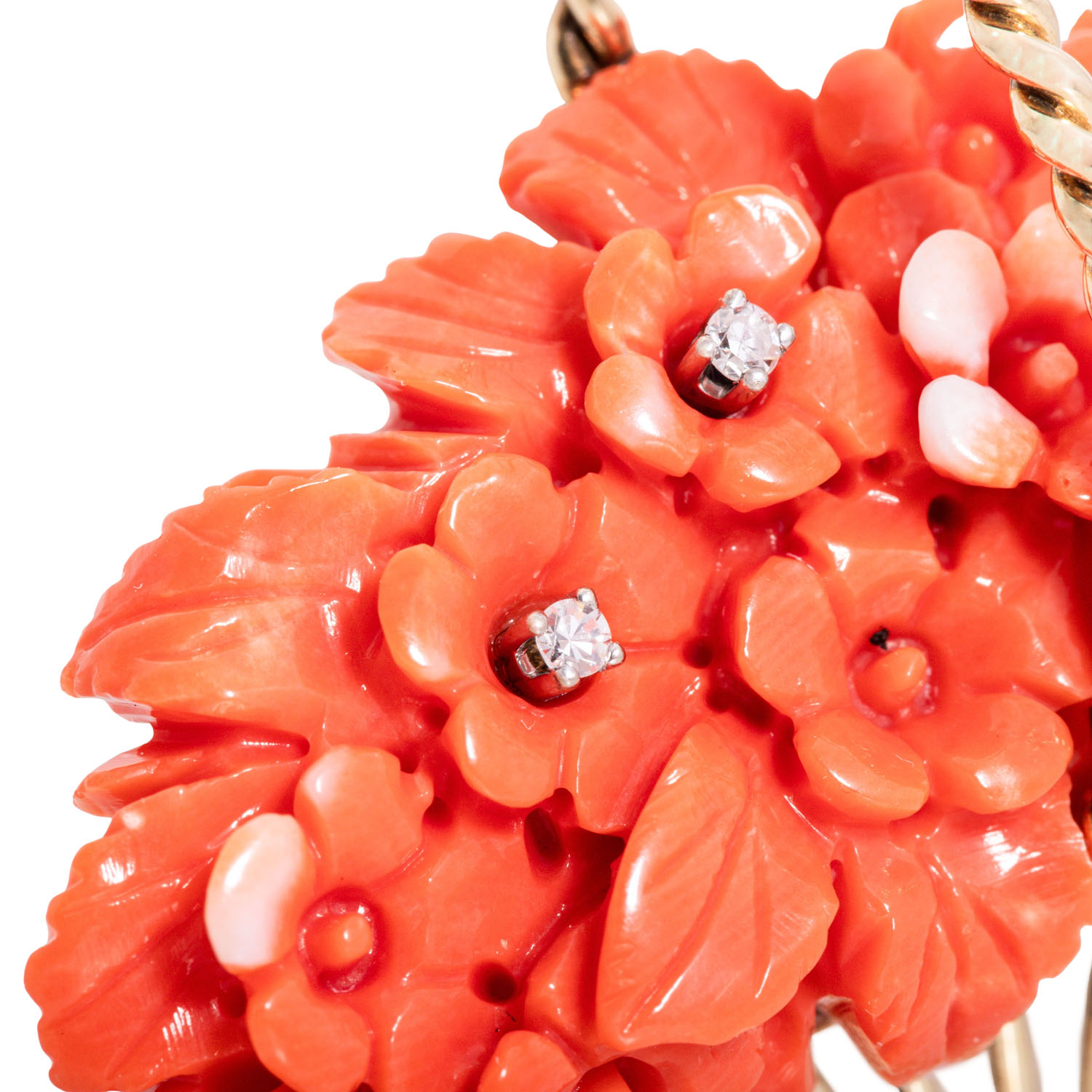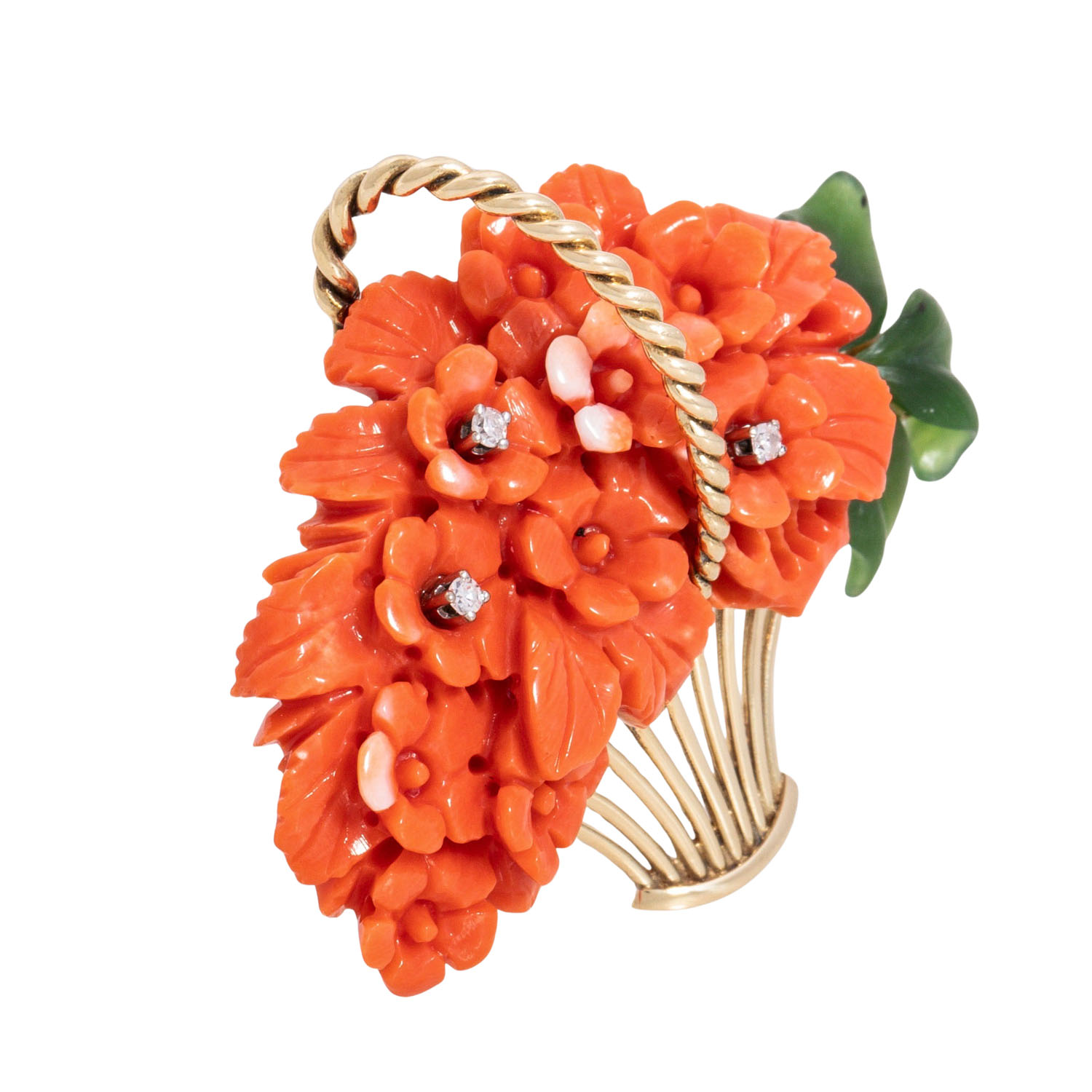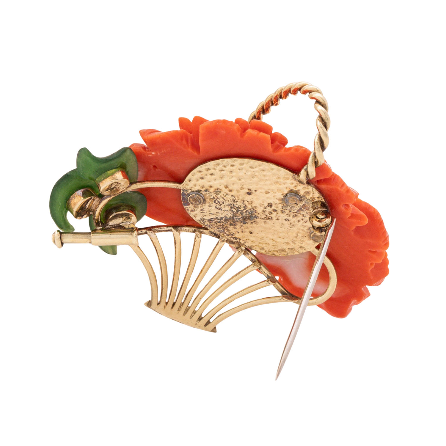 mit gravierter Edelkoralle, Jade und kleinen Diamanten, GG 18K, 14,1 g, ca. 5x4 cm, 2. Hälfte 20. Jh., leichte Tragespuren. IMPORT/EXPORT BESCHRÄNKUNGEN AUSSERHALB DER EU! (4)