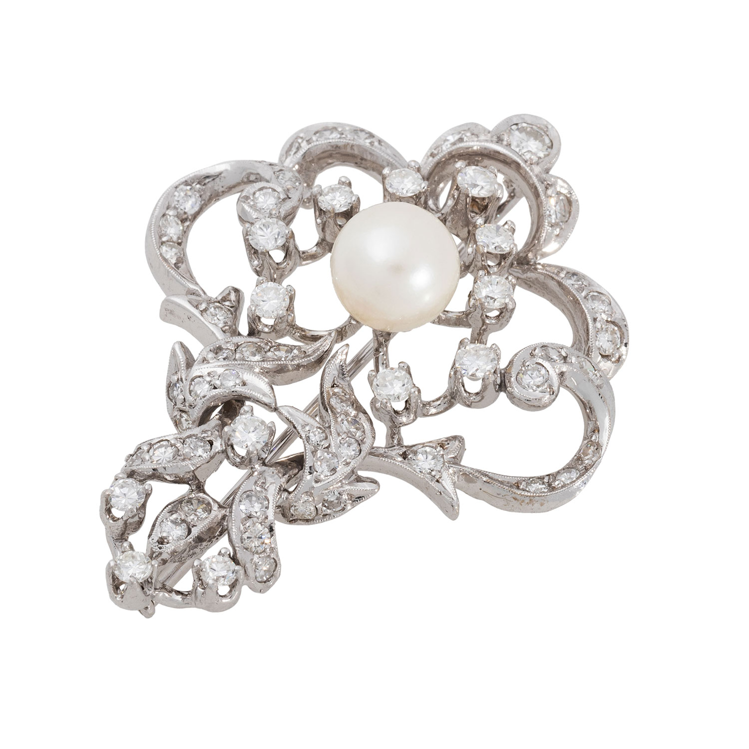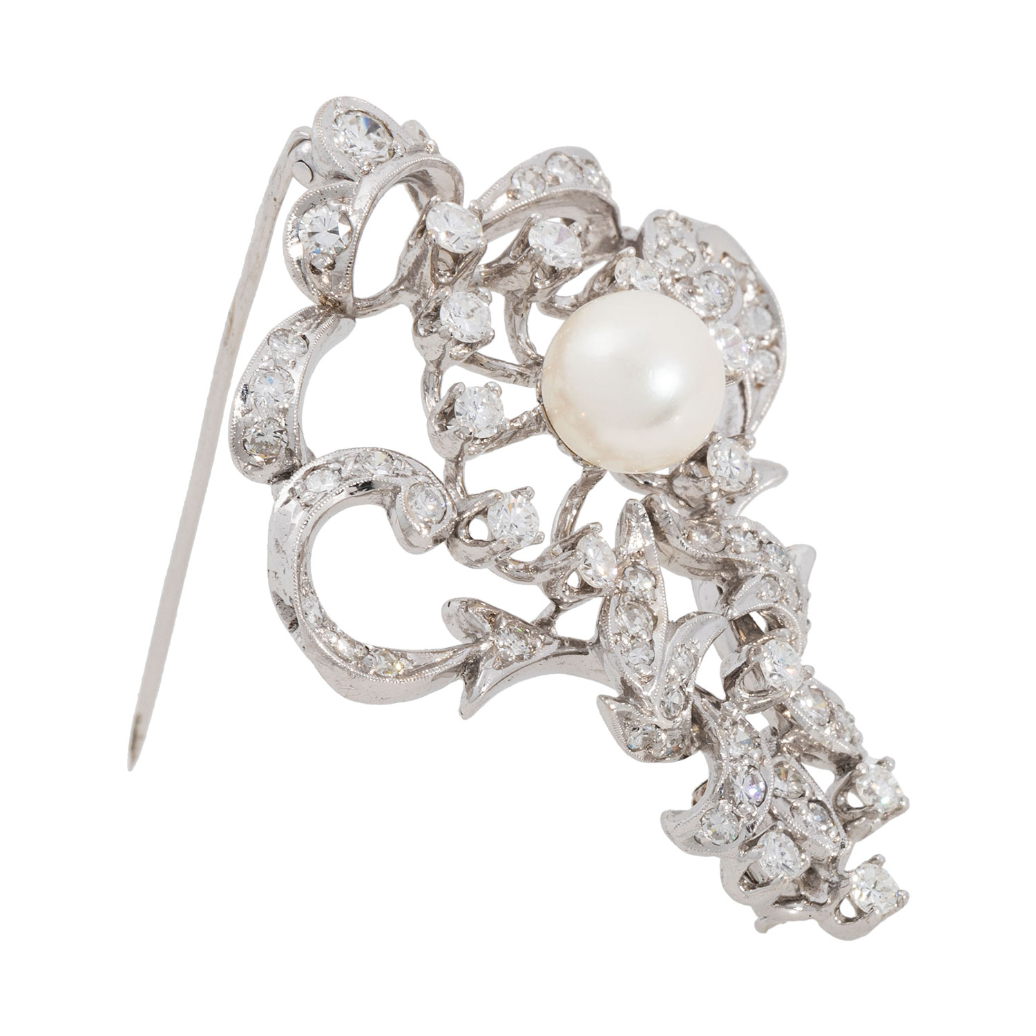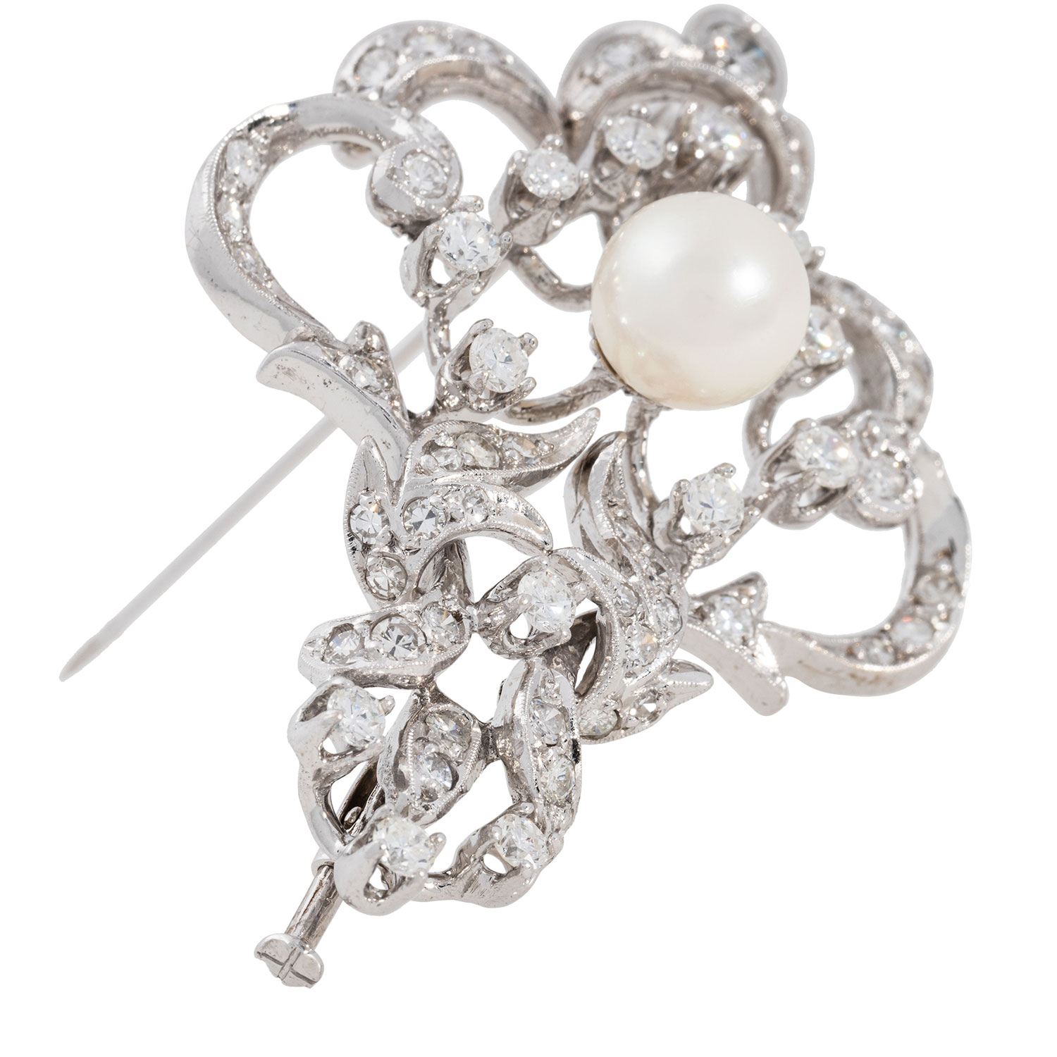 8kant und 16kant, ges. ca. 5 ct, mittlere Farbe und Reinheit, weiße Zuchtperle, D: ca. 9,1 mm, guter Lüster, WG 18K, 19,6 g, L x B: 50 x 39 mm, Schiebesicherung, Ende 20. Jh., minimale Tragespuren.