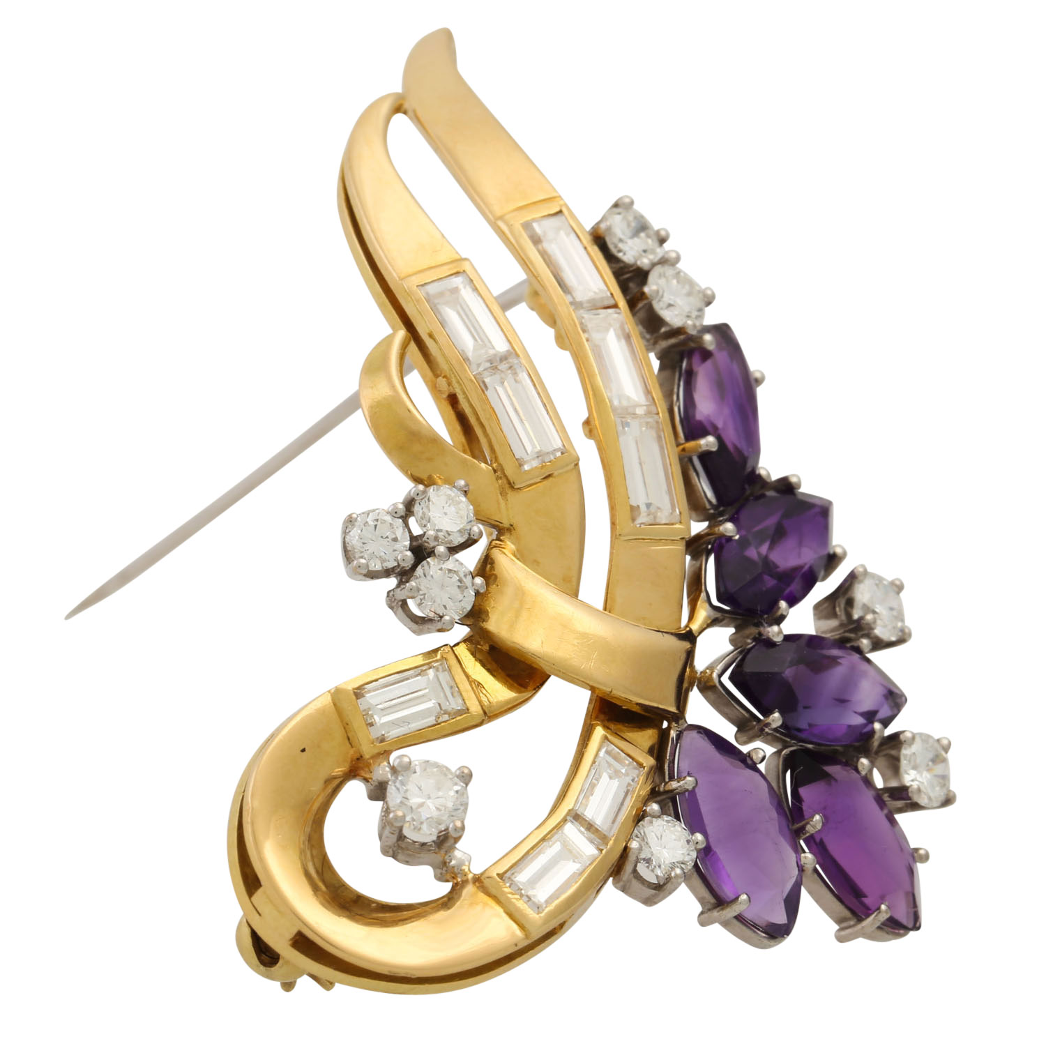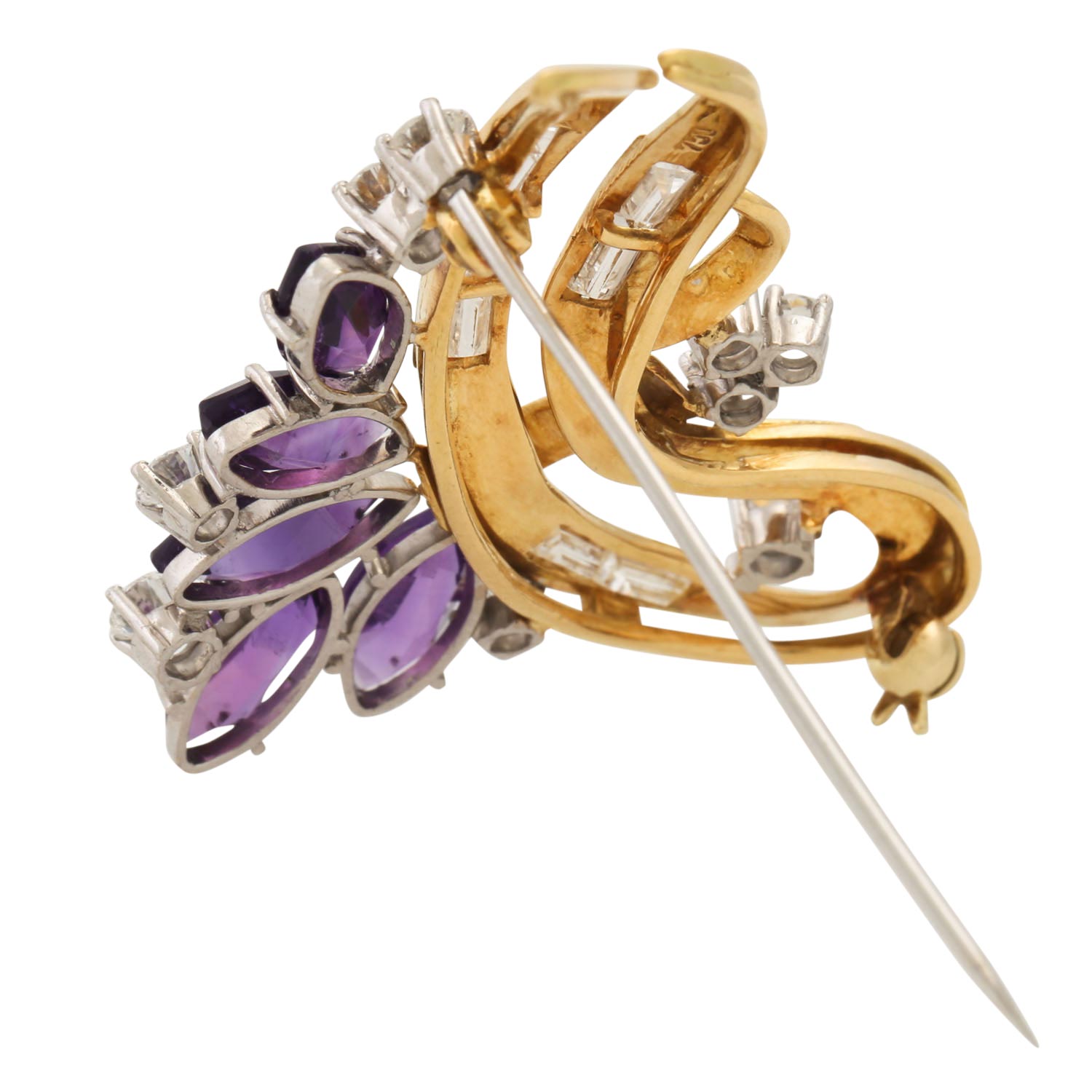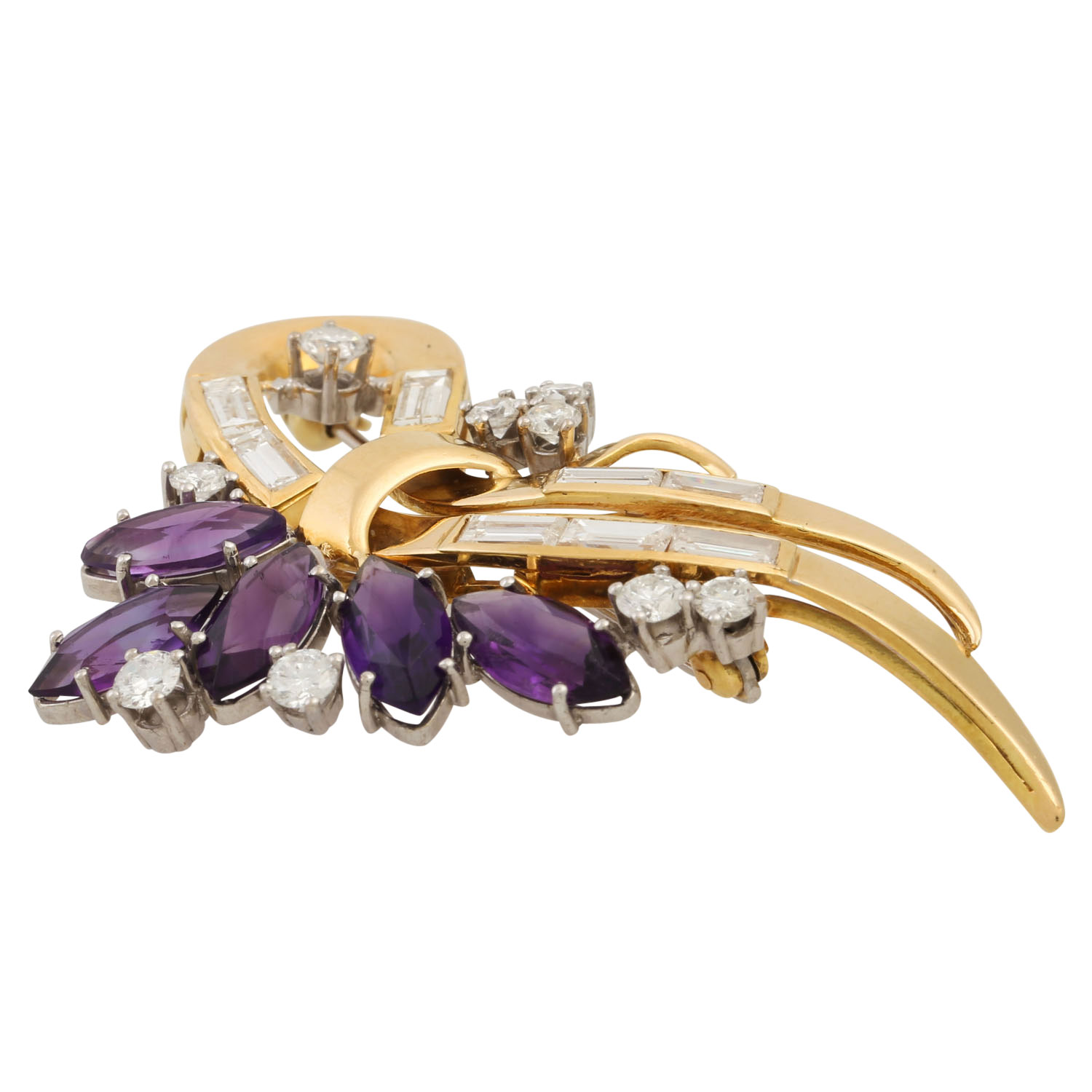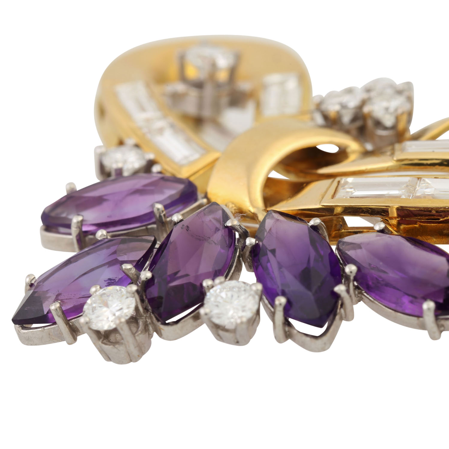 ca. FW-WEISS (G-H)/VS-SI davon 8 im Baguetteschliff und 9 Brillanten, 5 feine Amethyste im Navetteschliff, GG/WG 18K, 12,1 g, 5,5x3,5 cm, 2. H. 20. Jh., guter Erhalt, schöne Juweliersqualität in Handarbeit! (2.5)