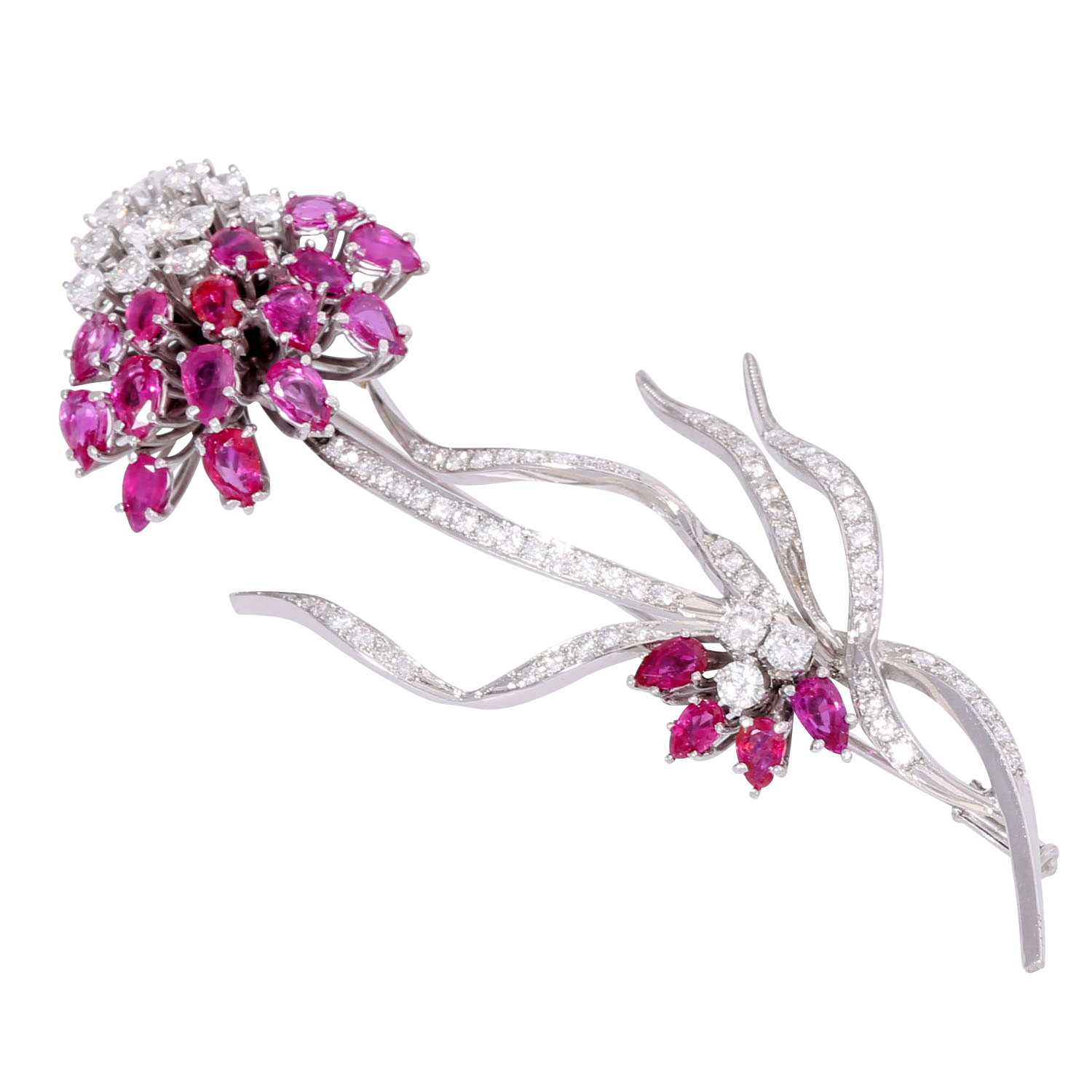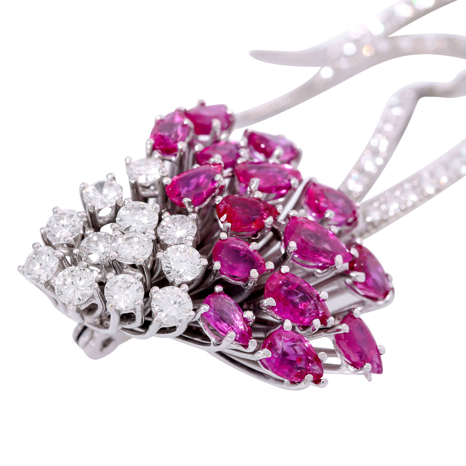 Diamanten im Brillant- und Achtkantschliff von zus. ca. 1,85 ct, ca. LGW (I-J)/VVS-VS, Rubine im Tropfenschliff zus. ca. 3,7 ct, WG 14K, 18,4 g, L.: ca. 8 cm, 1970er Jahre, leichte Tragespuren, Rubine teilweise minimal bestoßen, Handarbeit.