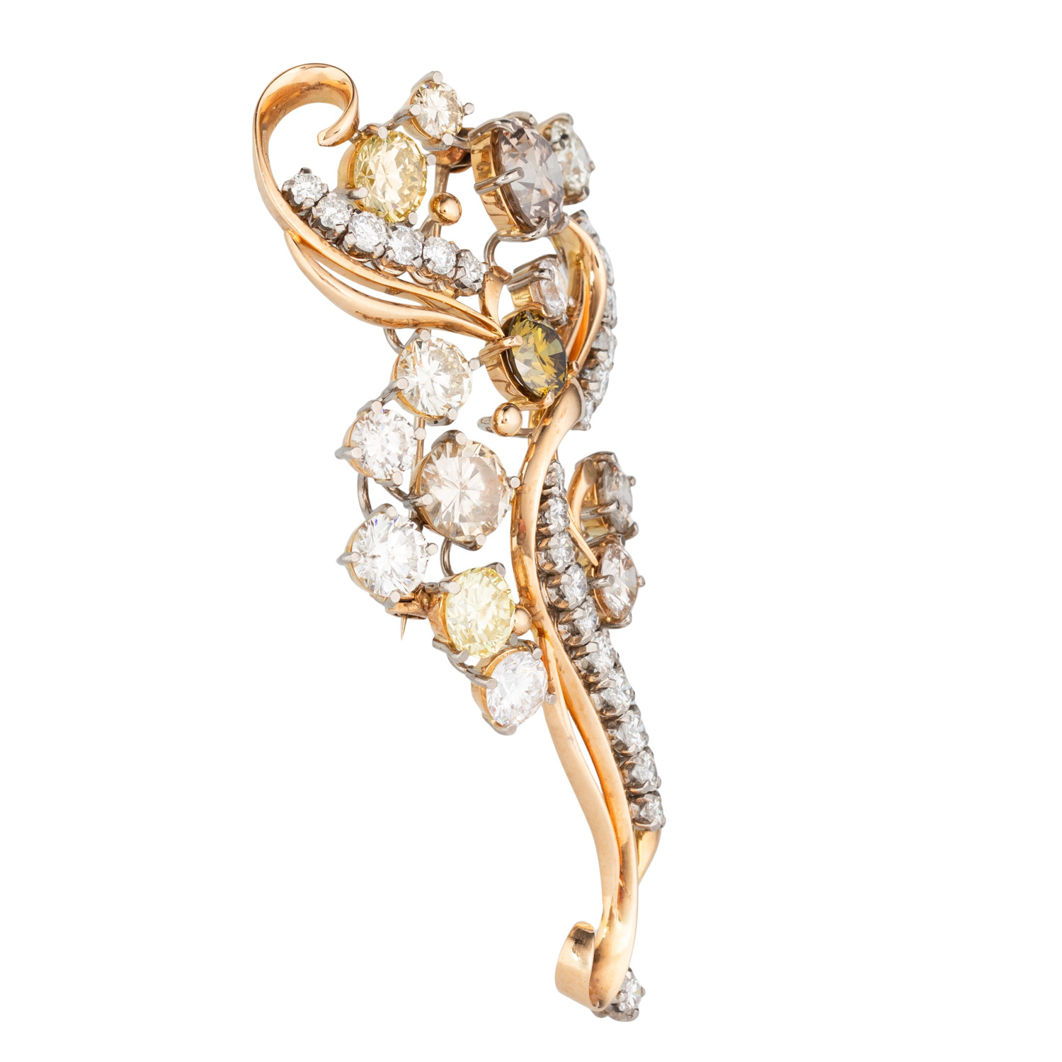 davon 14 größere Brillanten zusammen 10,72 ct, großteils fantasiefarben (gelblich bis gelb, champagnerfarben bis braun und oliv), VVS bis P1, größter Diamant 2,65 ct, fancy braun/SI und 23 farblose Brillanten zusammen 1,82 ct, gute bis sehr gute Farbe und Reinheit, GG/WG 18K, 19,1 g, ca. 70 x 40 mm, mit Kopie des Kaufbelegs (1965) und Kopie Zertifikat mit Auflistung der einzelnen Diamanten und Wertgutachtens über ca. 45.000 DM (1981), entspricht einer heutigen Kaufkraft von ca. 60.000 €.