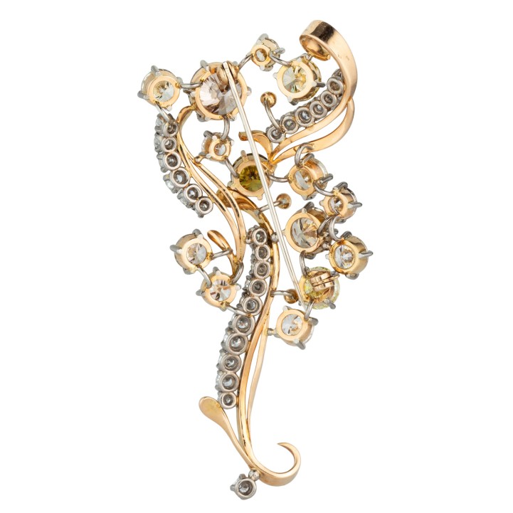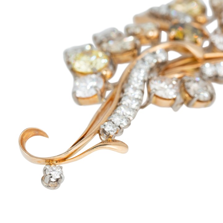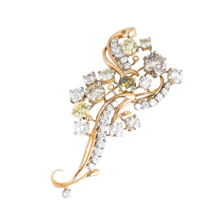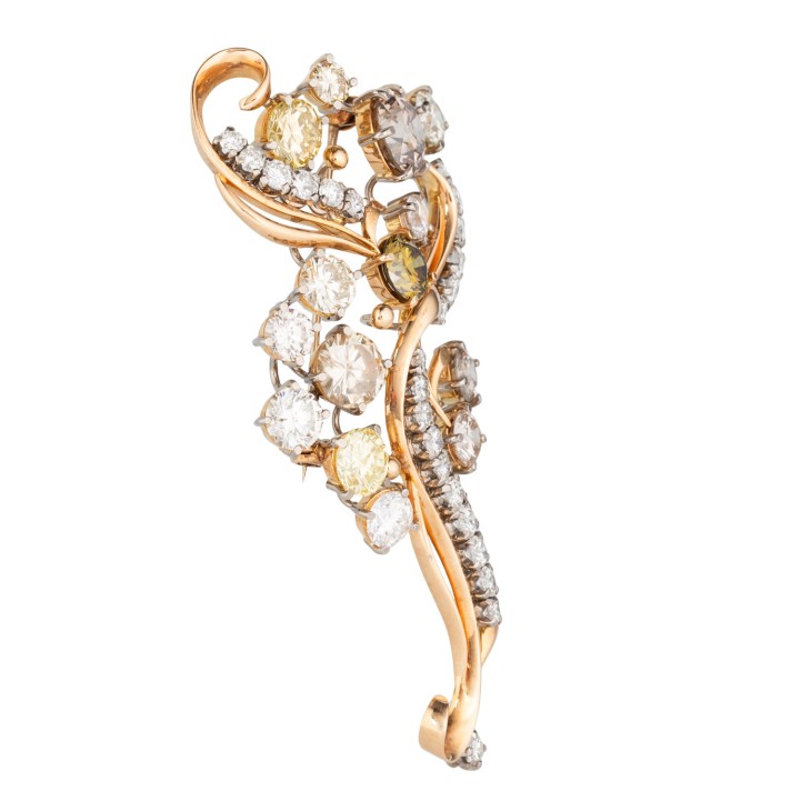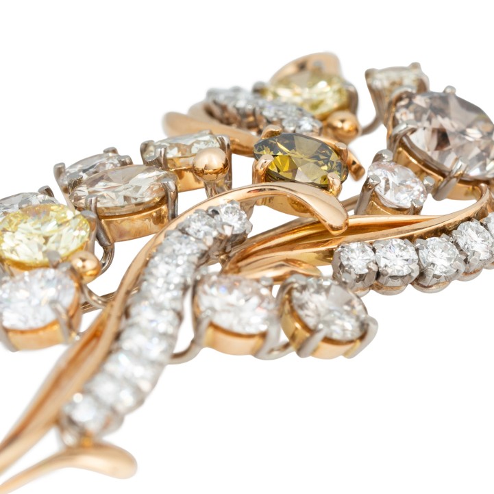 davon 14 größere Brillanten zusammen 10,72 ct, großteils fantasiefarben (gelblich bis gelb, champagnerfarben bis braun und oliv), VVS bis P1, größter Diamant 2,65 ct, fancy braun/SI und 23 farblose Brillanten zusammen 1,82 ct, gute bis sehr gute Farbe und Reinheit, GG/WG 18K, 19,1 g, ca. 70 x 40 mm, mit Kopie des Kaufbelegs (1965) und Kopie Zertifikat mit Auflistung der einzelnen Diamanten und Wertgutachtens über ca. 45.000 DM (1981), entspricht einer heutigen Kaufkraft von ca. 60.000 €.