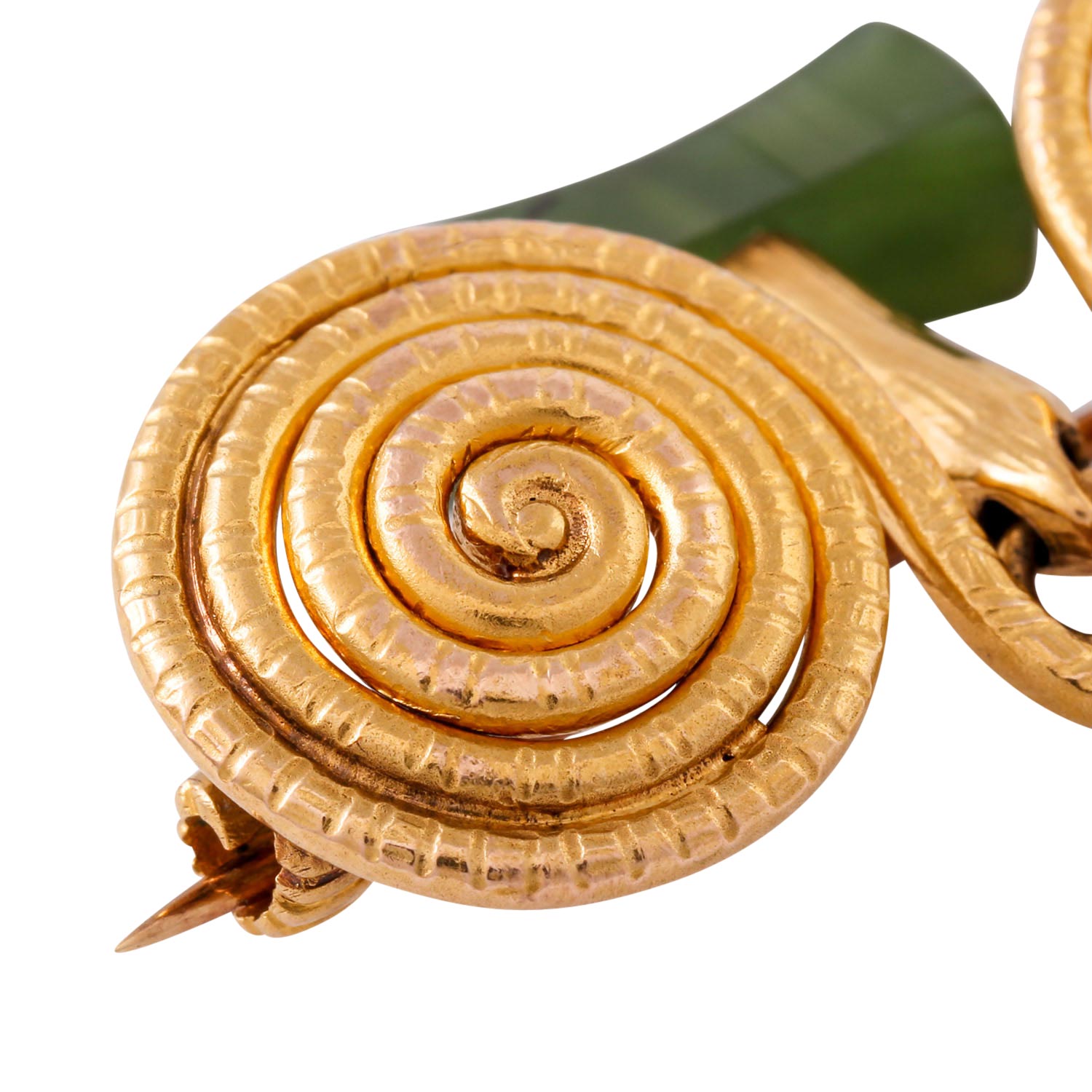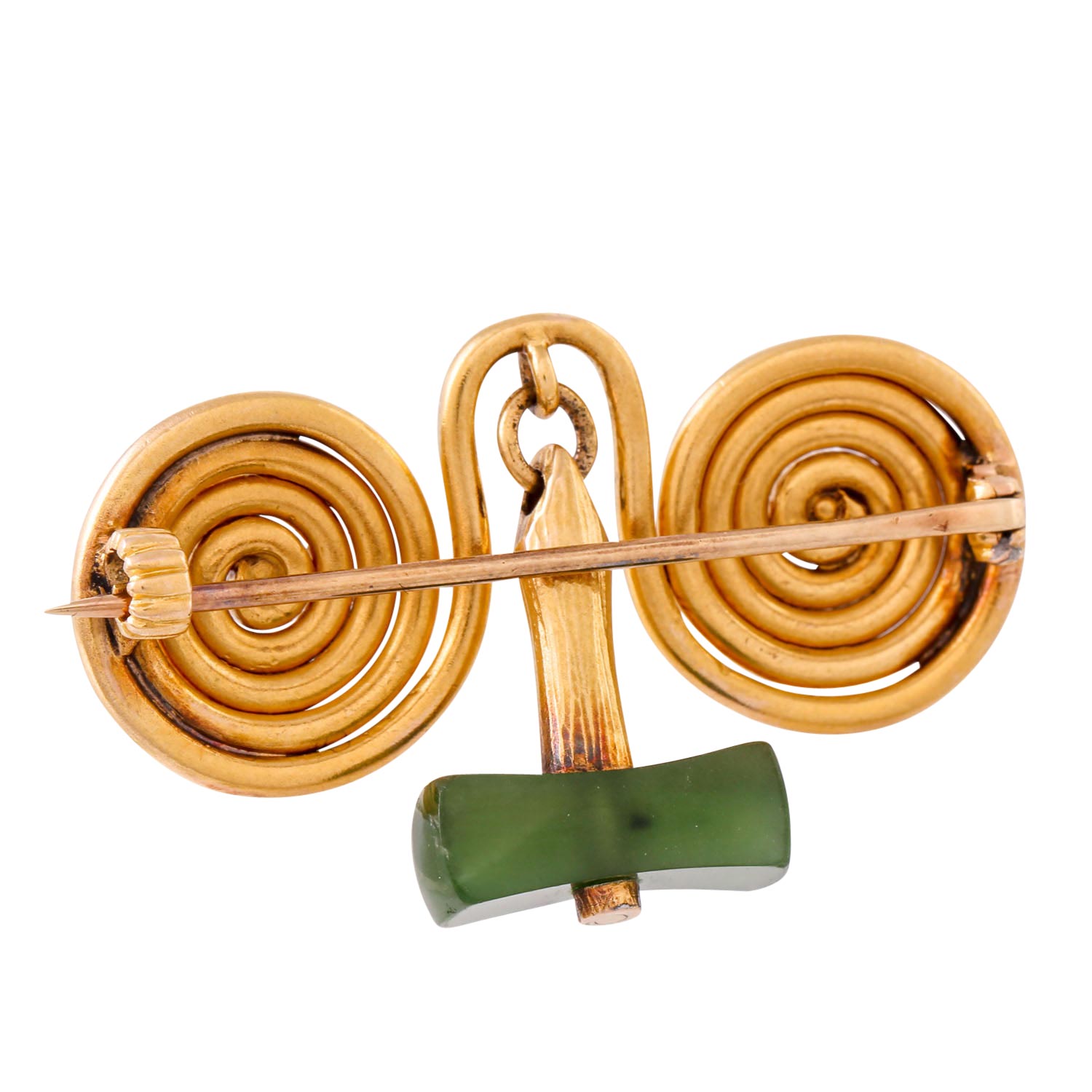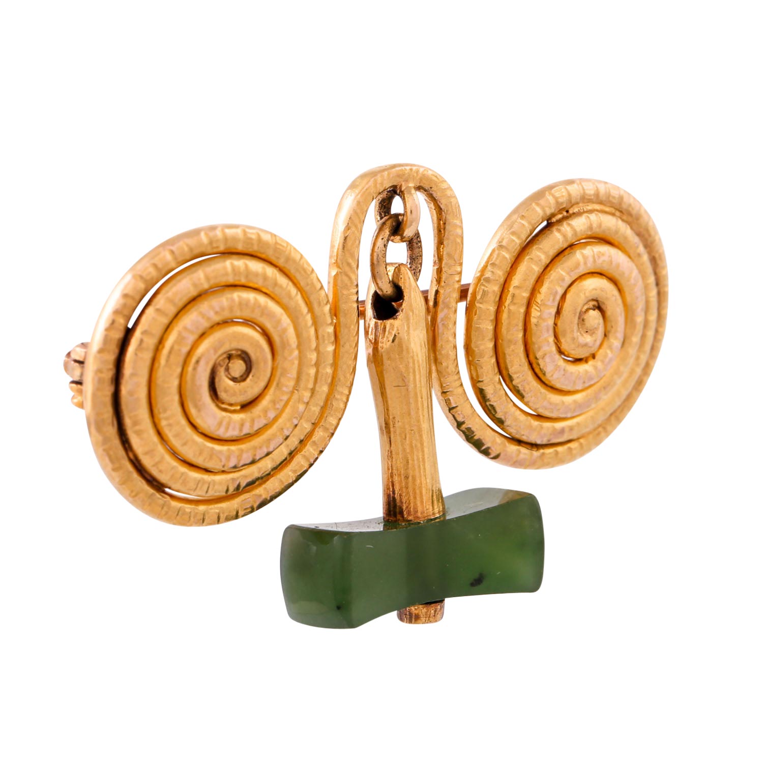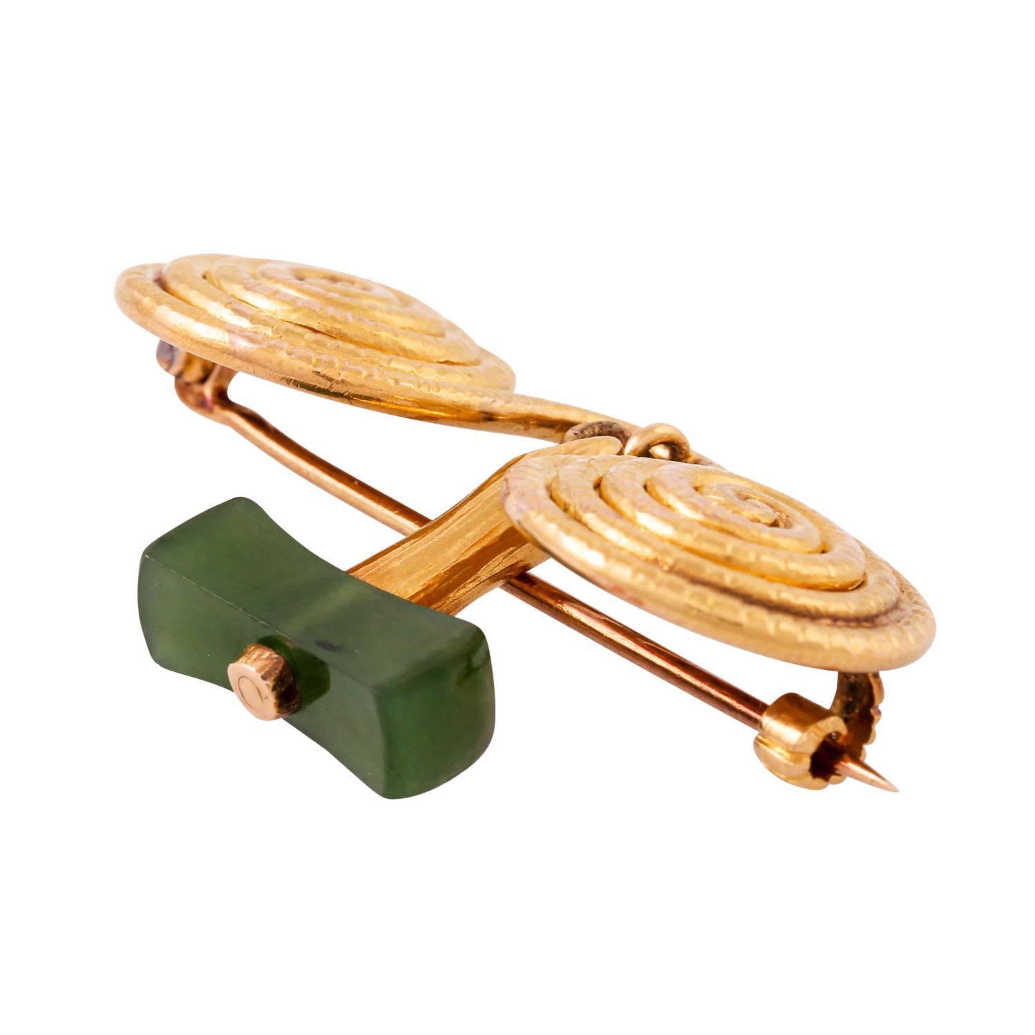 Brooch with jade, 18K yellow gold, 9.7 g, 3.7x2.4 cm, design based on Celtic fibulae, 20th century, good condition.