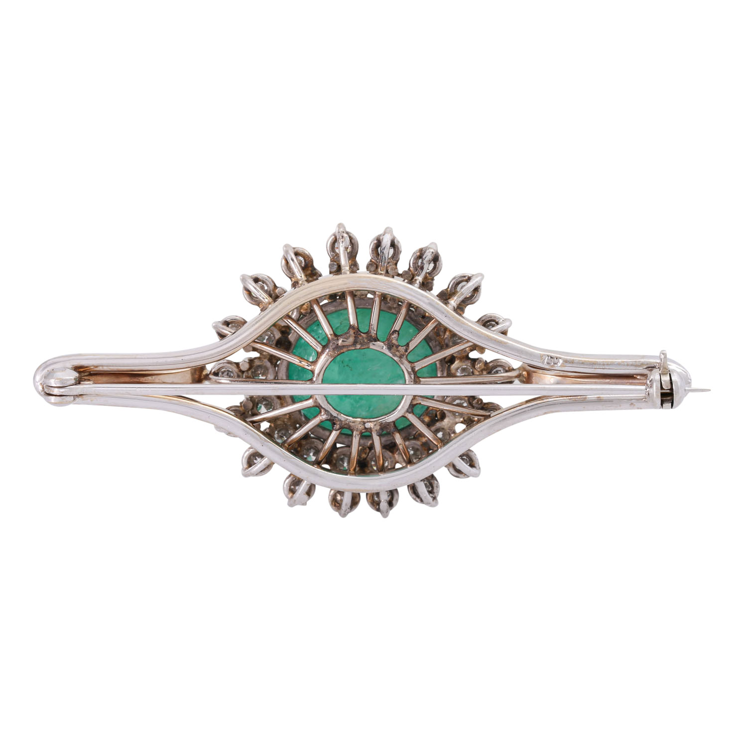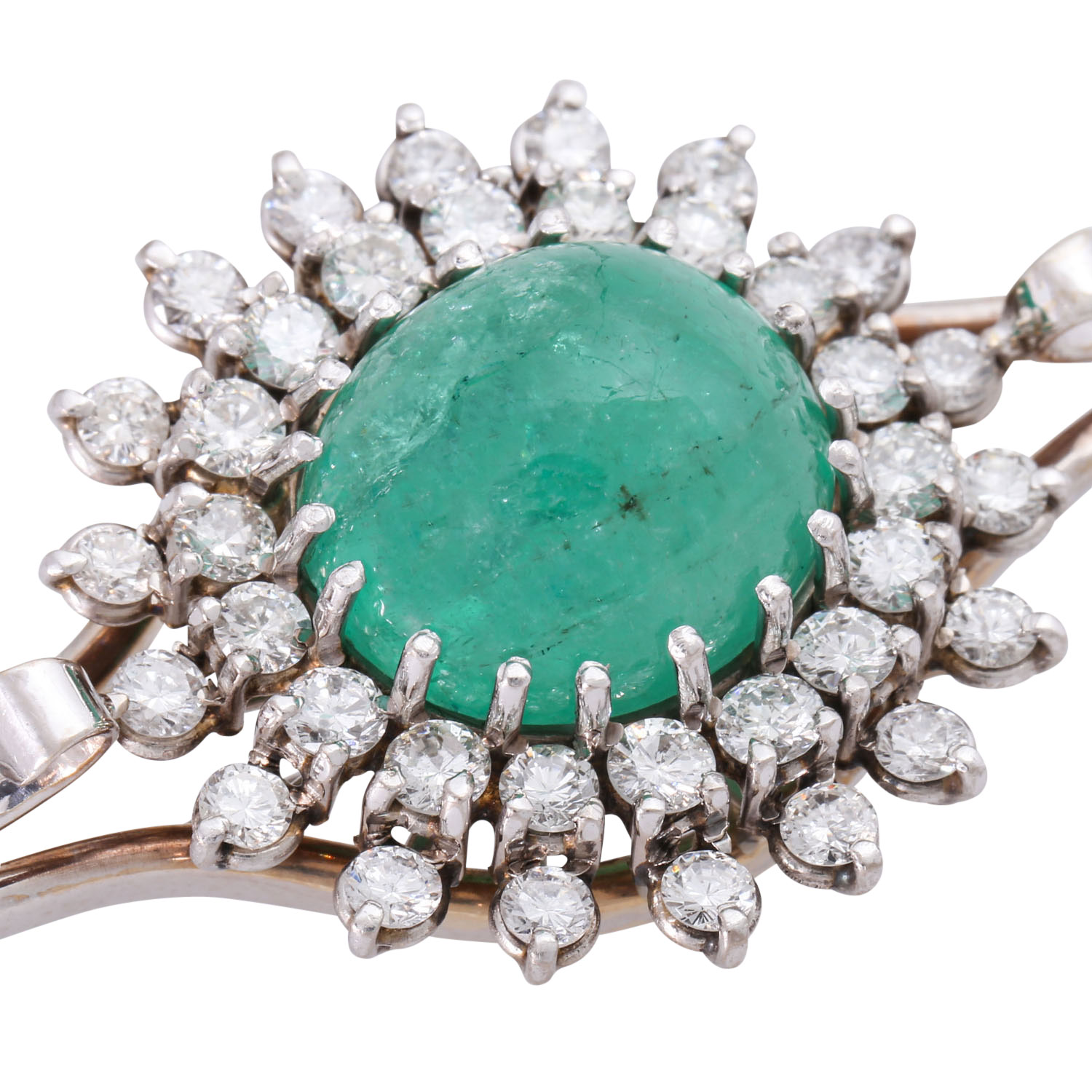 und Brillanten zus. ca. 1,8 ct, mittlere Farbe u. Reinheit, Smaragd transluzent, WG 18K, 15,7 gr, L: ca. 5,5 cm, 1960er/70er Jahre, leichte Tragespuren. Umarbeitung eines Rings mit Versicherungswert von umger. ca. 10.000 € (1971). (9)