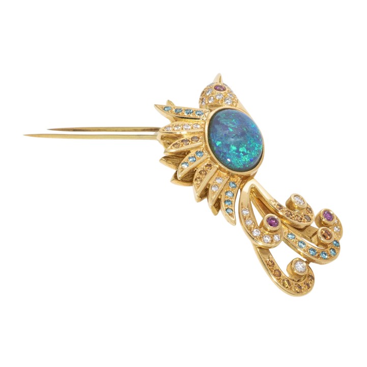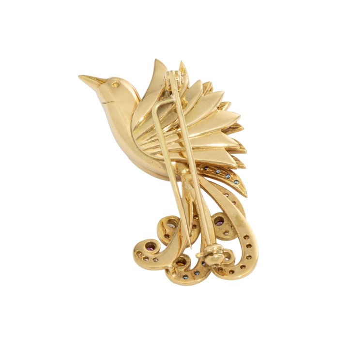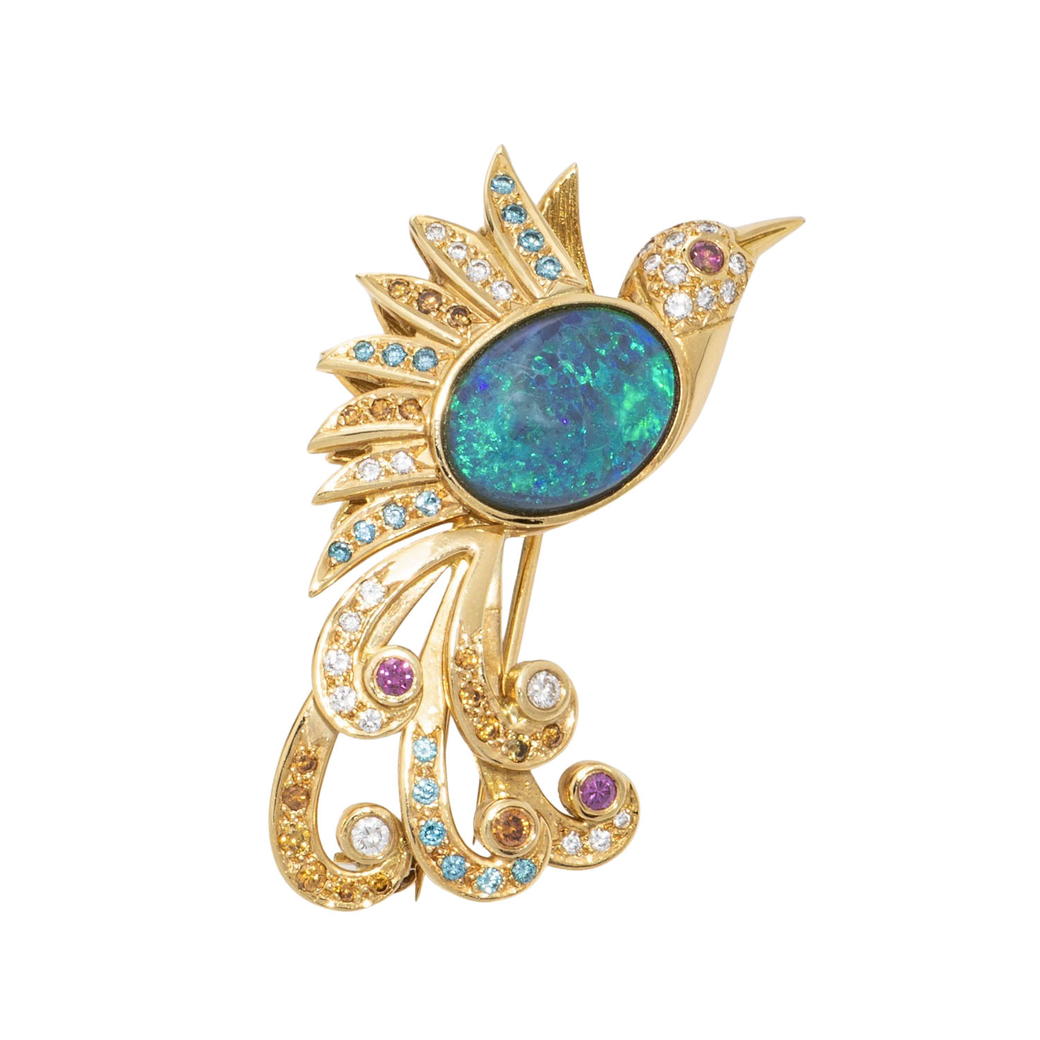 und Brillanten zus. ca. 0,5 ct, gute Farbe und Reinheit, z.T. Fancy: pink, blau, orange behandelt, GG 18K, 16,2 g, 4x2 cm, Ende 20. Jh., min. Tragespuren, hochwertige Verarbeitung.