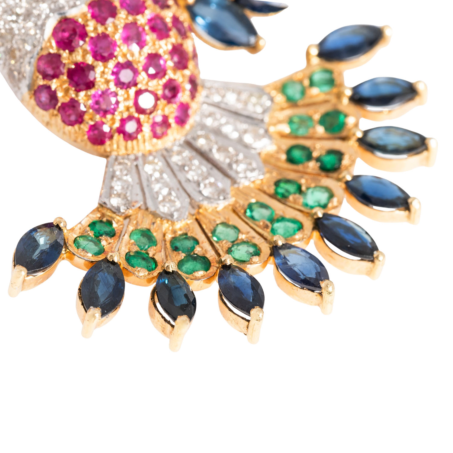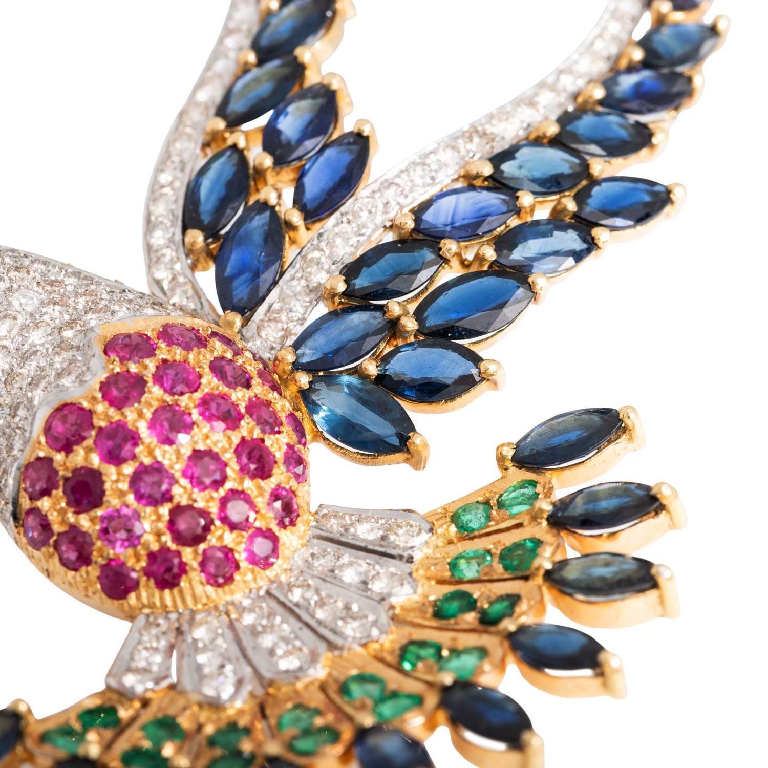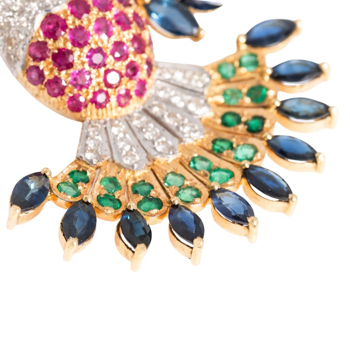 von zus. ca. 3,5 ct, 1 Diam. Briolett ca. 0,15 ct, GW /SI, Saphiren zus. ca. 9,5 ct, 27 Smaragden zus. ca. 1,2 ct und 30 Rubinen, zus. ca. 1,6 ct, GG/WG 18K, 33,3 g, RW: 57, guter Zustand.