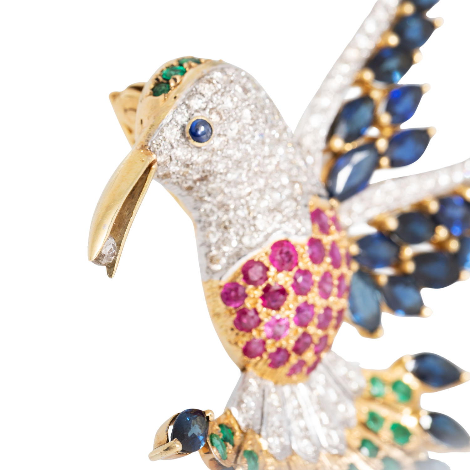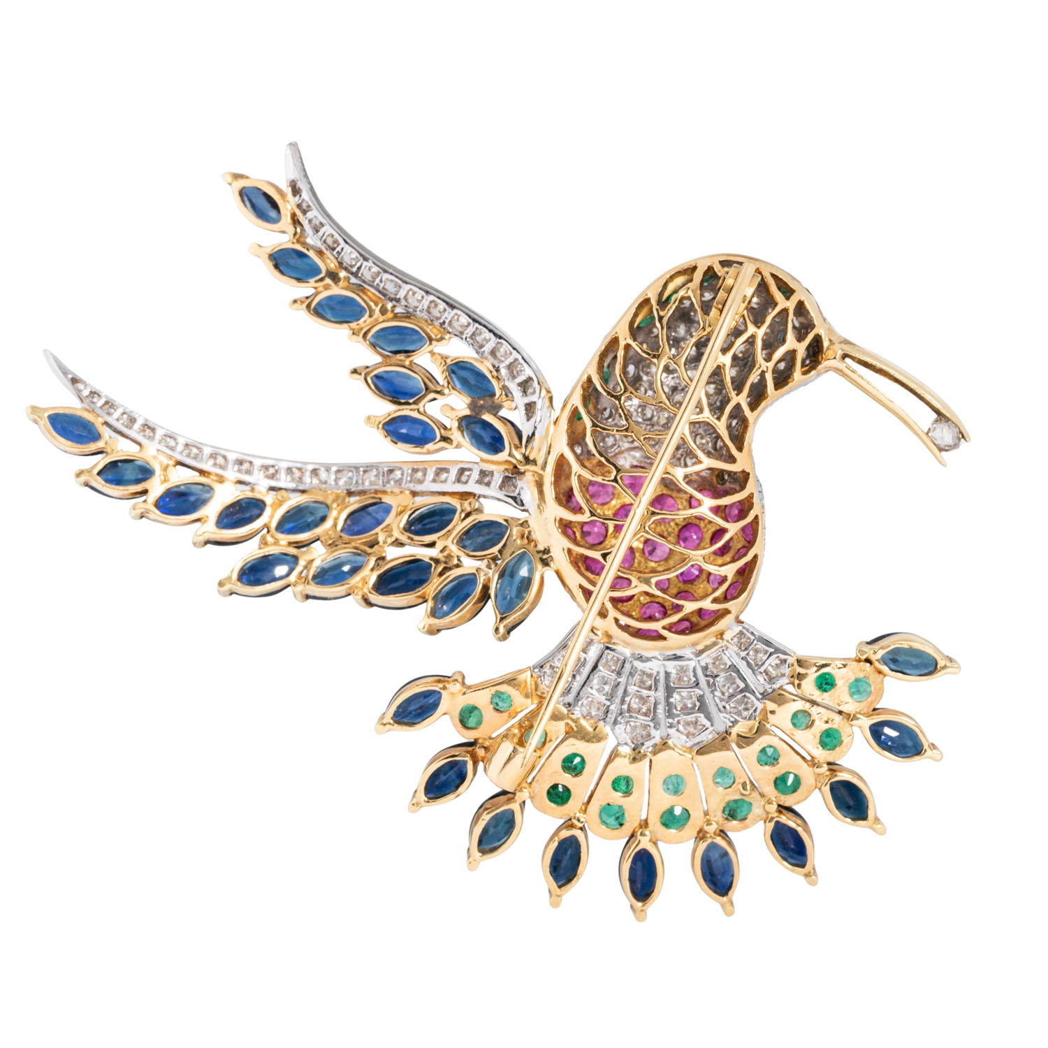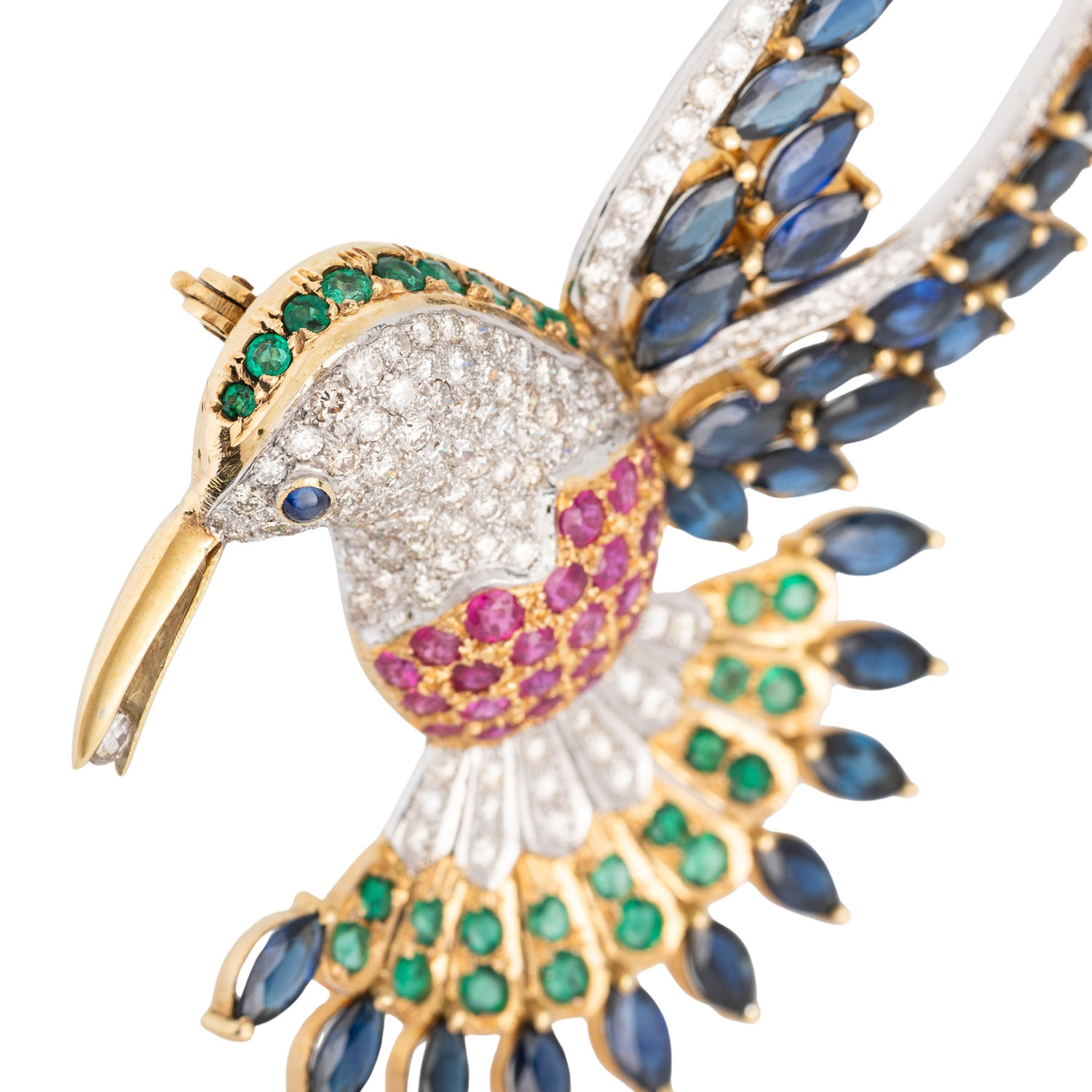 von zus. ca. 3,5 ct, 1 Diam. Briolett ca. 0,15 ct, GW /SI, Saphiren zus. ca. 9,5 ct, 27 Smaragden zus. ca. 1,2 ct und 30 Rubinen, zus. ca. 1,6 ct, GG/WG 18K, 33,3 g, RW: 57, guter Zustand.