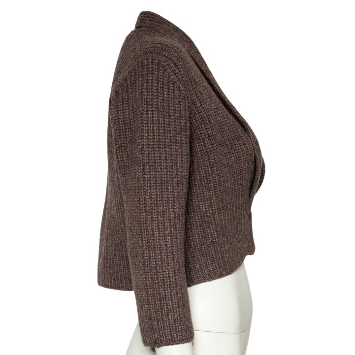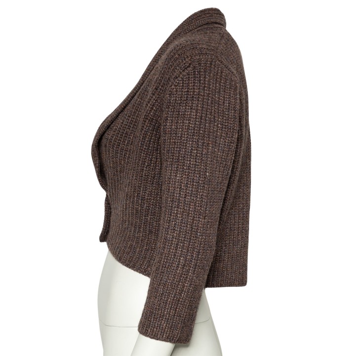 Braunes, kurzes Modell aus 100 % Kaschmir mit Schalkragen und Druckknopfverschluss. Guter Zustand.