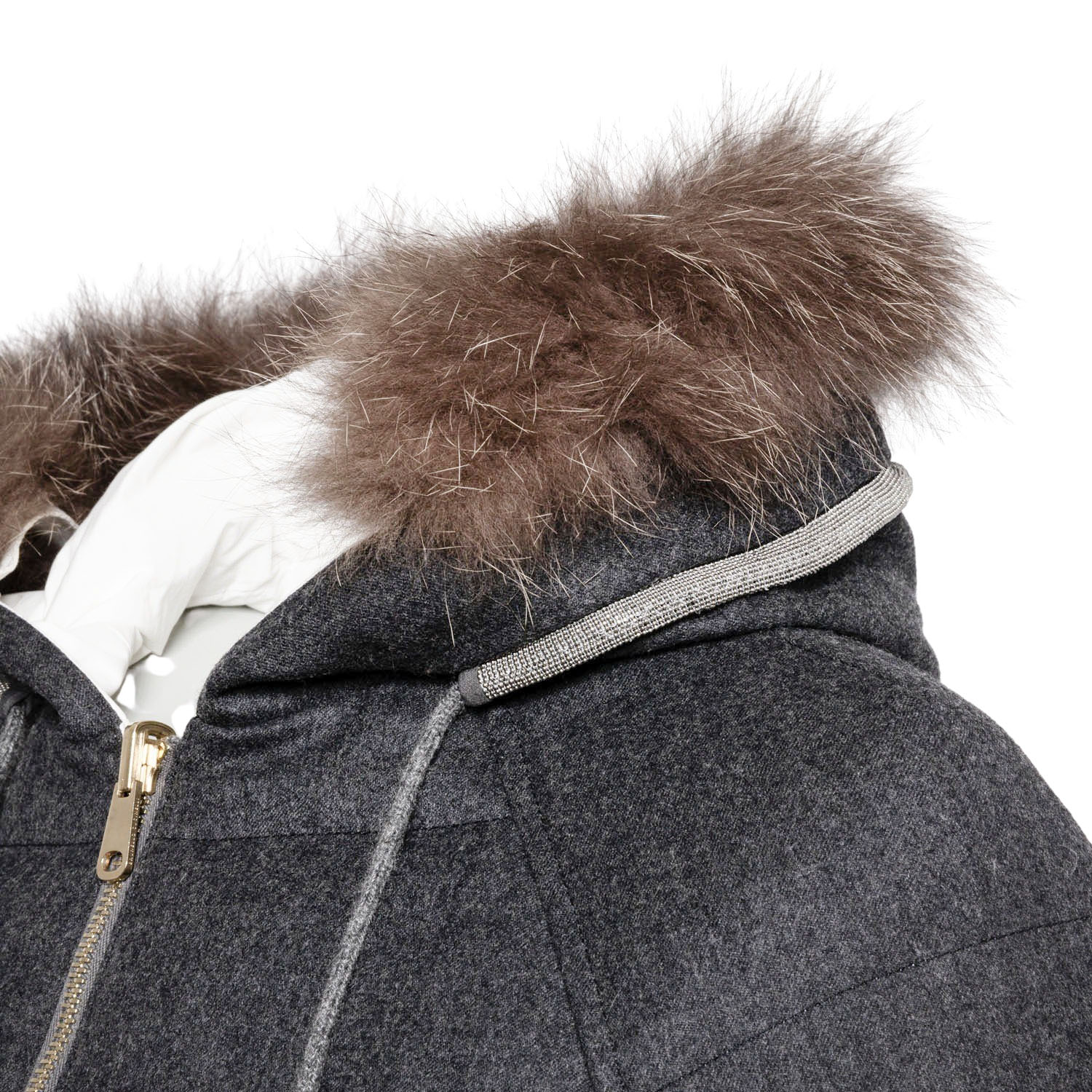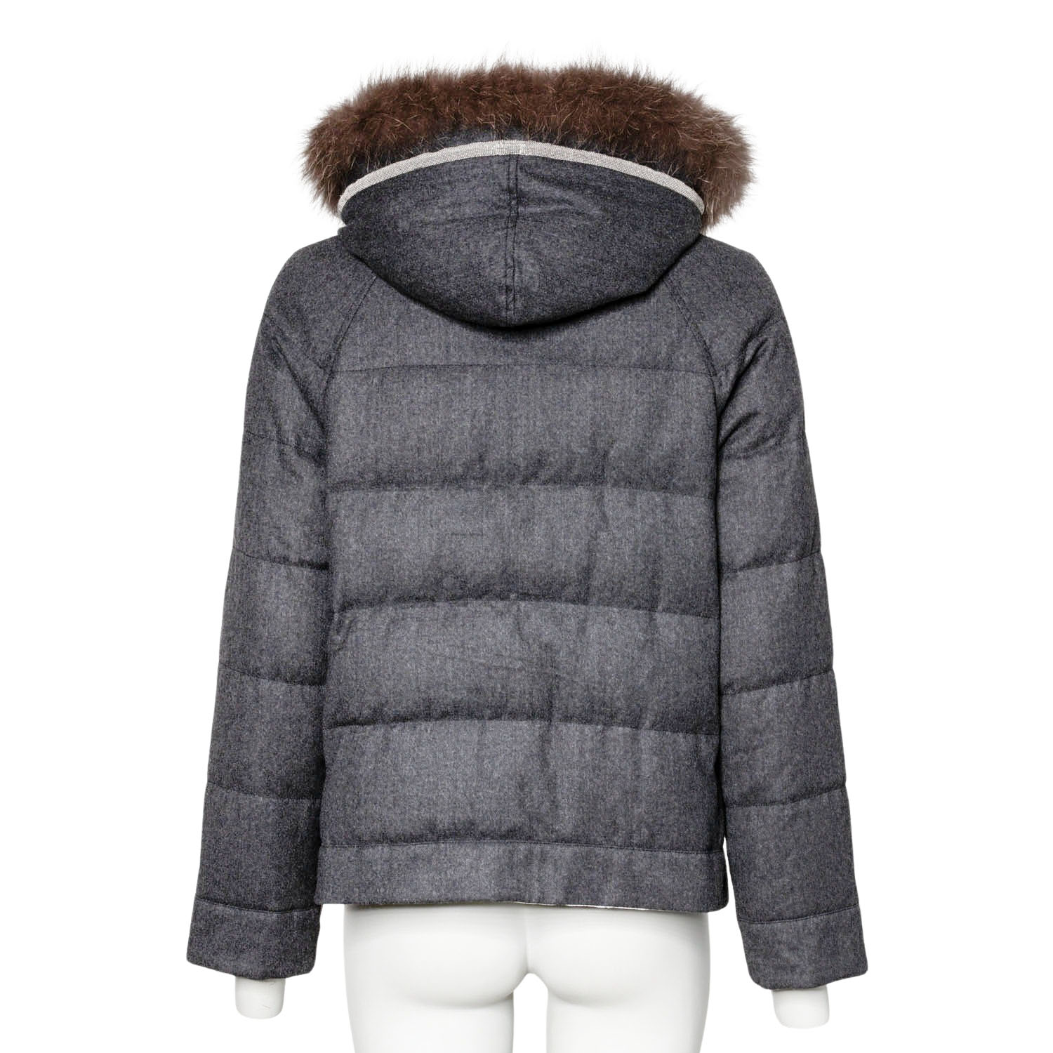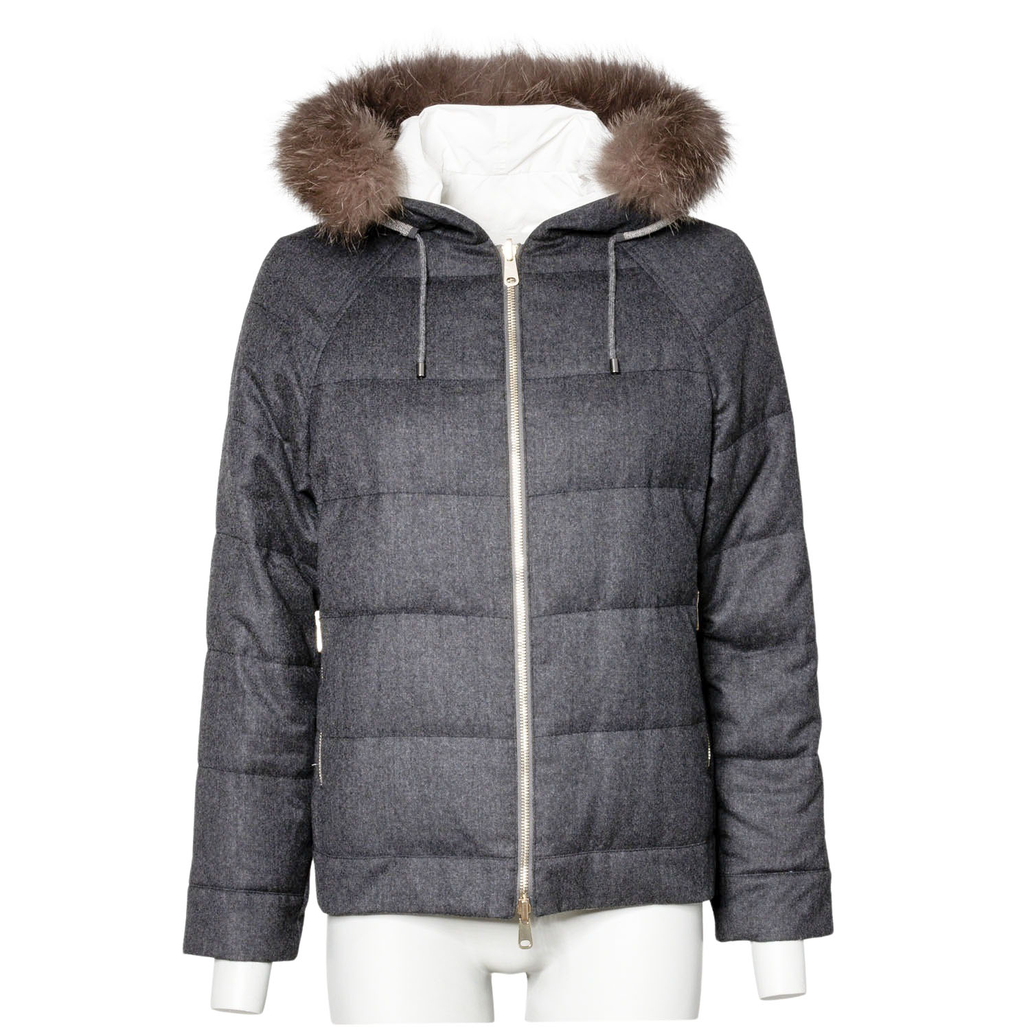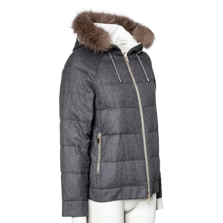 Wendbares Modell aus Schurwolle und Baumwollgemisch. Eine Seite in Grau mit horizontaler Steppung, goldfarbener Hardware, Reißverschluss, Taschen, Moniliperlen an der Kapuze und abnehmbarem Fellkragen. Die andere Seite in Creme. Guter Zustand.