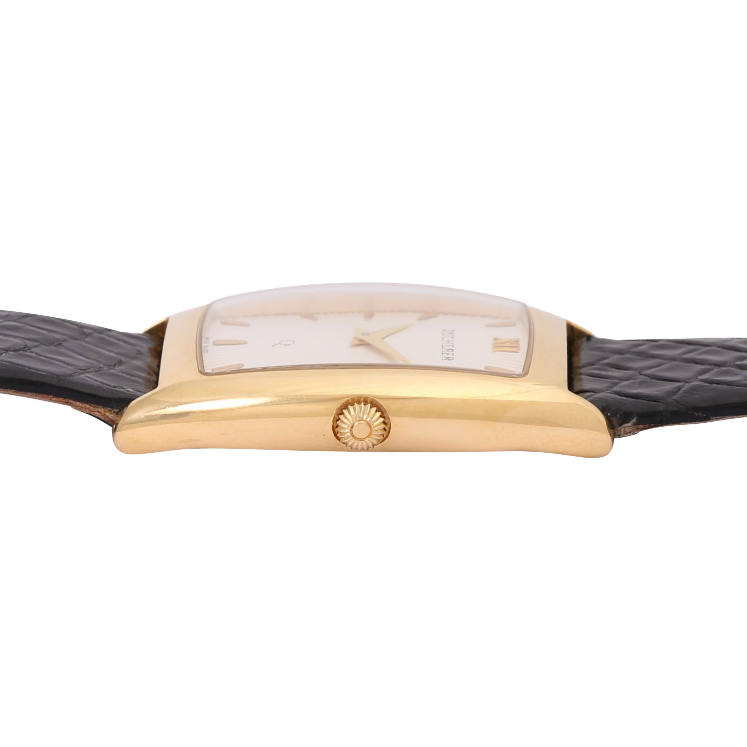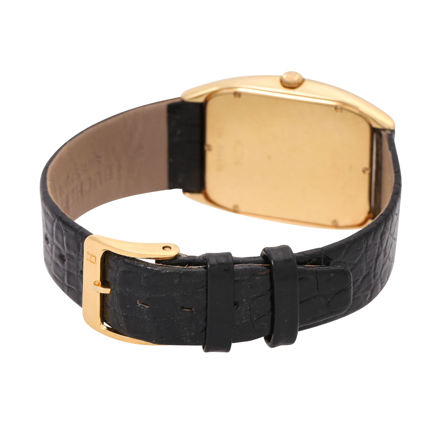 18K Gelbgold. Original Lederarmband mit vergoldeter Dornschließe. Quartzwerk, Bucherer auf Basis ETA 956.412 mit neuer Batterie in funktionsfähigem Zustand. Guillochiertes Silbernes Ziffernblatt mit aufgesetzten goldenen Indizes und römischer 12. In gutem Zustand, leichte Tragespuren am Band und Gehäuse. Breite ca. 28,5 mm ohne Krone, Höhe ca. 38 mm. Passend bis zu ca. 18,5 cm Handgelenkumfang.