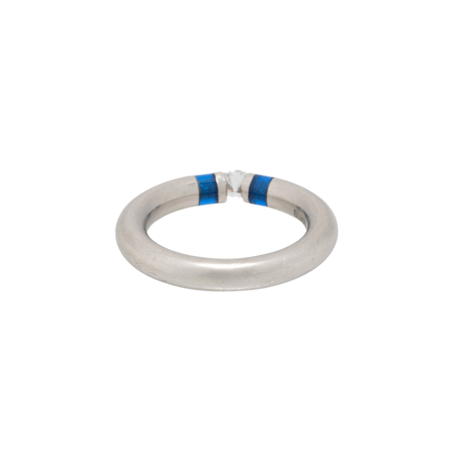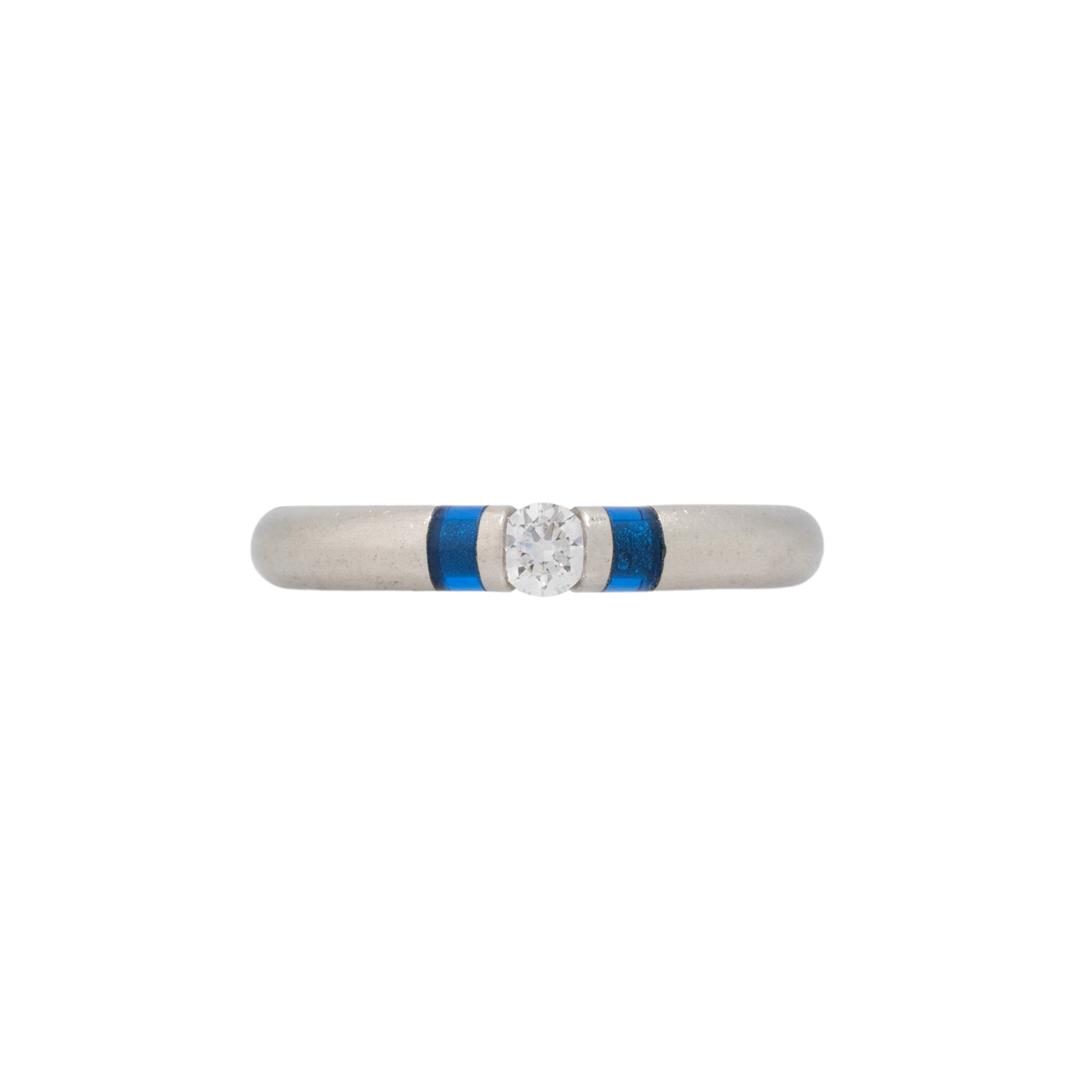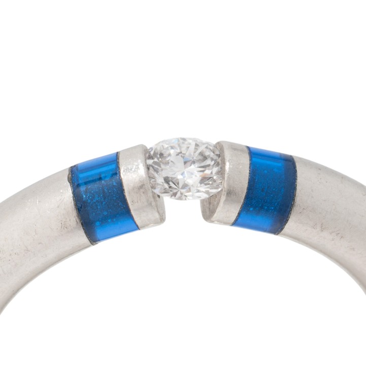 ca. 0,17 ct, sehr gute Farbe und Reinheit, seitlich 2 blaue synthetische Steine, PT 950, 10 g, RW: 50, 20./21. Jh., leichte Tragespuren, Herstellermarke.