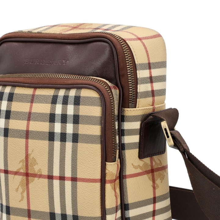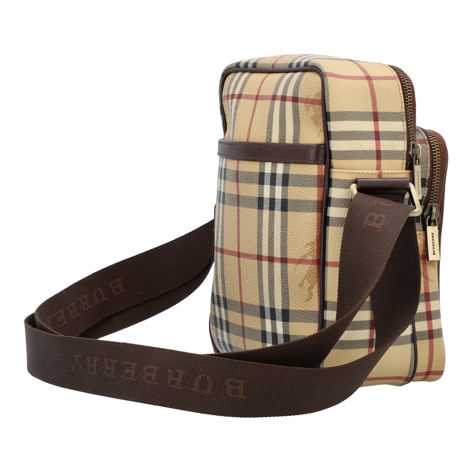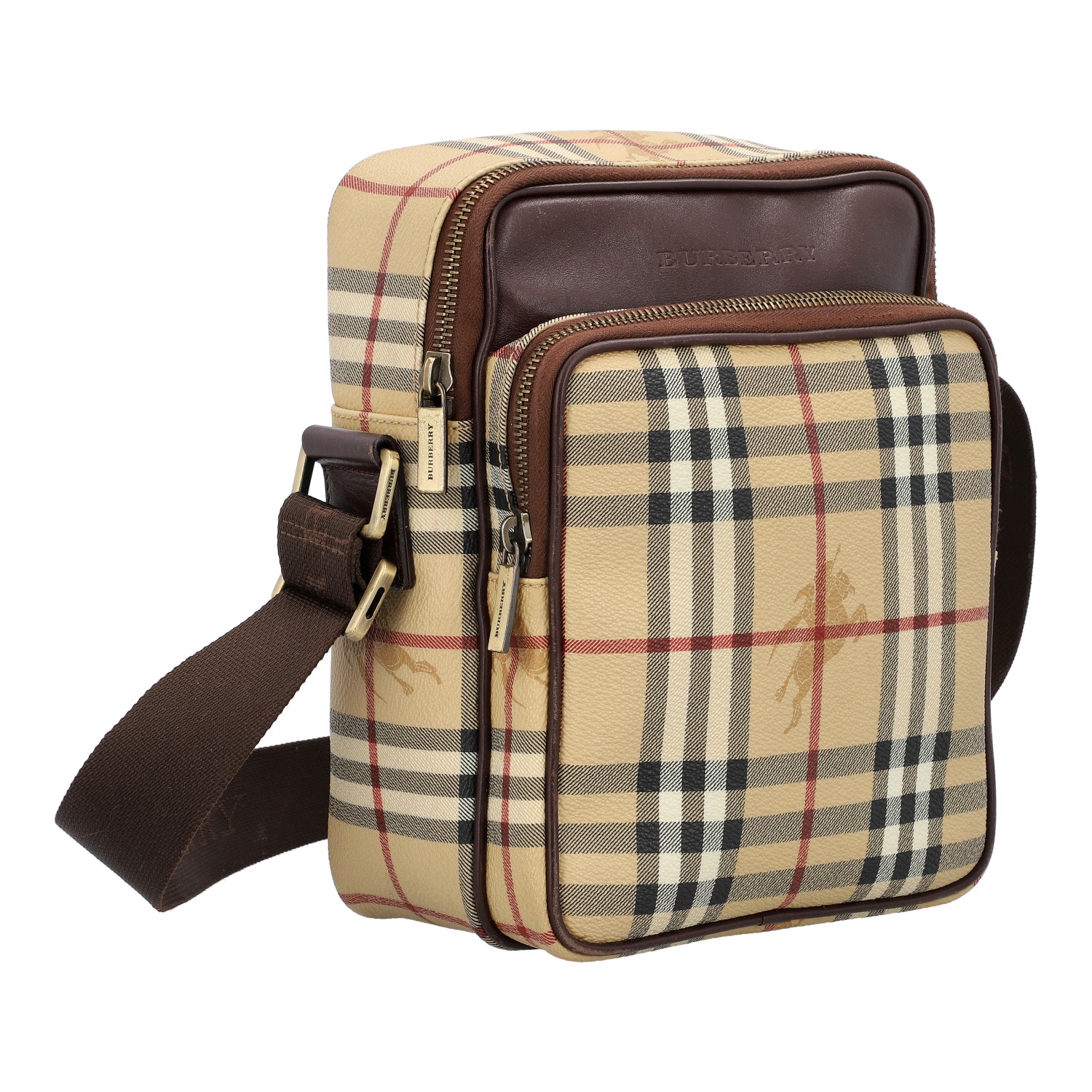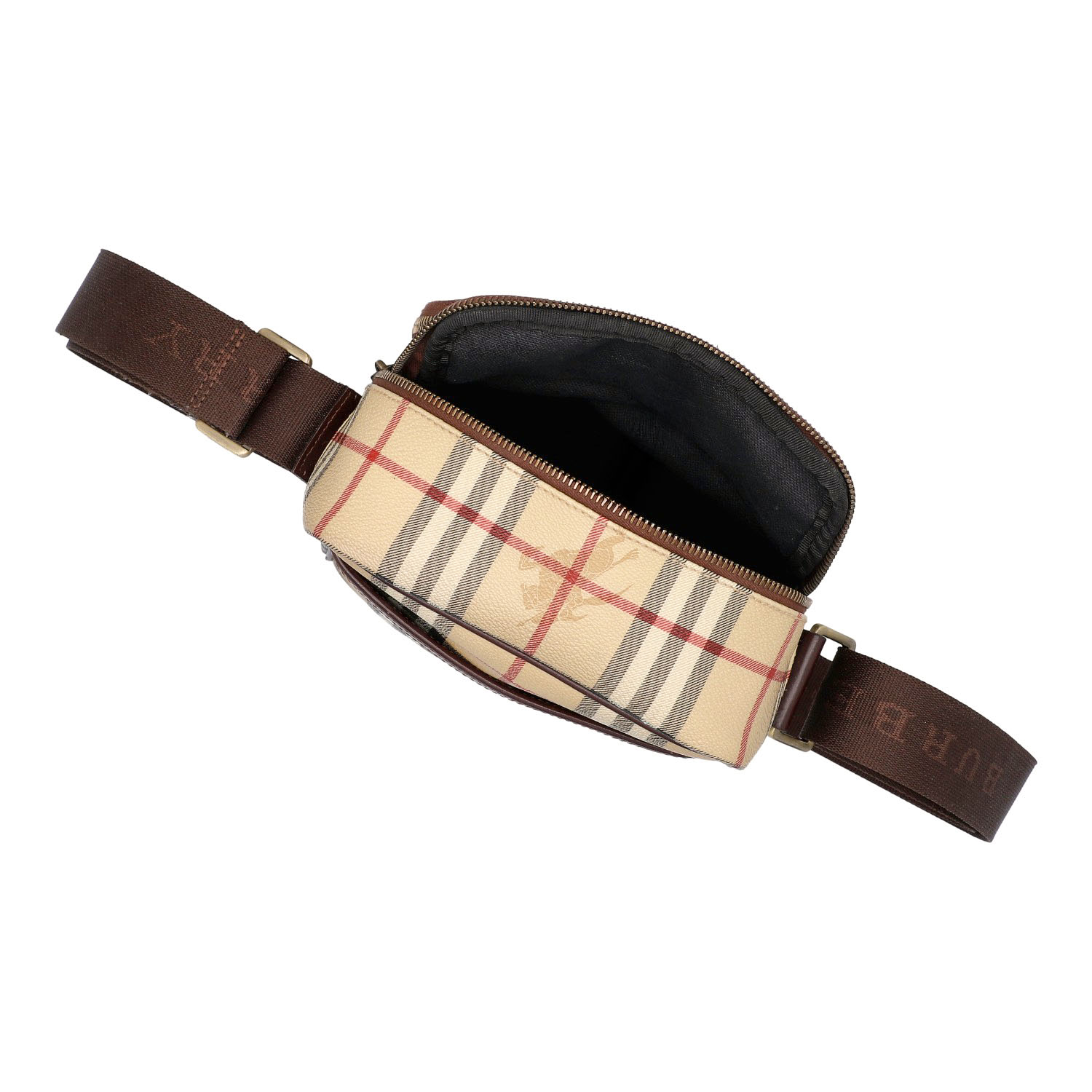 Beschichtetes Textil mit klassischem Karomuster auf beigem Grund. Details aus braunem Textil und Leder. Diverse Fächer. Leichte Gebrauchsspuren vorhanden.