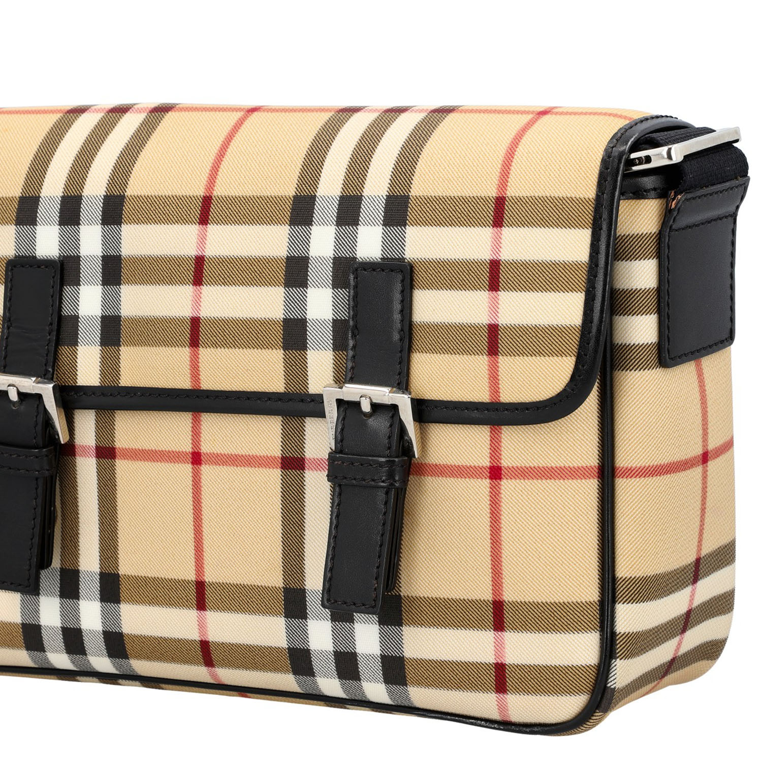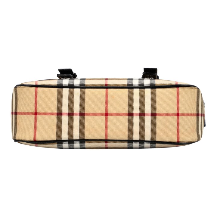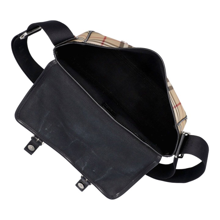 Beschichtetes Textil mit klassischem Karomuster auf beigem Grund. Details aus schwarzemTextil und Leder.Hauptfach mit Überschlag und magnetischem Laschenverschluss. Leichte Gebrauchsspuren vorhanden. 26x9x16,5cm.