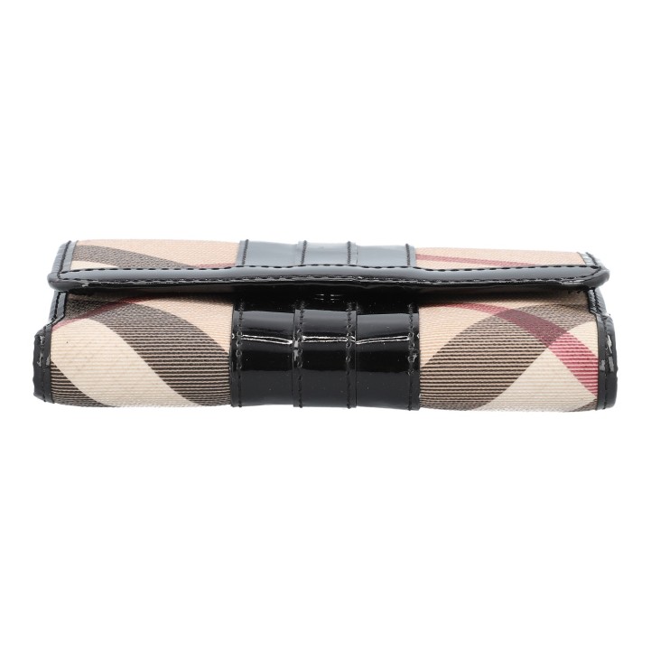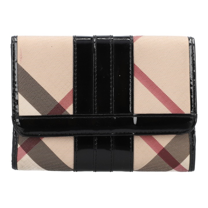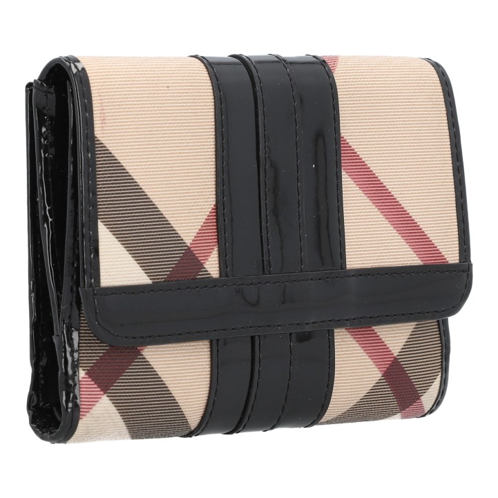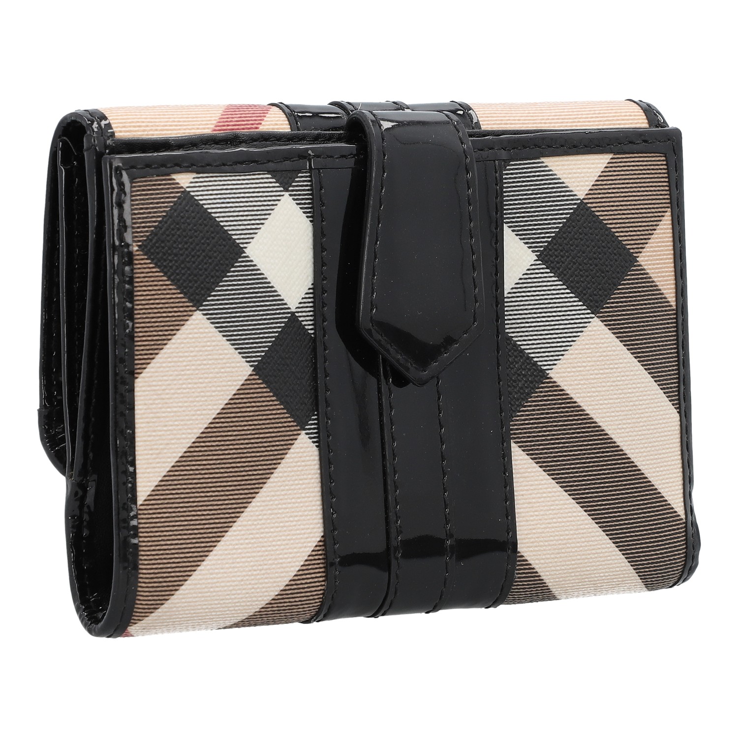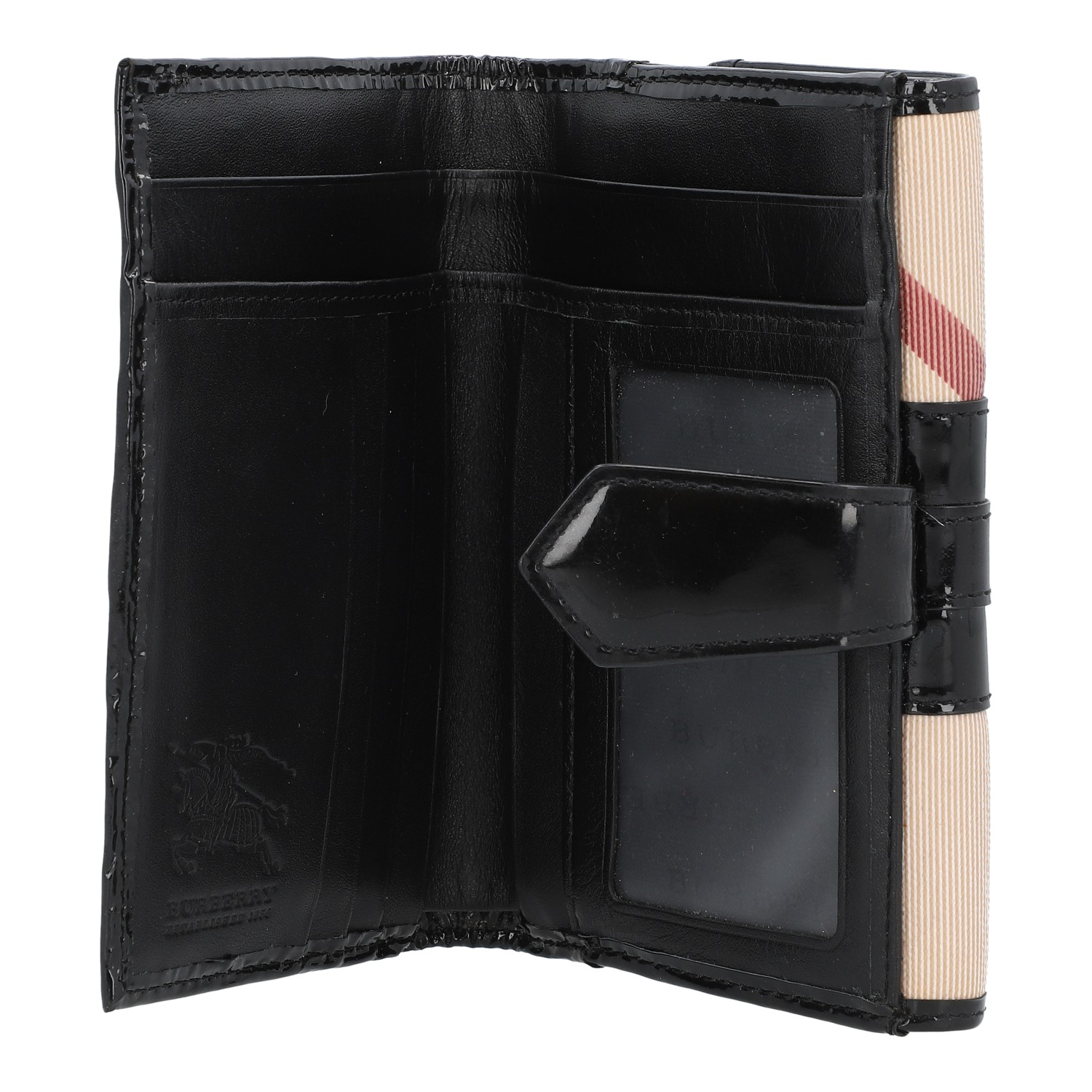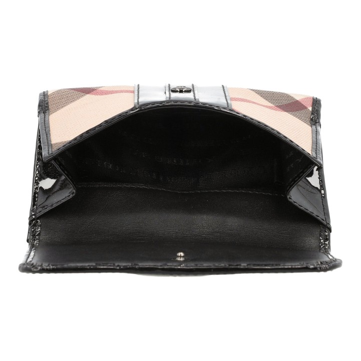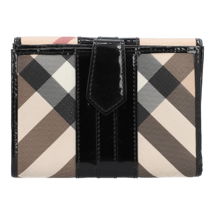 Beschichtetes Textil mit klassischem Karomuster und Details aus schwarzem Lackleder. Diverse Fächer vorhanden. Leichte Gebrauchsspuren vorhanden. 14x3x10cm.