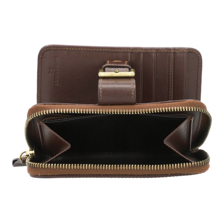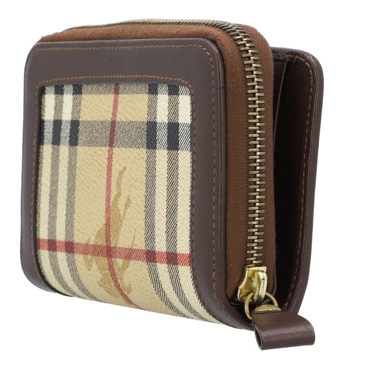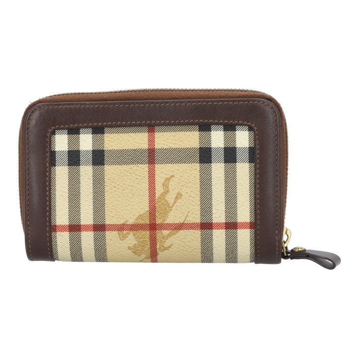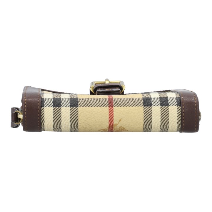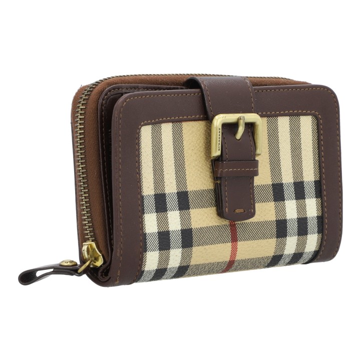Beschichtetes Textil mit klassischem Karomuster und Details uas Leder in Dunkelbraun. Hardware in Goldfarben. Diverse Fächer vorhanden. Mit Gebrauchsspuren. 14x3x9cm.