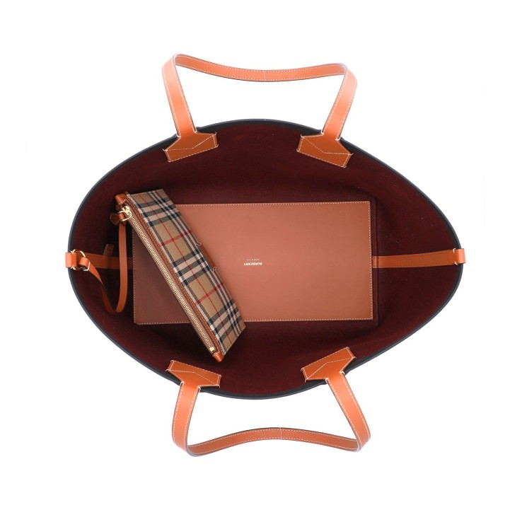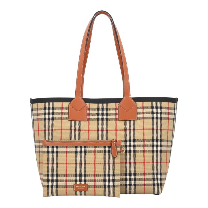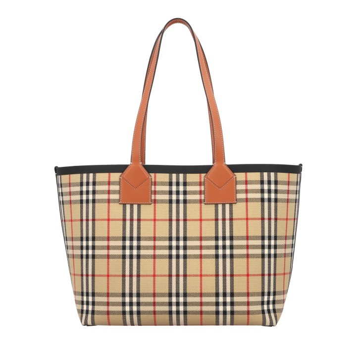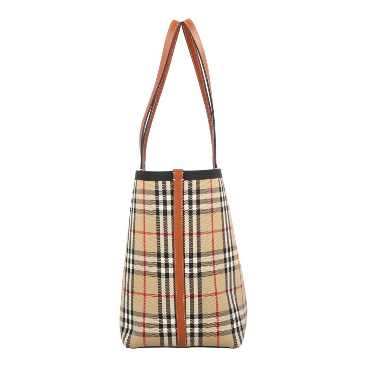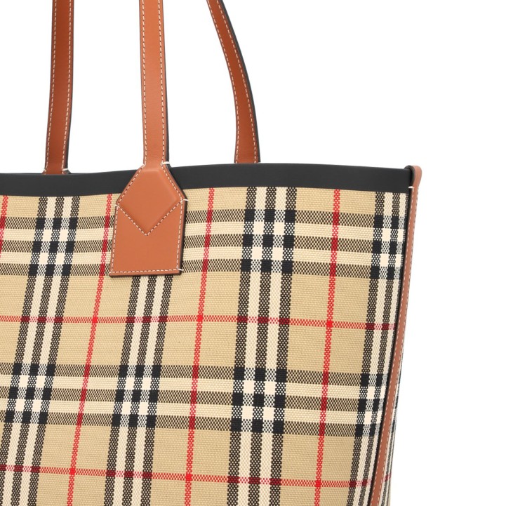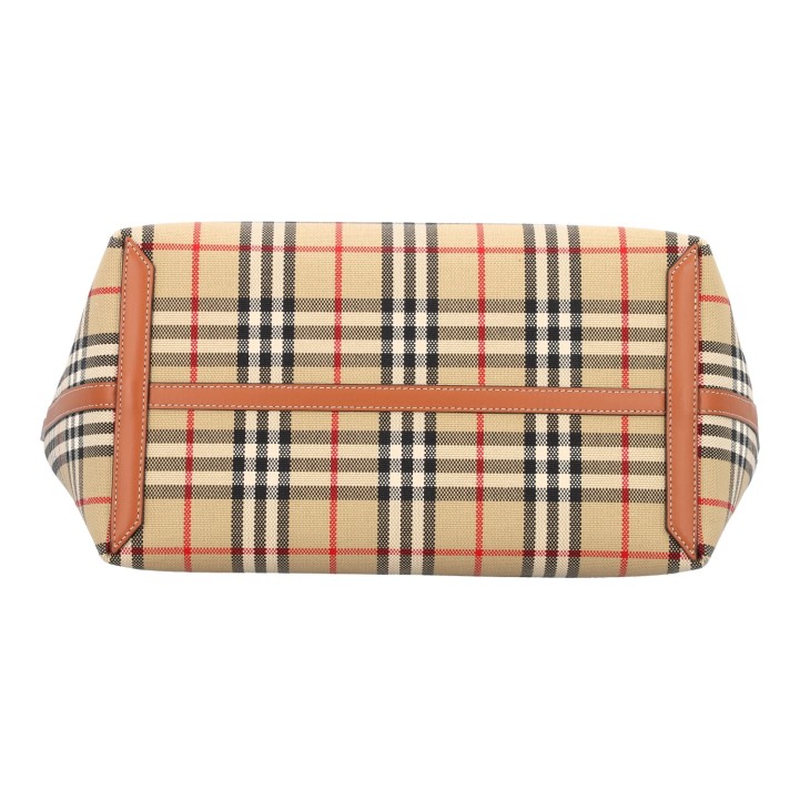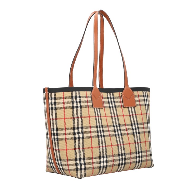 Check-Design mit braunen Lederdetails und Doppelhenkeln.