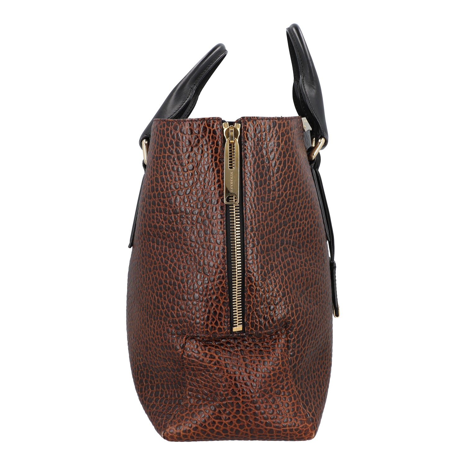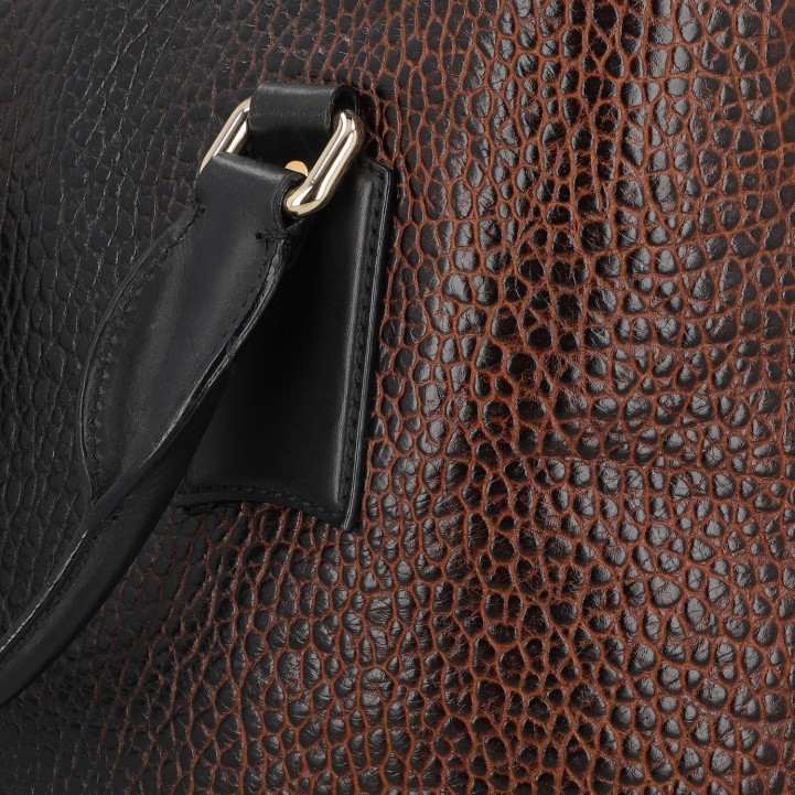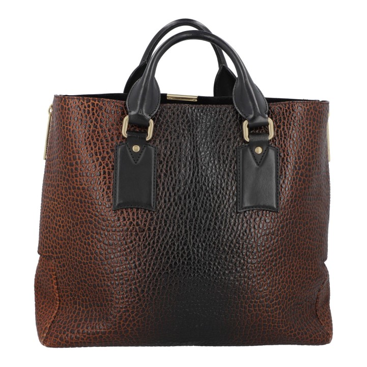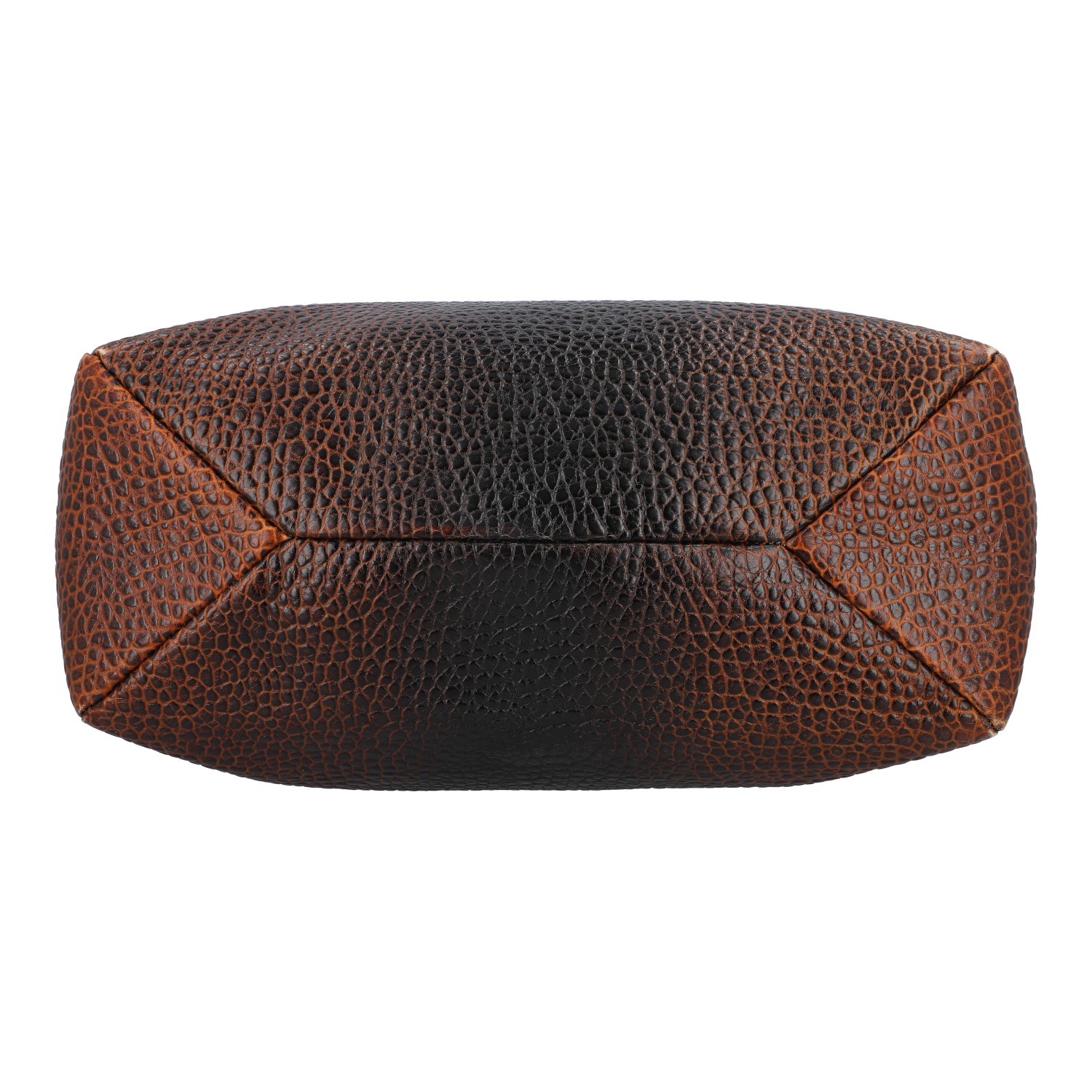 Tote Bag aus grob genarbtem, schwerem Leder in Schwarz/Braun mit goldfarbener Hardware. Seitliche Reißverschlüße zur Weitenregulierung, textiles Innenfutter, drei kleine Innenfächer. Schulterriemen anbei. Leichter Abrieb an den Kanten vorhanden. 40x15x35cm.