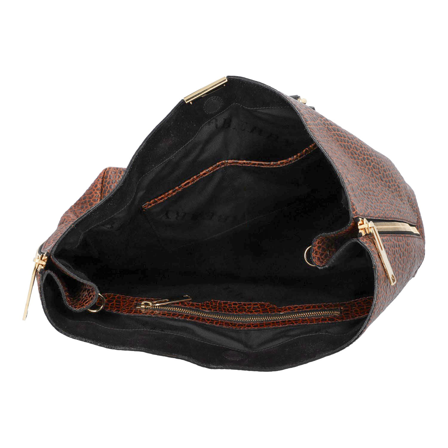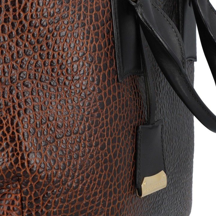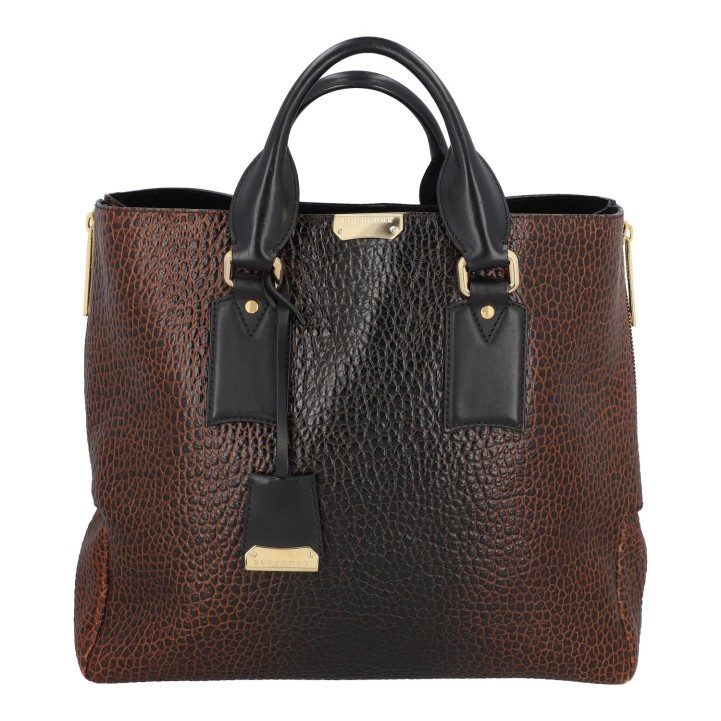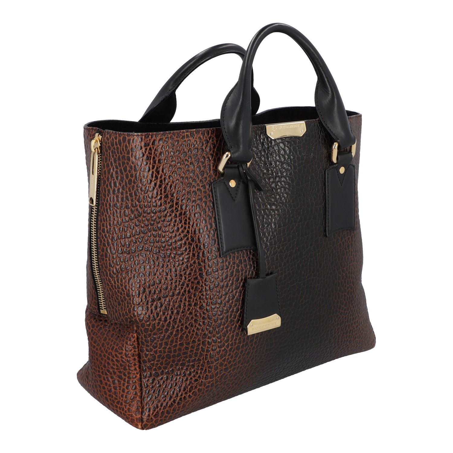 Tote Bag aus grob genarbtem, schwerem Leder in Schwarz/Braun mit goldfarbener Hardware. Seitliche Reißverschlüße zur Weitenregulierung, textiles Innenfutter, drei kleine Innenfächer. Schulterriemen anbei. Leichter Abrieb an den Kanten vorhanden. 40x15x35cm.