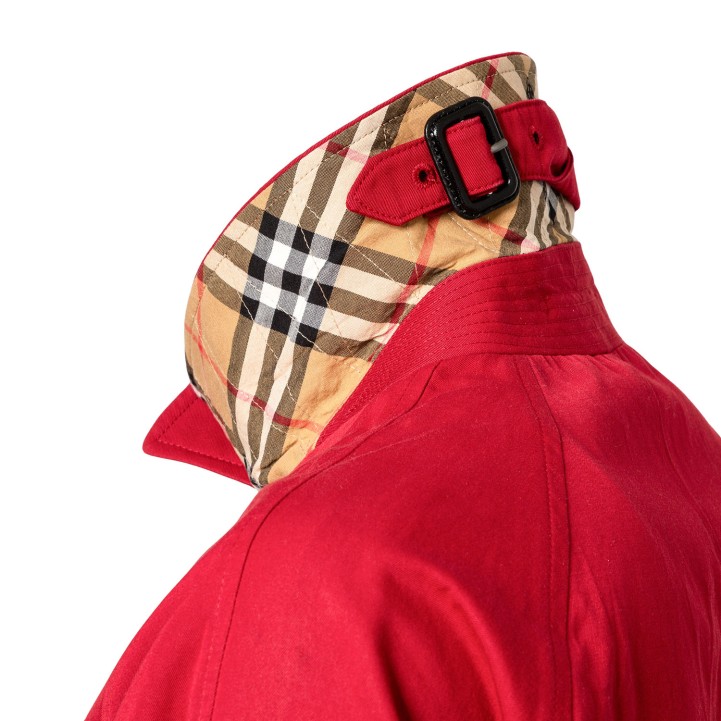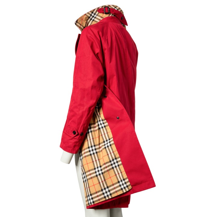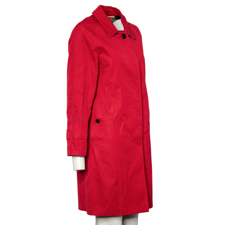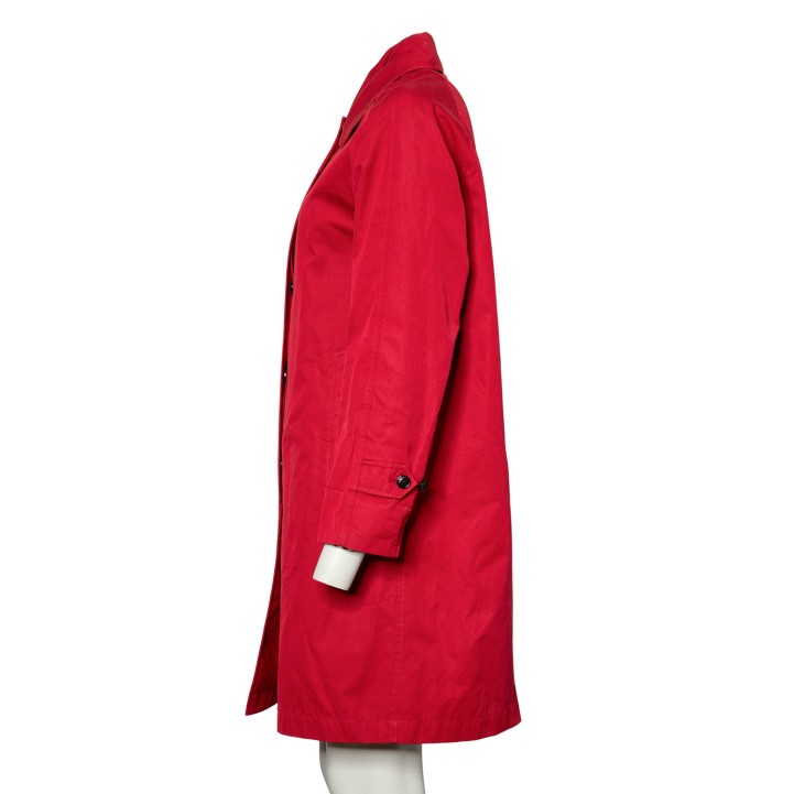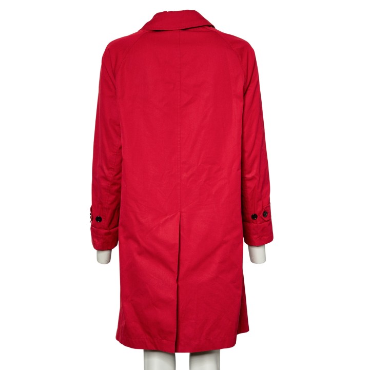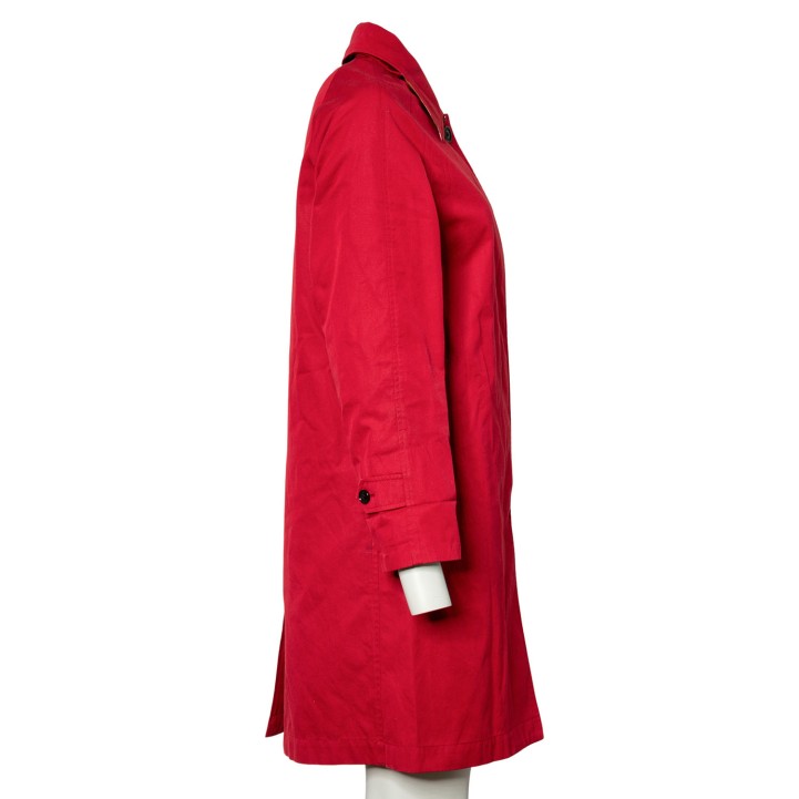 100% Baumwolle in Rot mit klassischem, kariertem Innenfutter. Verdeckte Knopfleiste mit schwarzen Knöpfen. Guter Erhalt.