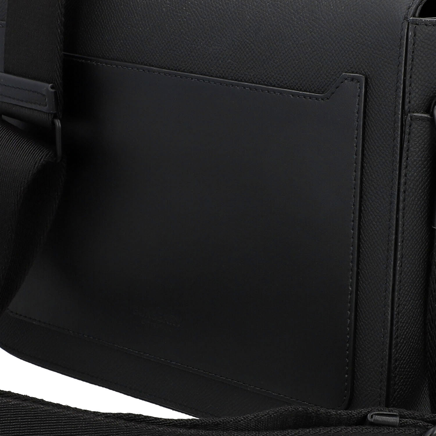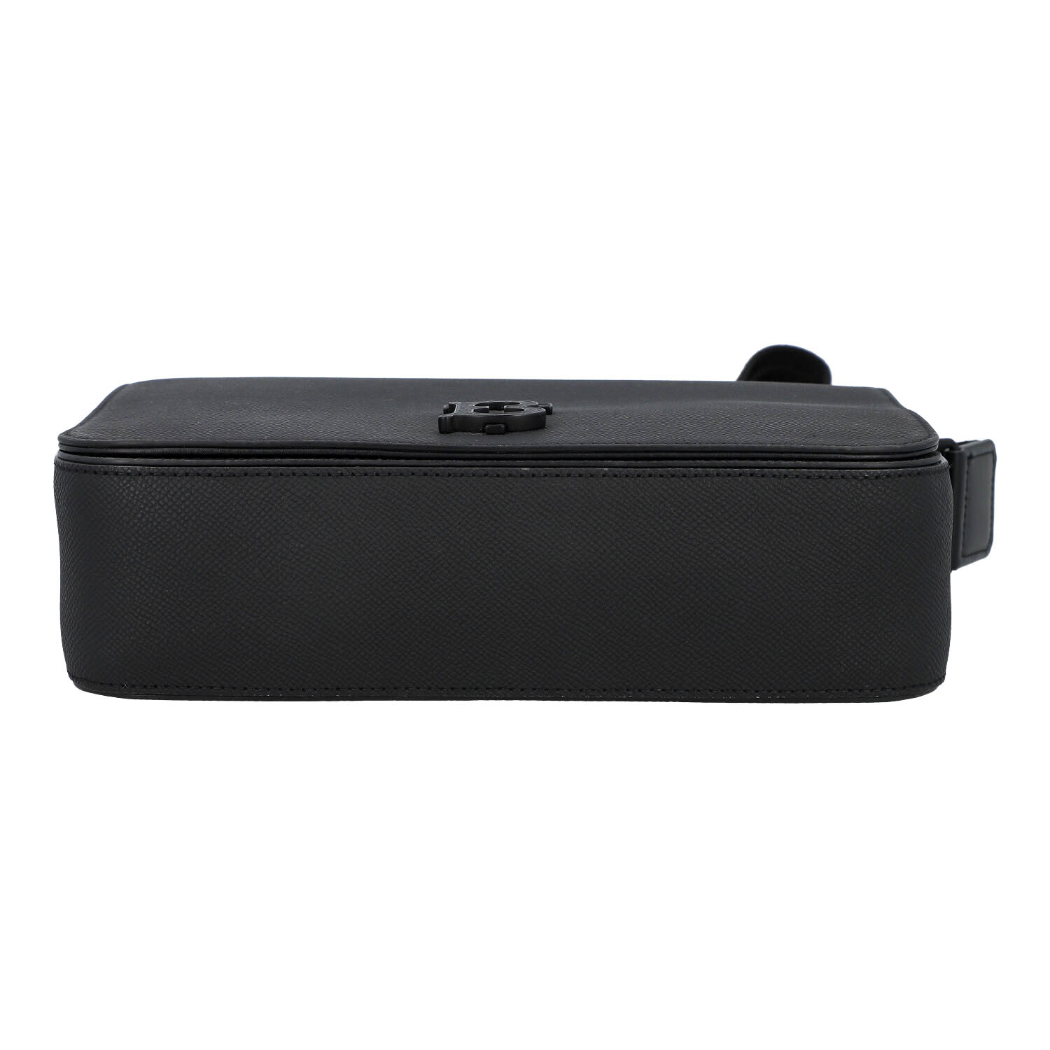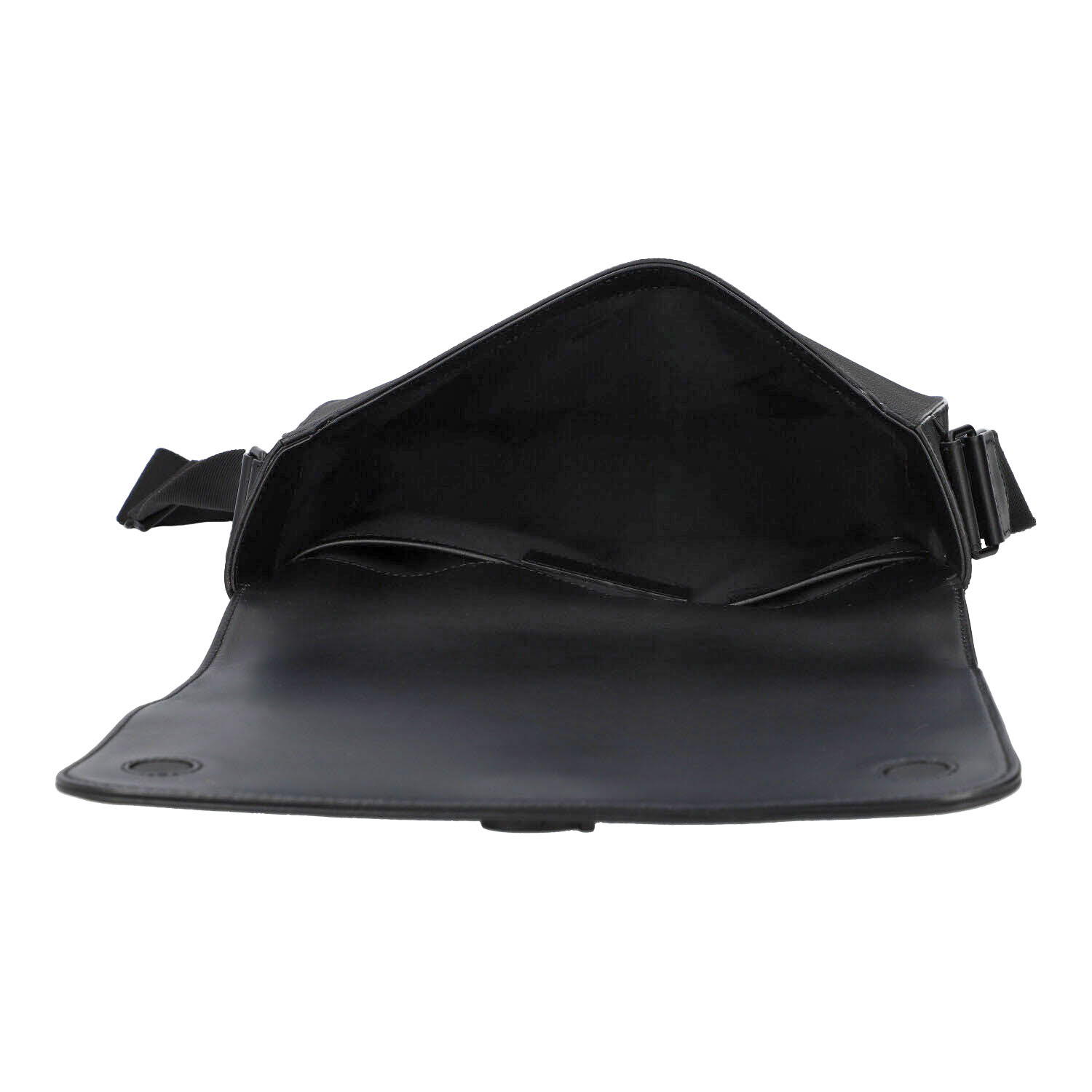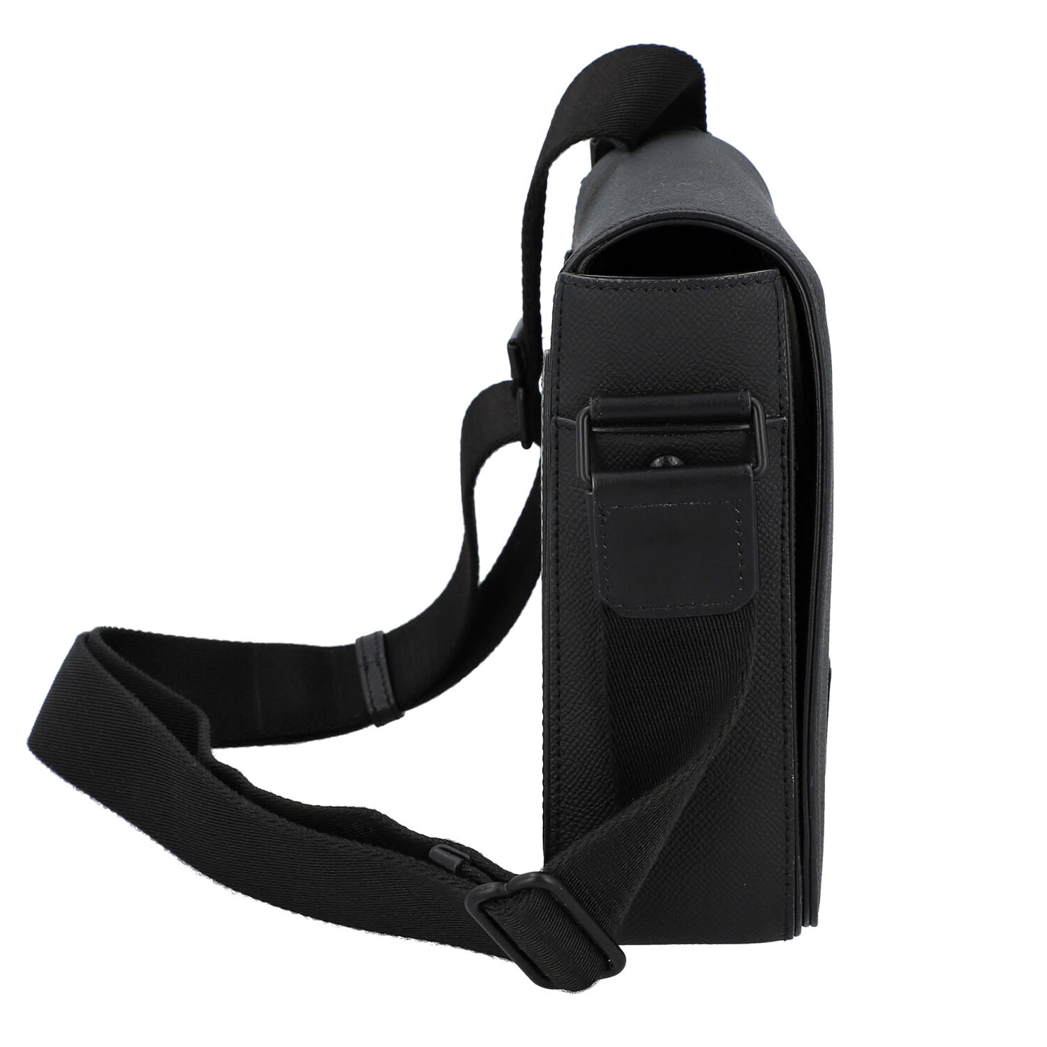 Schwarzes Kalbsleder mit schwarzer Hardware, Textilerschultergurt, Außenfach auf der Rückseite und Überschlag mit Logo-Dekor. Innenraum mit einem Fach. Dezente Gebrauchsspuren vorhanden. 26 x 7 x 21 cm.
