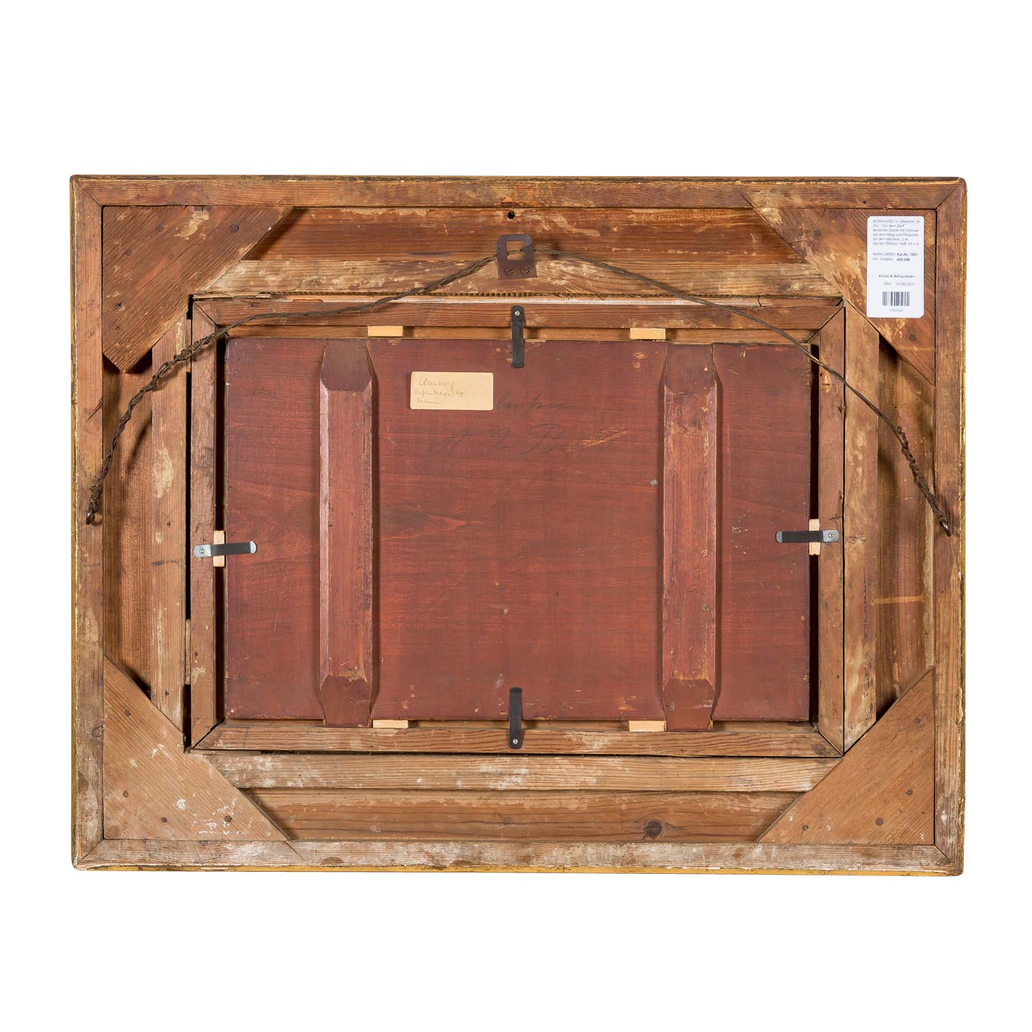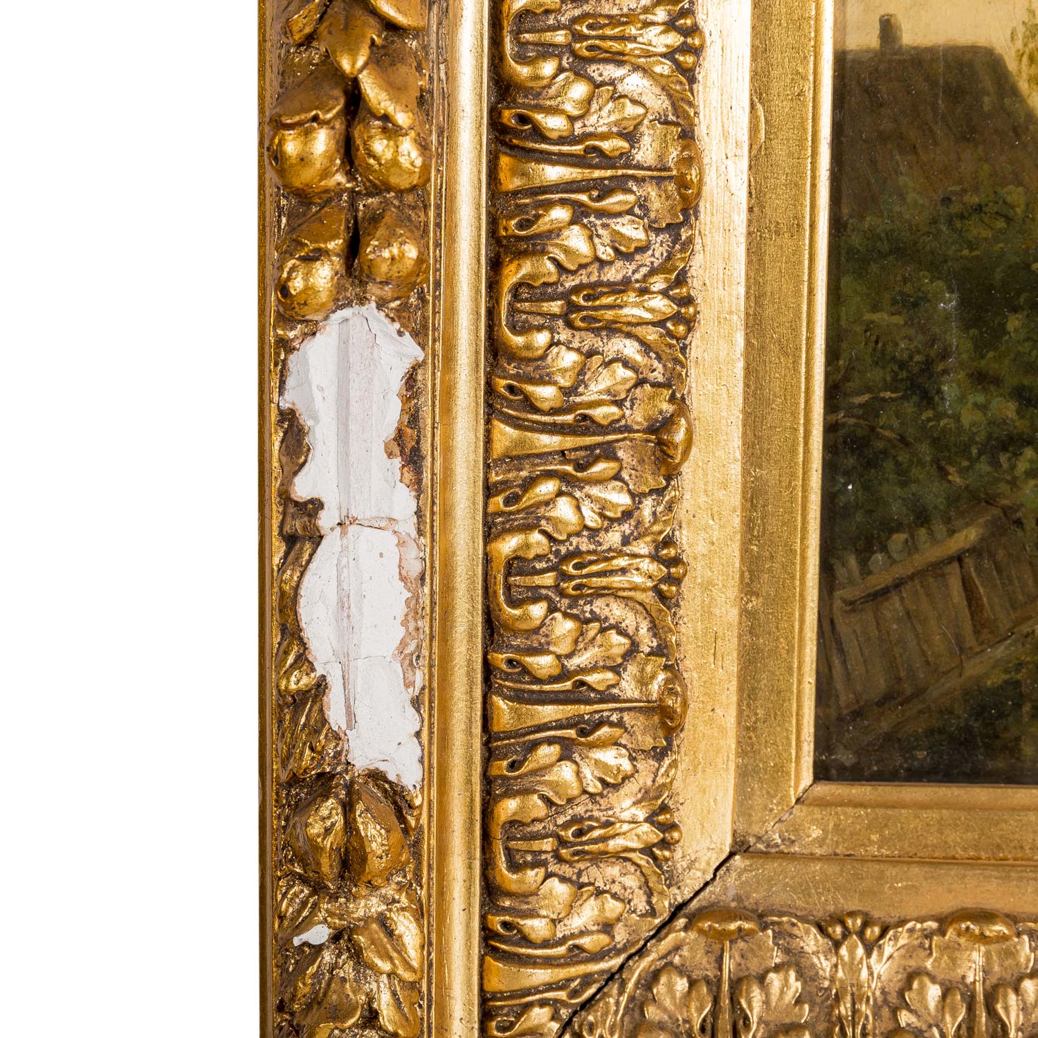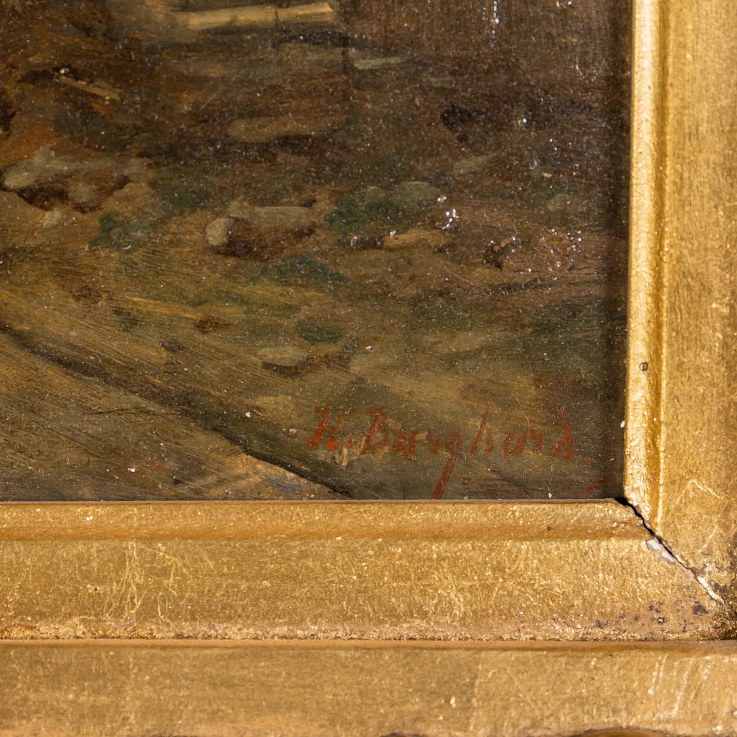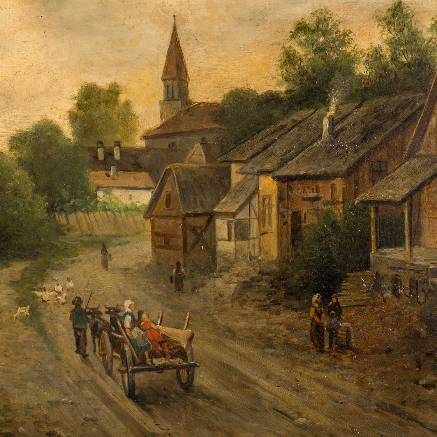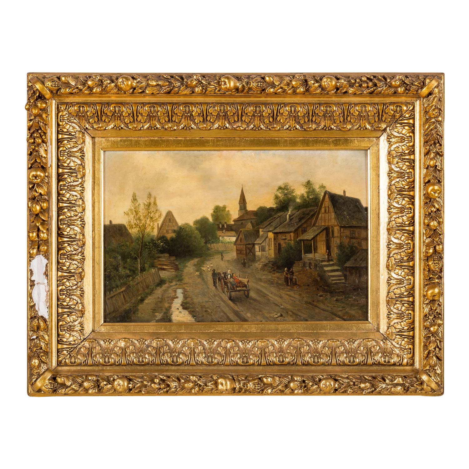 ländliche Szene mit Fuhrwerk auf dem Weg und Personen vor den Häusern, u.re. signiert Öl/Holz, HxB: 31 x 47 cm (56,5 x 72,5 cm mit Rahmen). Altersspuren, restauriert und retuschiert, Firnisgilb, Kratzer. Mit prunkvollem Rahmen (beschädigt, lose Teile anbei).