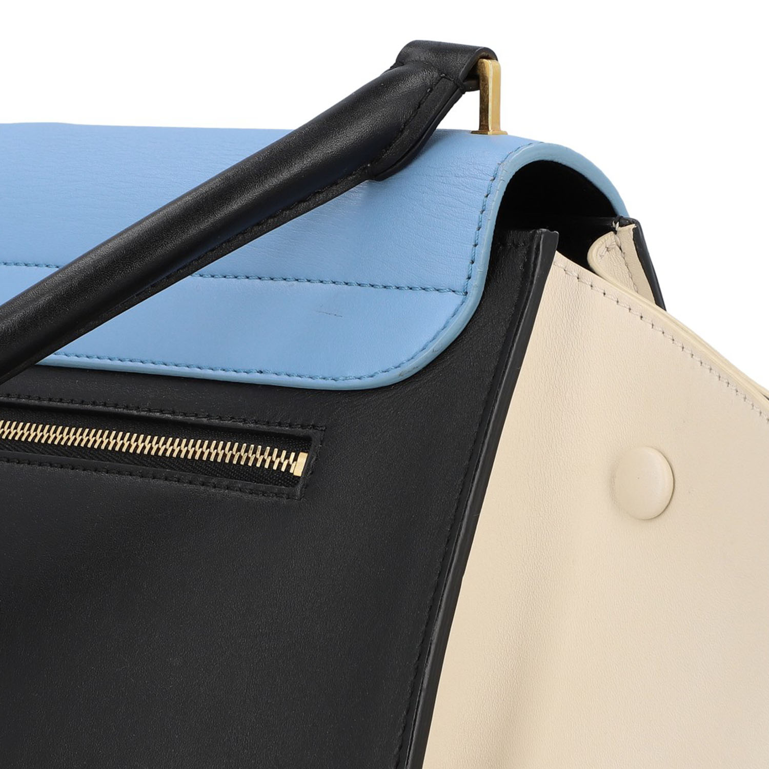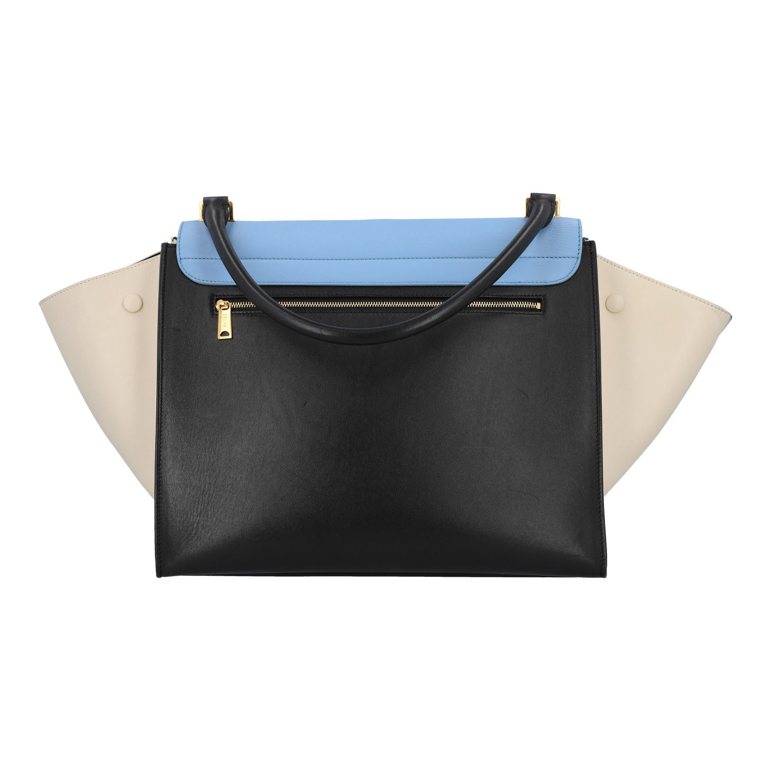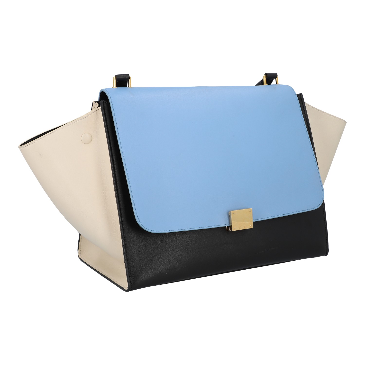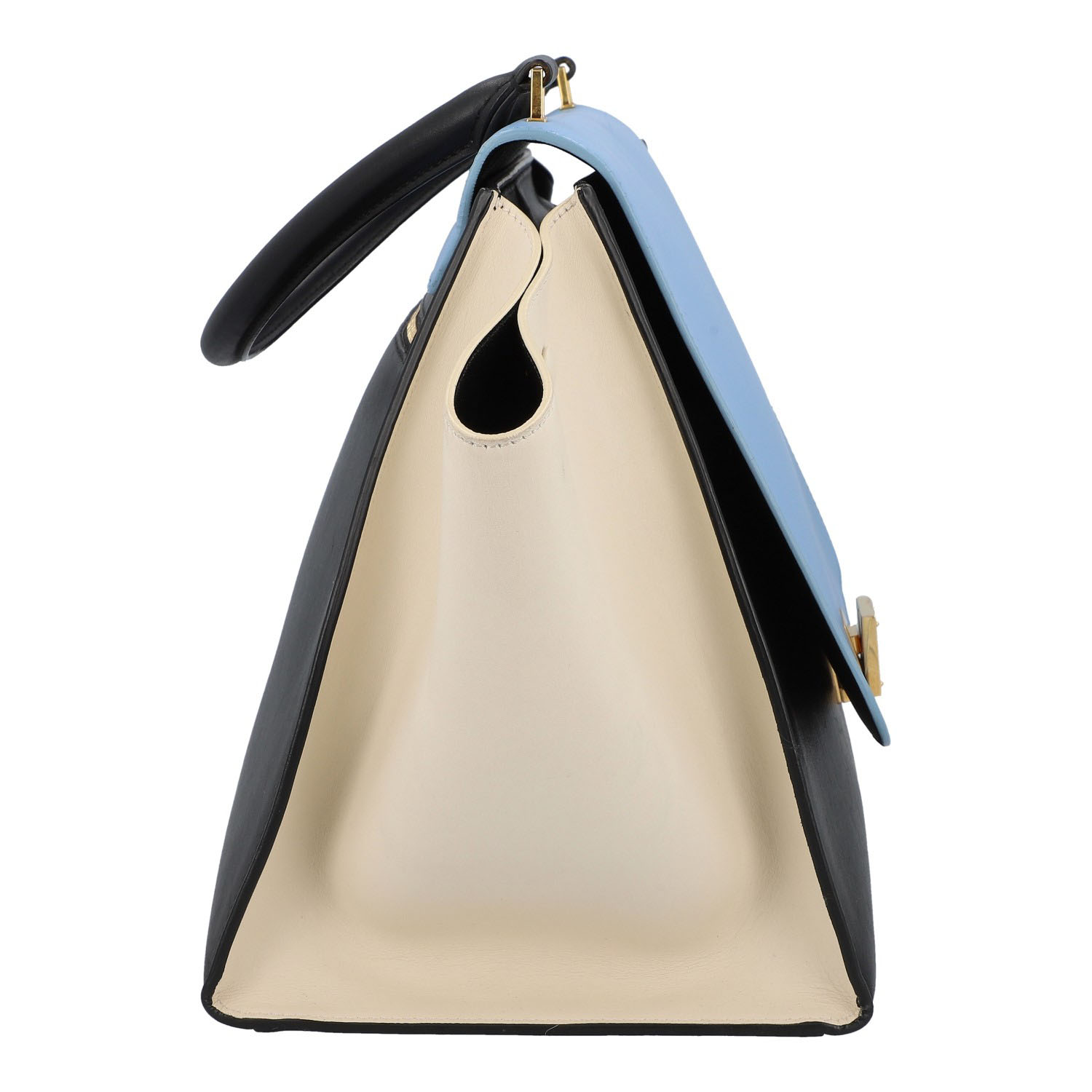 Tricolor-Modell aus Leder in Hellblau, Schwarz und Creme mit goldfarbener Hardware. Überschlag mit Klapp- und Drehschließe, ein Henkel sowie Außenfach auf der Rückseite. Innenraum mit Reißverschlussfach und zwei weiteren Fächern. Staubbeutel liegt bei. Tragespuren vorhanden. 34 x 19 x 27 cm.