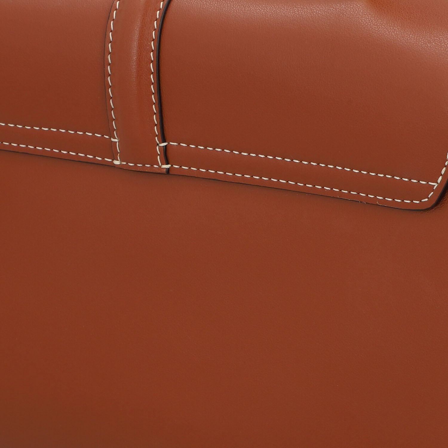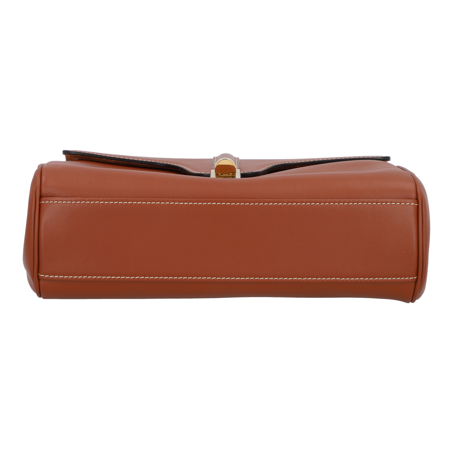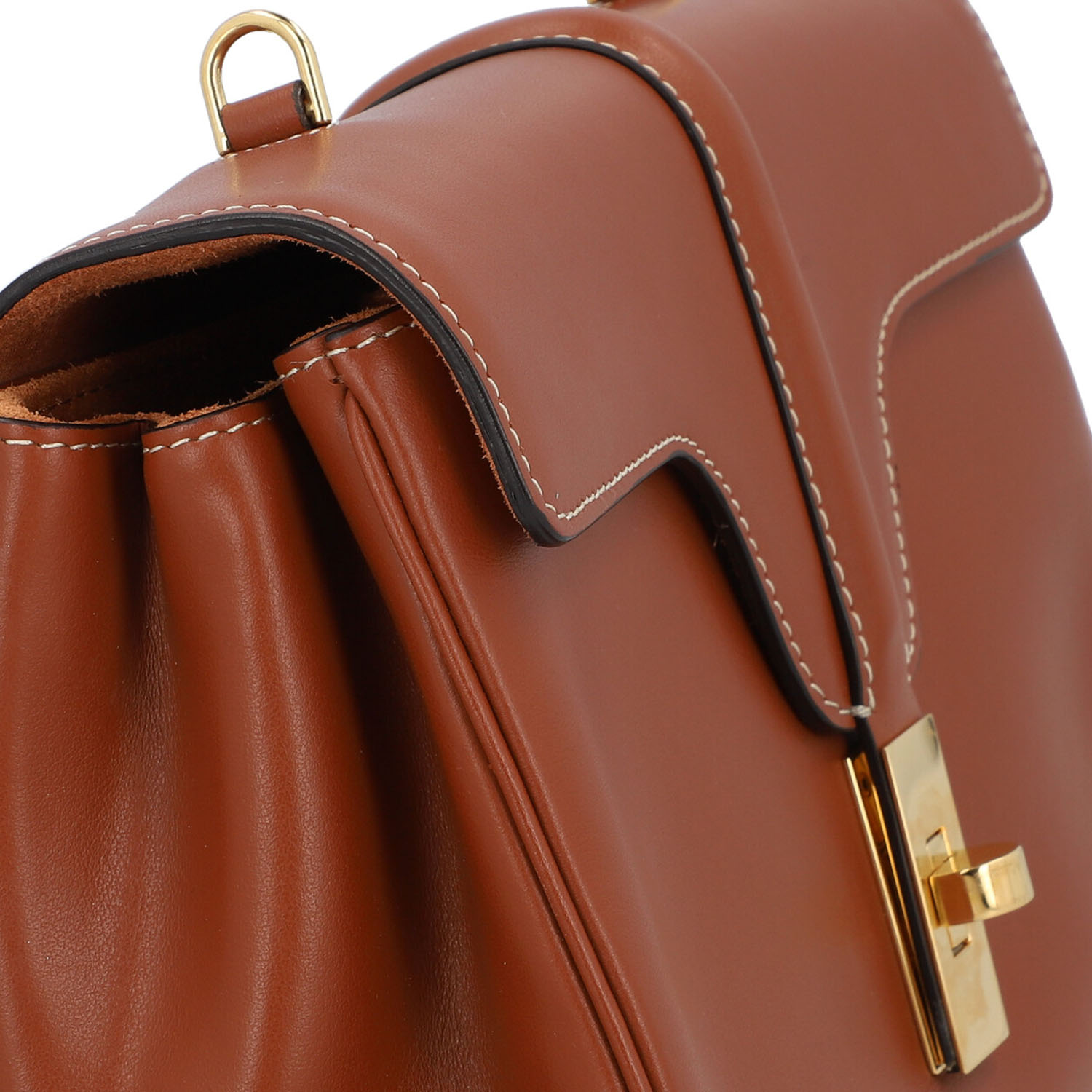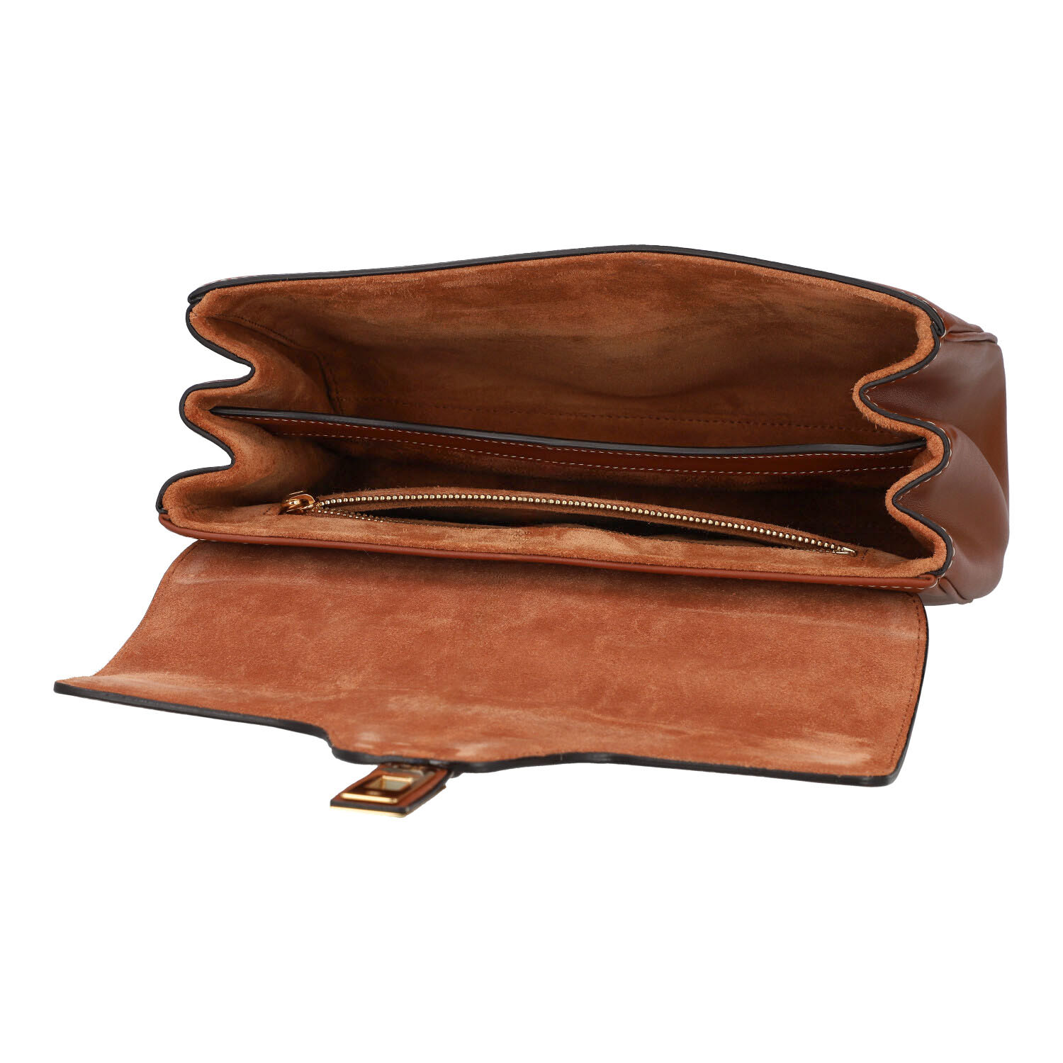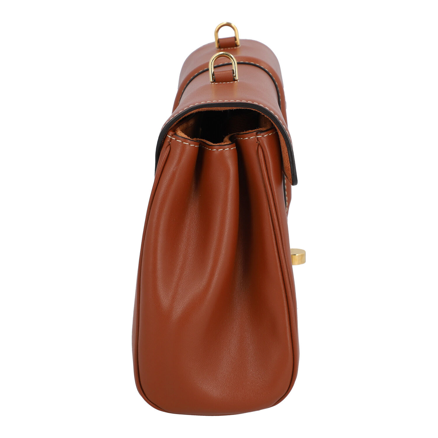 Glattleder in Braun mit goldfarbener Hardware, Überschlag mit Drehverschluss und abnehmbarem Schulterriemen. Innenraum mit zwei Abteilen und einem Reißverschlussfach. Schulterriemen und Staubbeutel anbei. Gebrauchsspuren vorhanden. 23,5 x 8 x 18 cm.