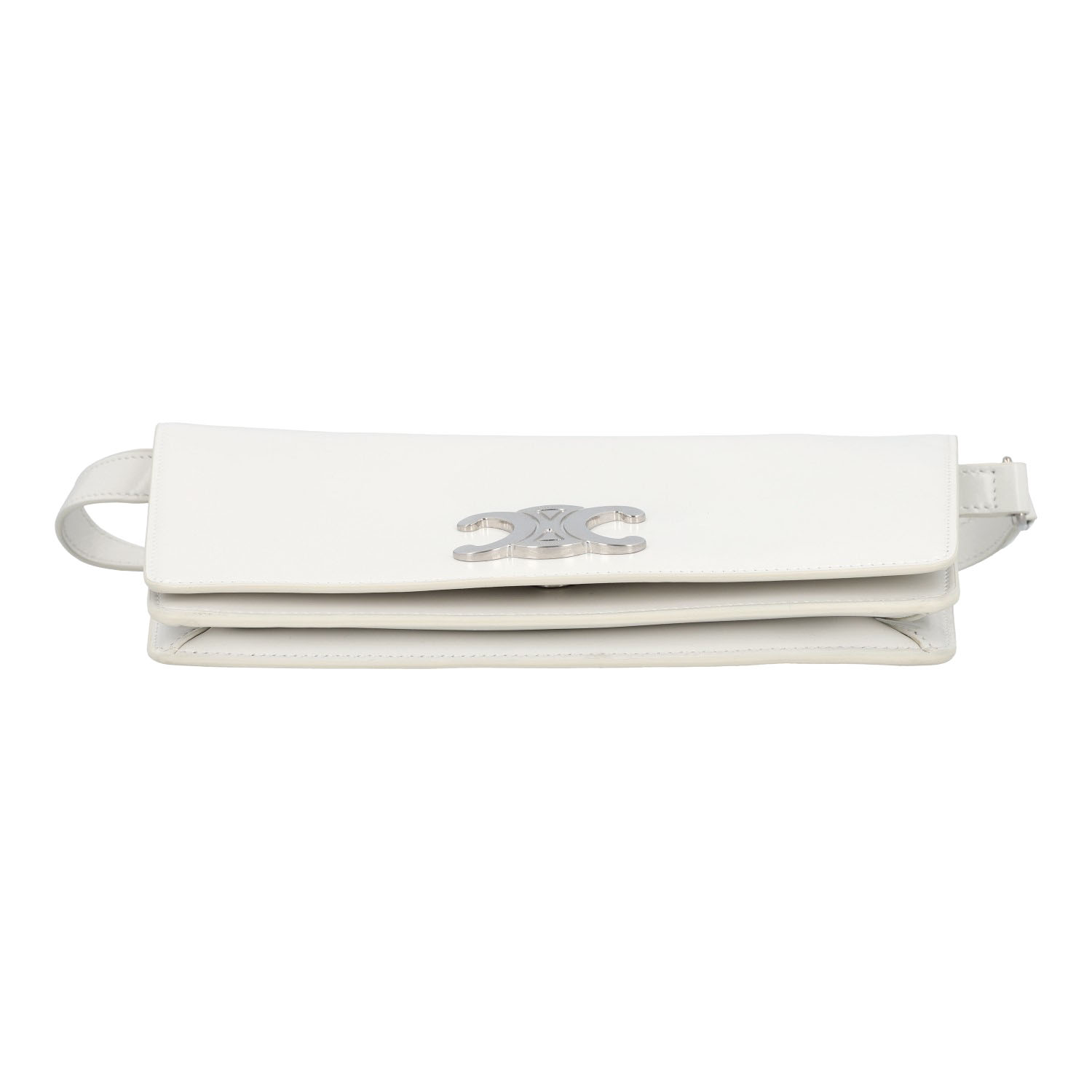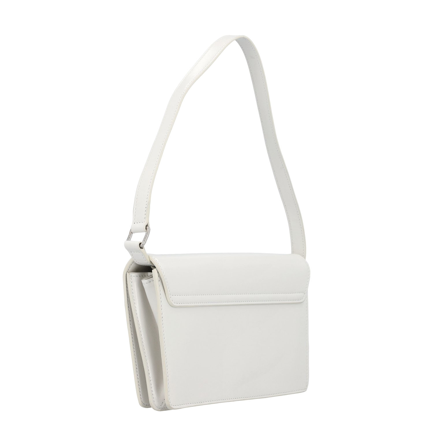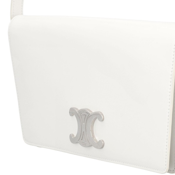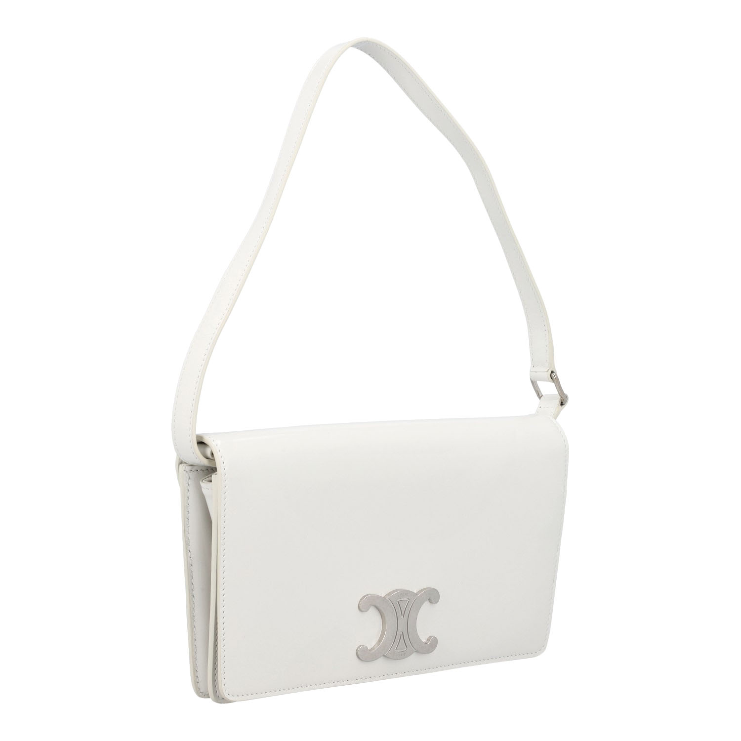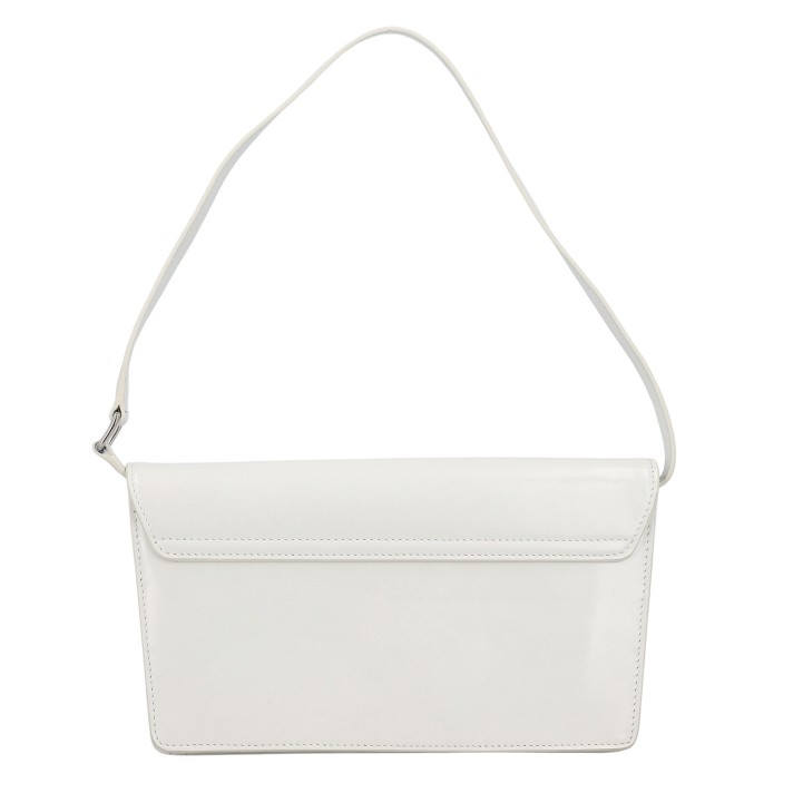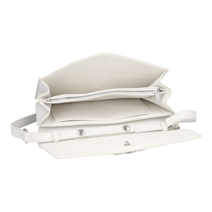 Weißes Glattleder mit silberfarbener Hardware, Logo-Dekor am Überschlag und abnehmbarem Schulterriemen.
