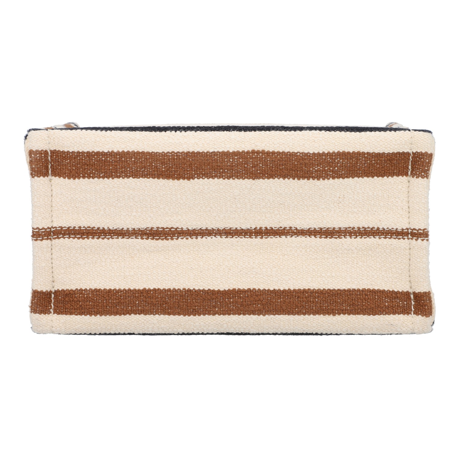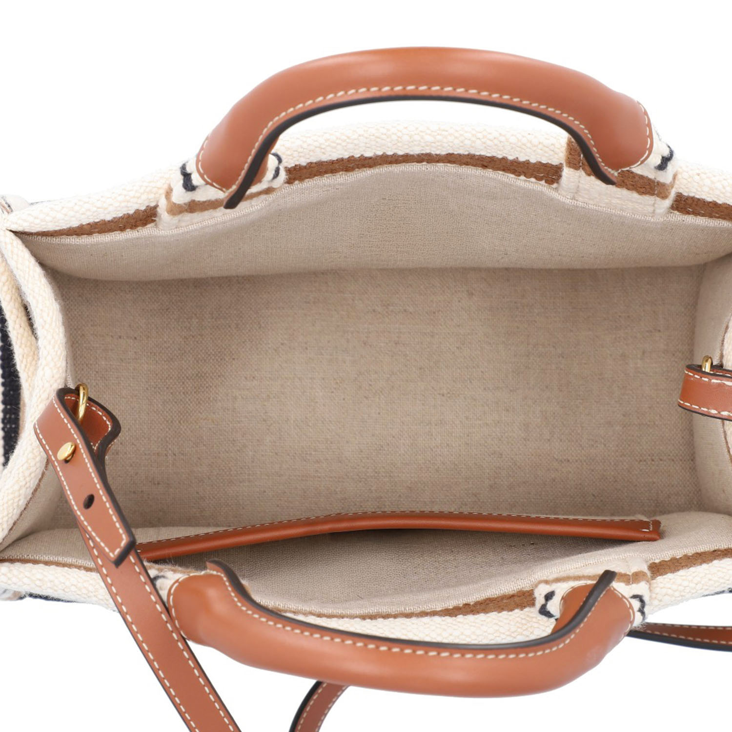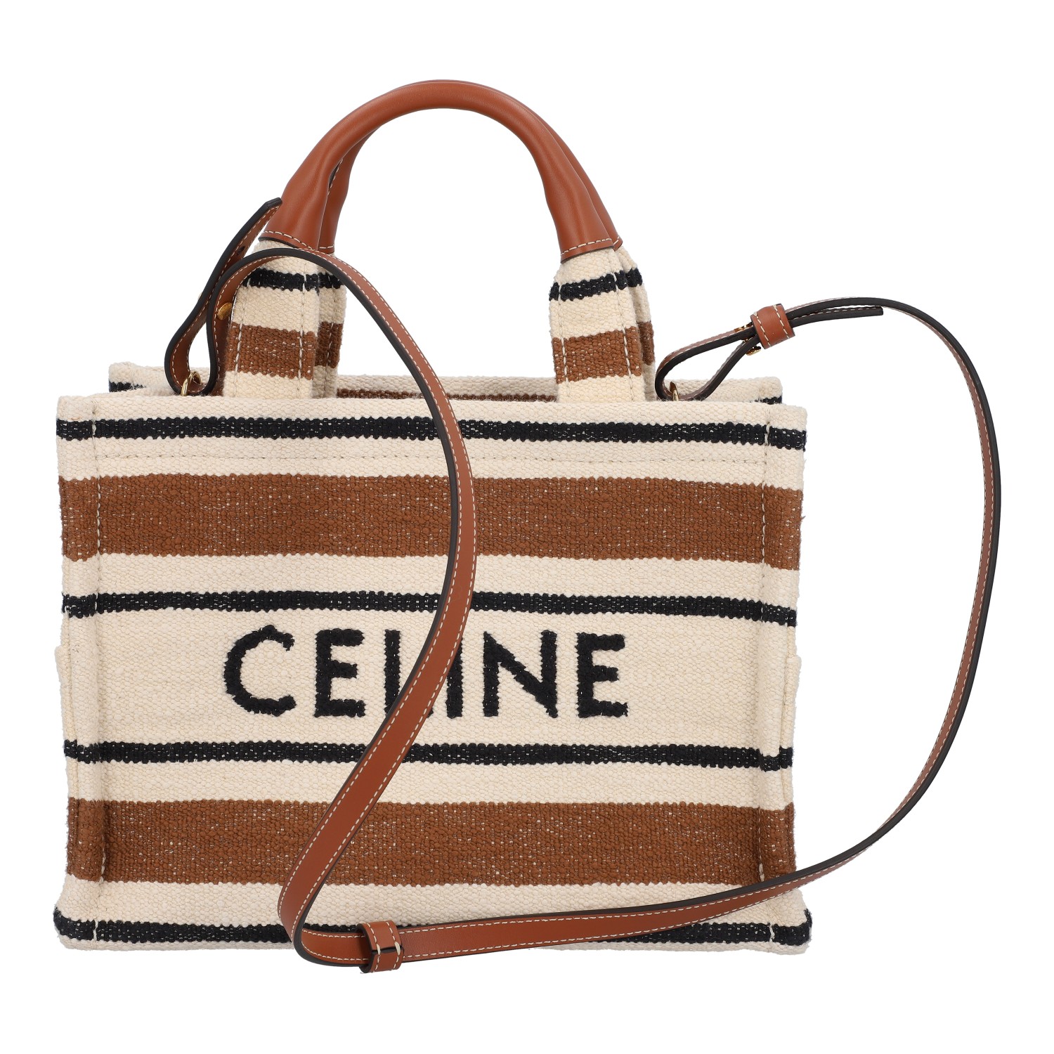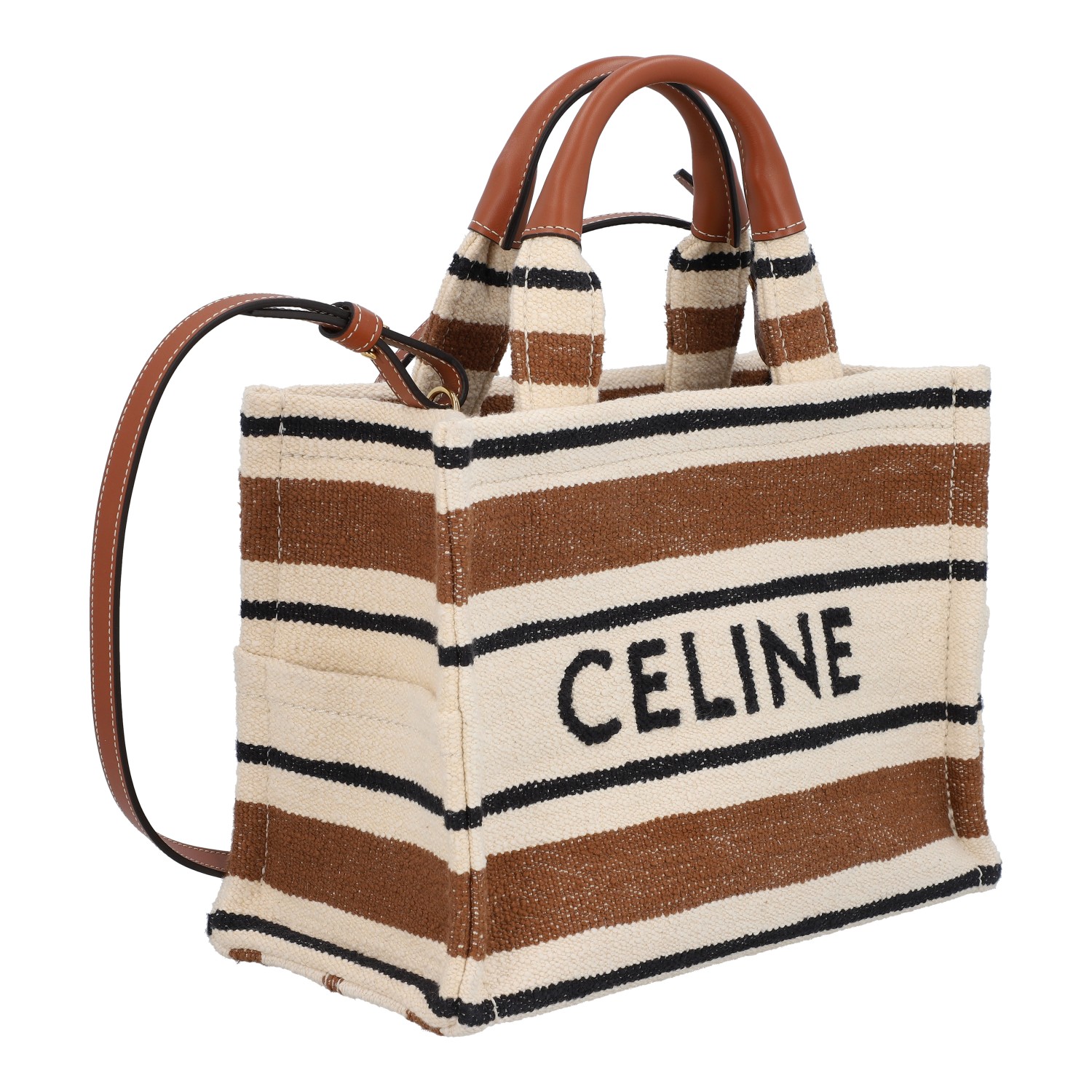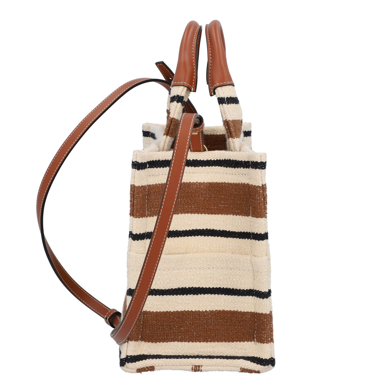 Gestreiftes Modell aus Textil mit eingewebtem Logo, Lederdetails in Cognacfarben, goldfarbener Hardware, Doppelhenkel, seitlichen Außenfächern und abnehmbarem Schulterriemen. Innenraum aus Leinen mit einem Fach. Box und Staubbeutel anbei. Sehr guter Zustand.