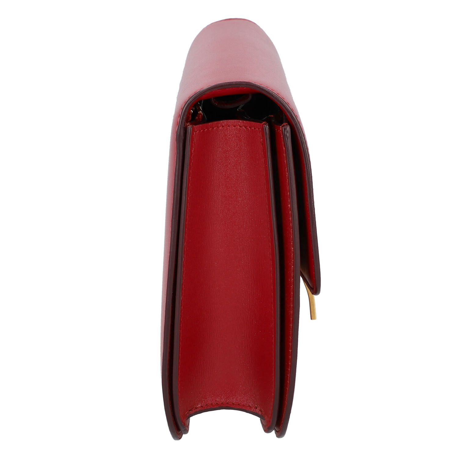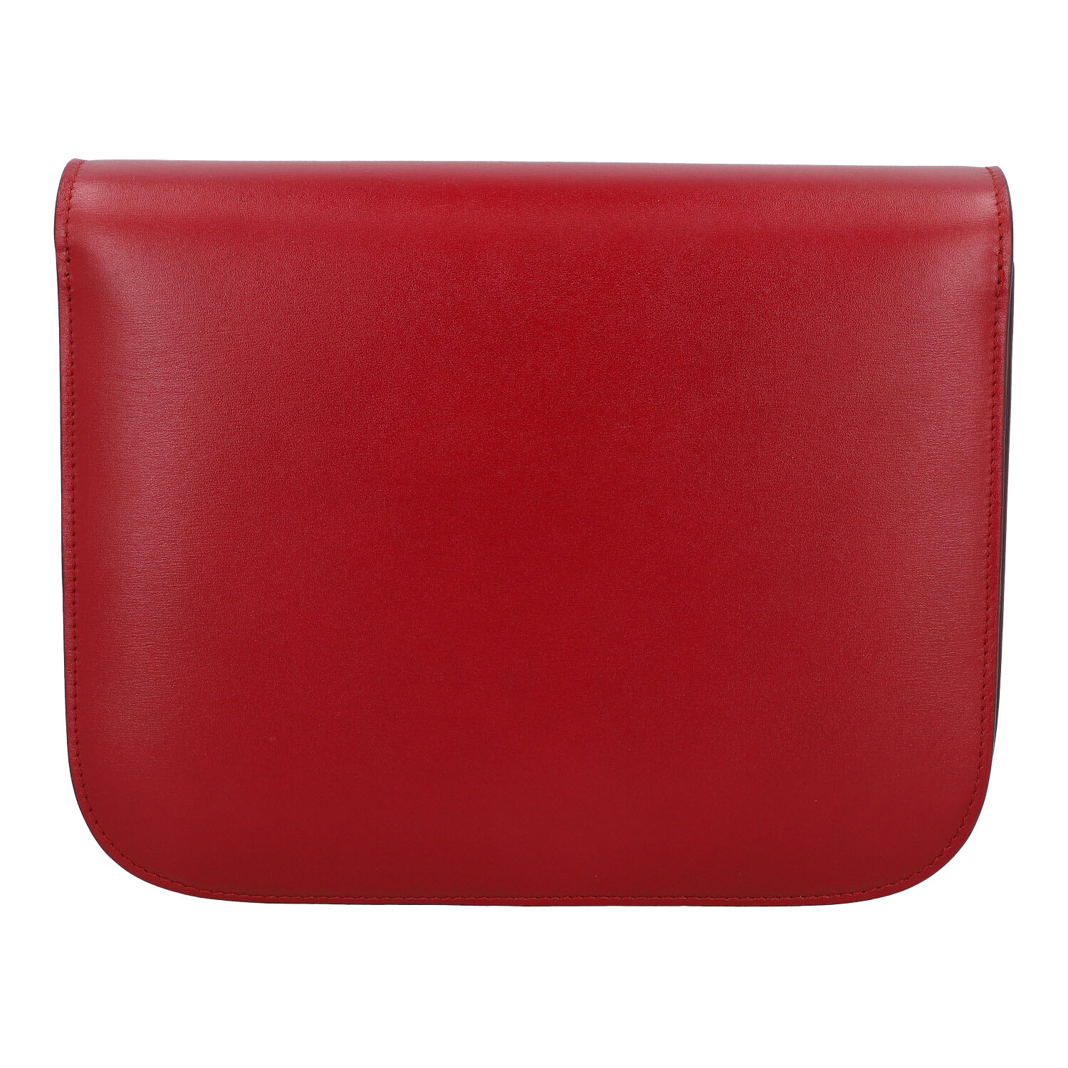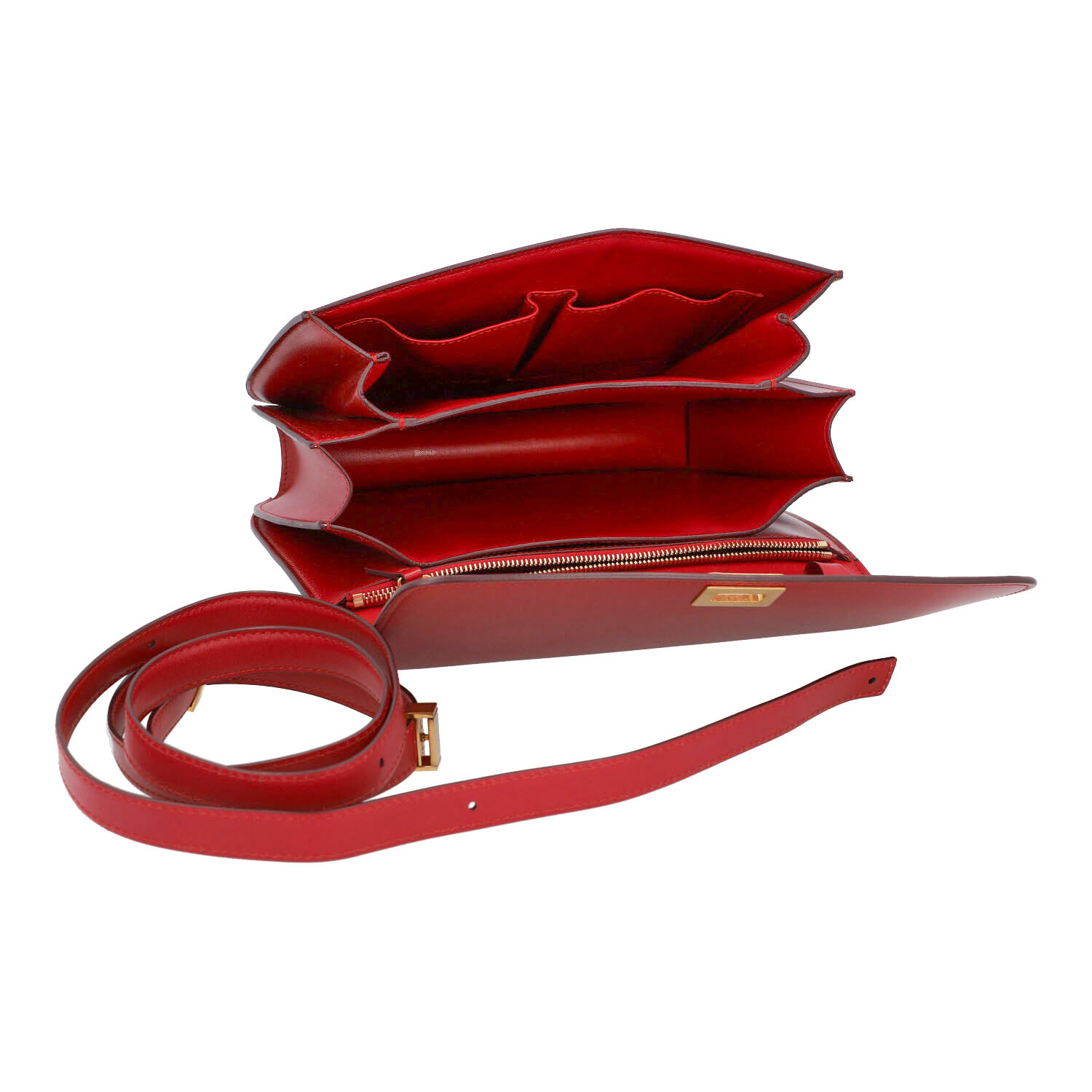 Box Kalbsleder in Rot mit goldfarbener Hardware, Überschlag mit Klappschließe, abnehm-, längenverstellbarer Schulterriemen. Innenraum aus Lammleder mit drei Abteilen, eines mit Reißverschluss und zwei Fächer. Staubbeutel anbei. Sehr guter Erhalt. 24 x 18 x 7 cm.