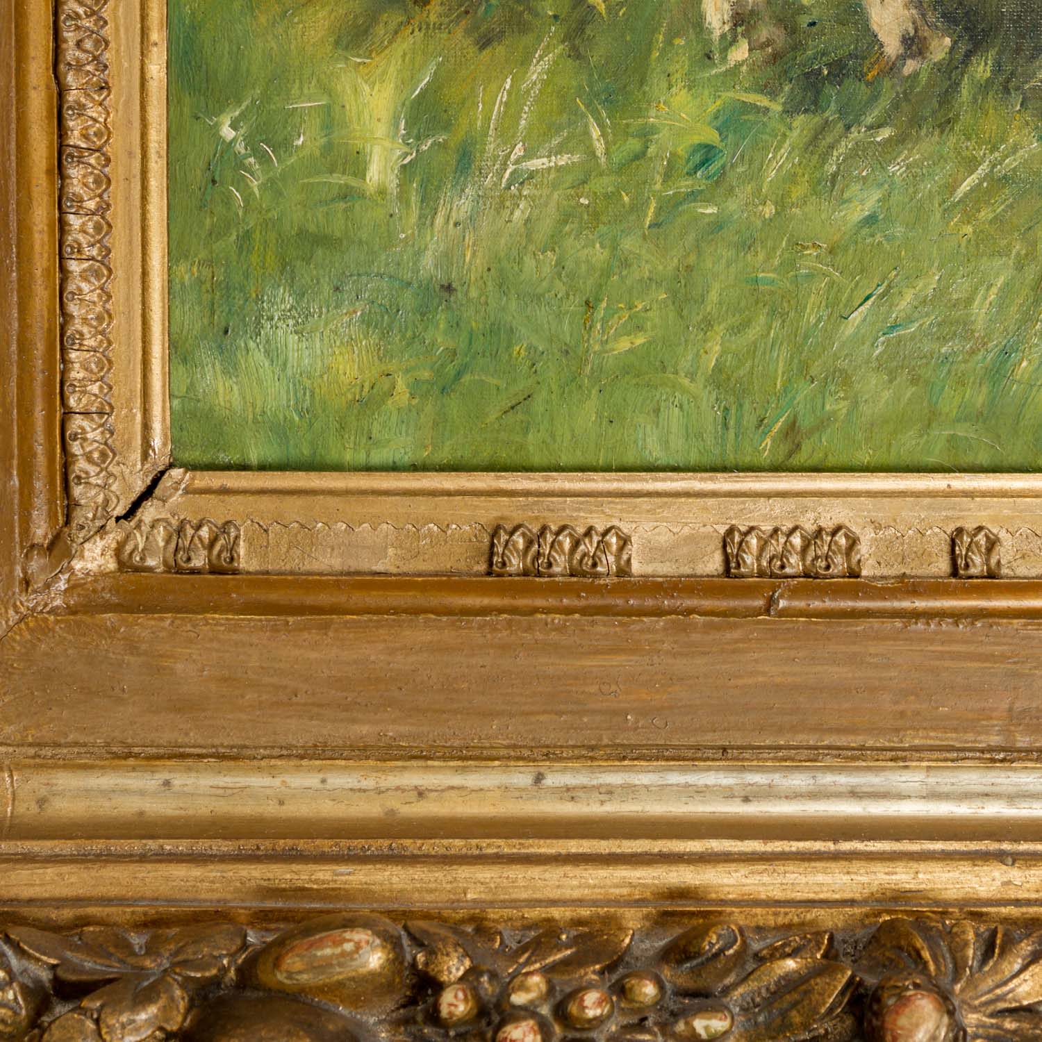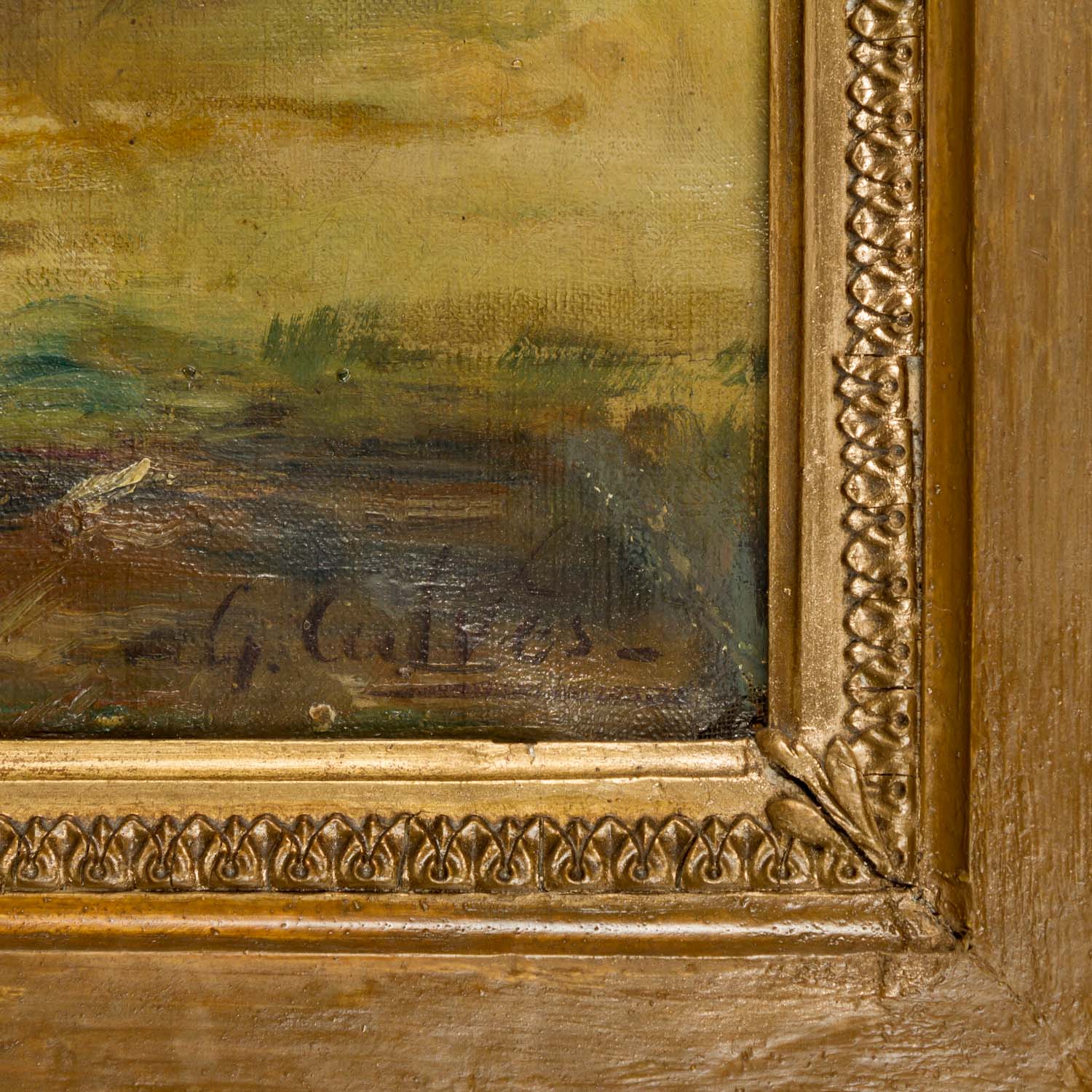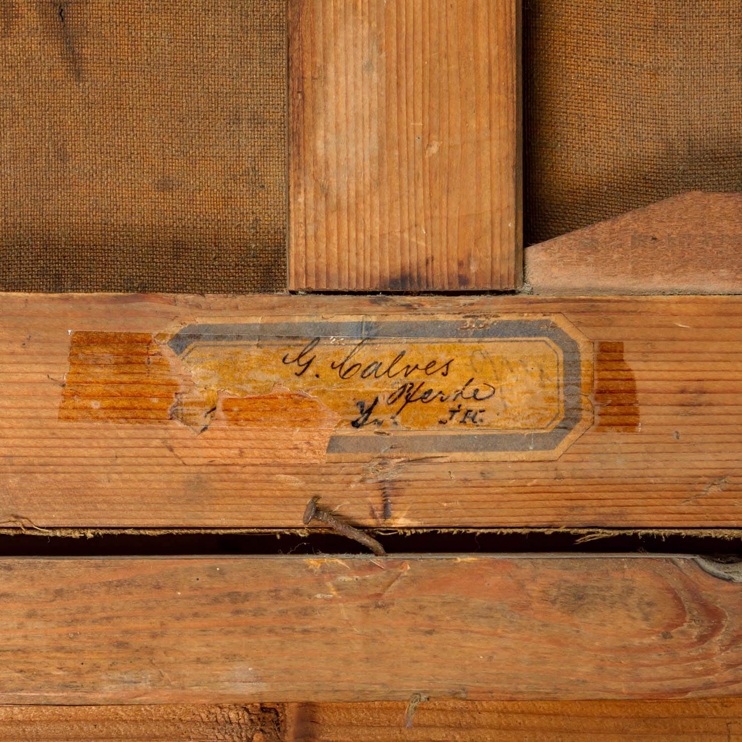 rechtsseitig ein Paar am Gartenzaun, u.re. signiert 'G. Calvés', Öl/Leinwand, HxB: ca. 54x73 cm (83x101 cm mit Rahmen). Lw. part. gewölbt, Craquelé und Farbberieb, alt restauriert und retuschiert. Mit Prunkrahmen (Holz mit stuckierter Früchtegirlande; tlw. beschädigt und überarb.). VERSO Reste eines Etiketts mit Künstlerbezeichnung.
