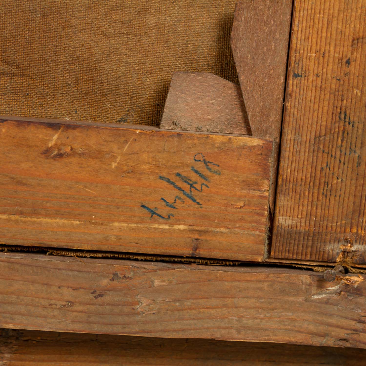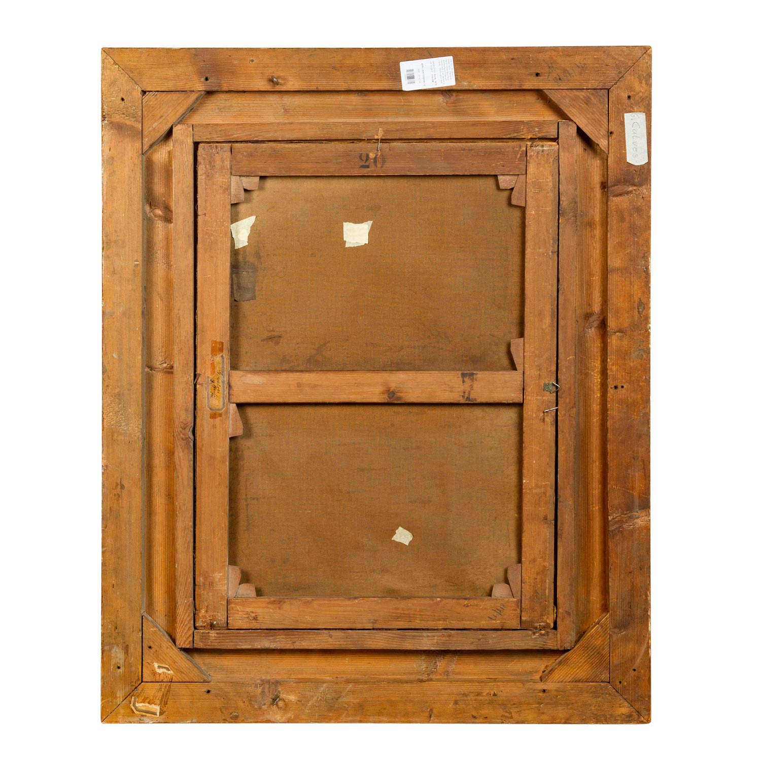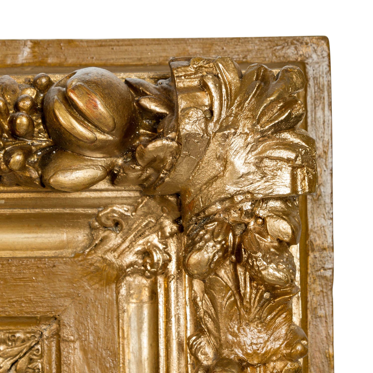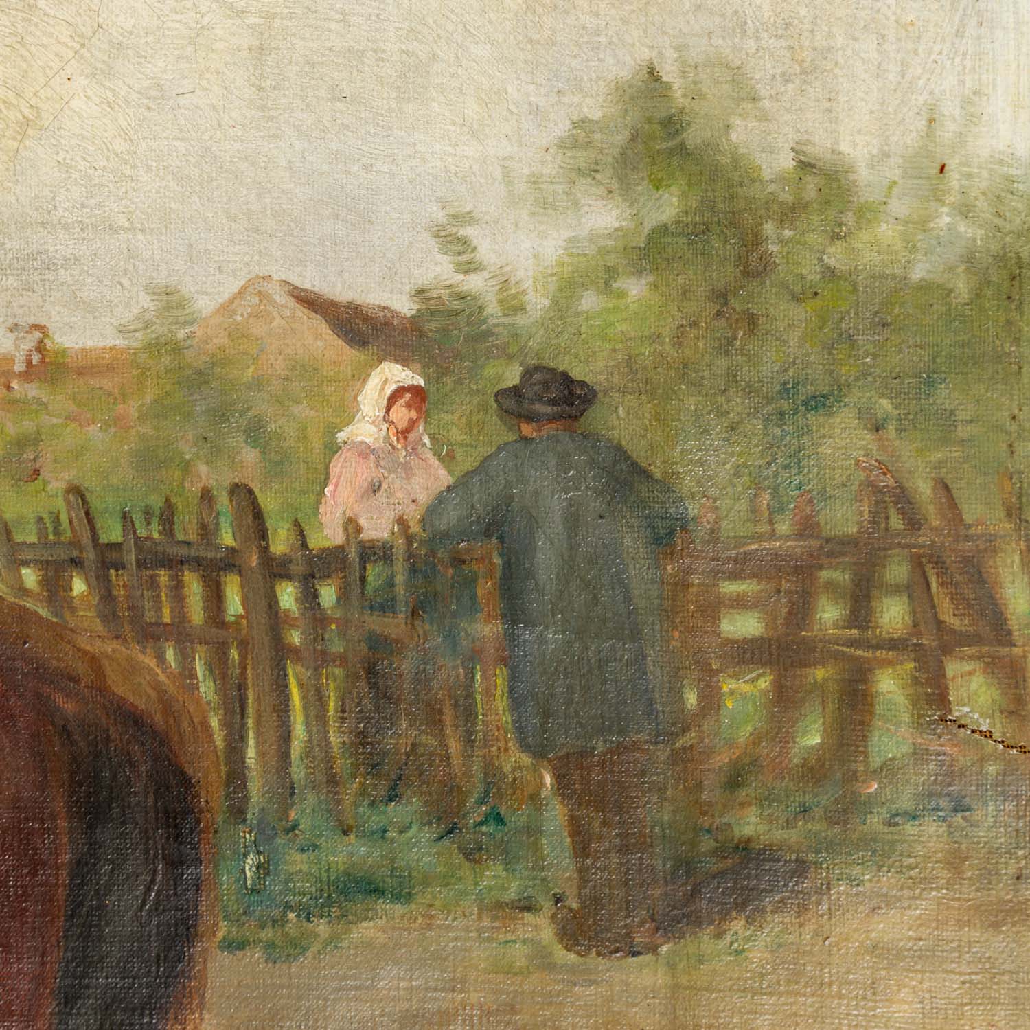 rechtsseitig ein Paar am Gartenzaun, u.re. signiert 'G. Calvés', Öl/Leinwand, HxB: ca. 54x73 cm (83x101 cm mit Rahmen). Lw. part. gewölbt, Craquelé und Farbberieb, alt restauriert und retuschiert. Mit Prunkrahmen (Holz mit stuckierter Früchtegirlande; tlw. beschädigt und überarb.). VERSO Reste eines Etiketts mit Künstlerbezeichnung.