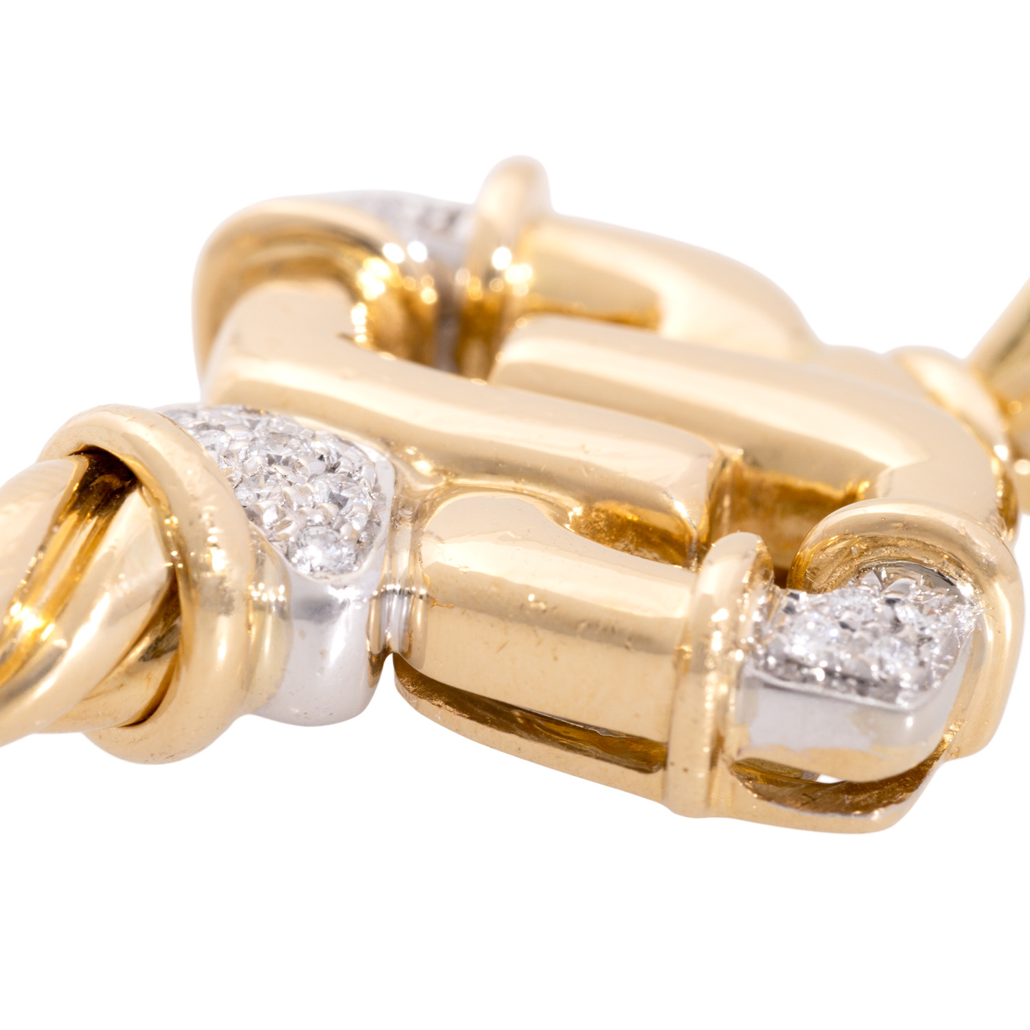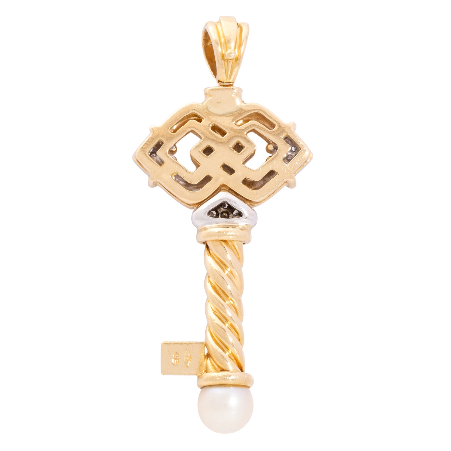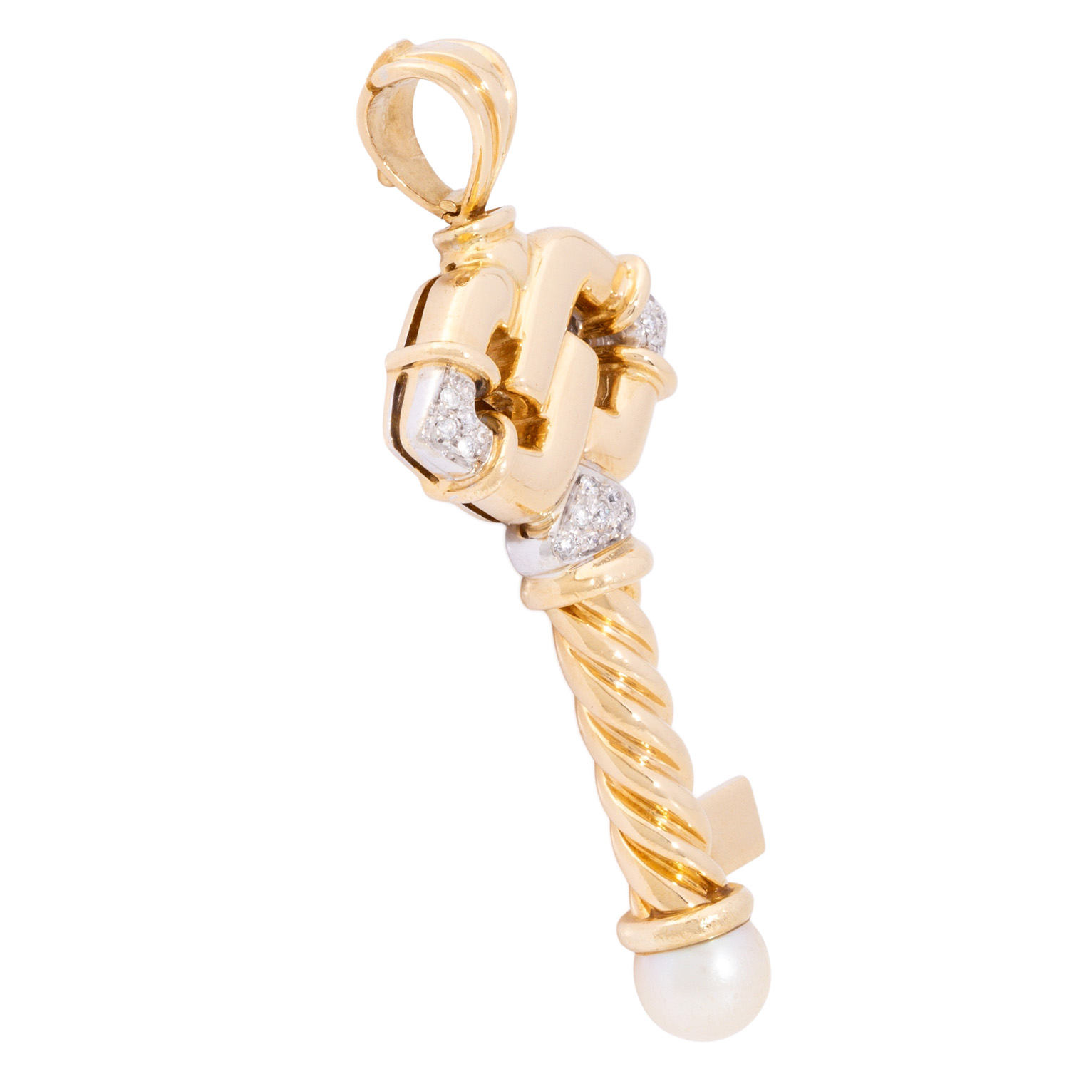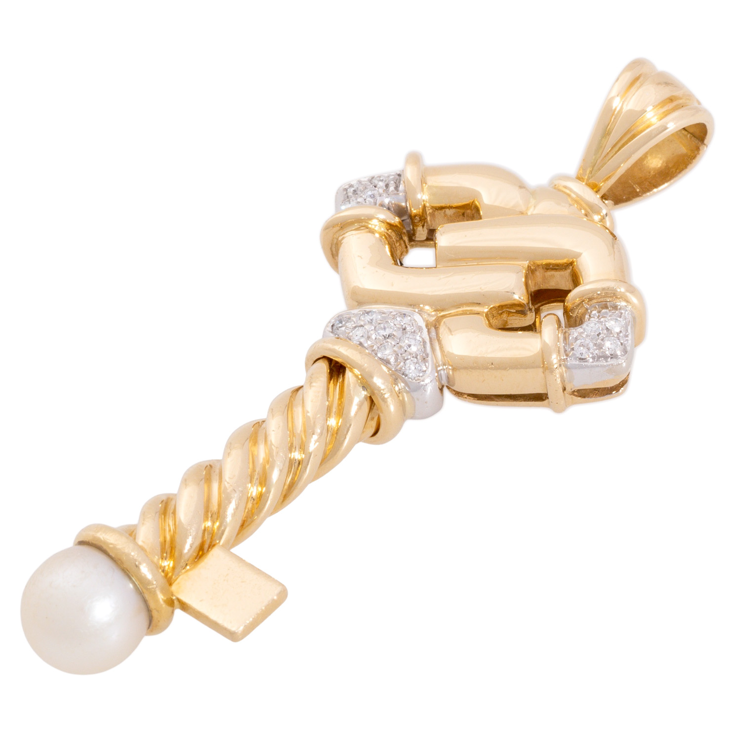 mit Brillanten von zus. ca. 0,15 ct, gute Farbe und Reinheit und 1 Zuchtperle (abgenutzt), GG/WG 18K, 21,5 g, 6,5 x 2,8 cm, 2. H. 20. Jh., starke Tragespuren, punziert 'CB', schöne Verarbeitung. (26f)