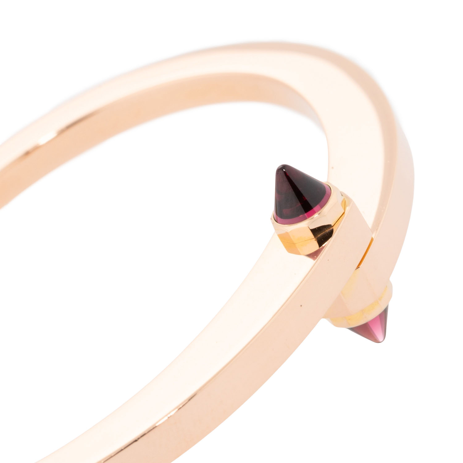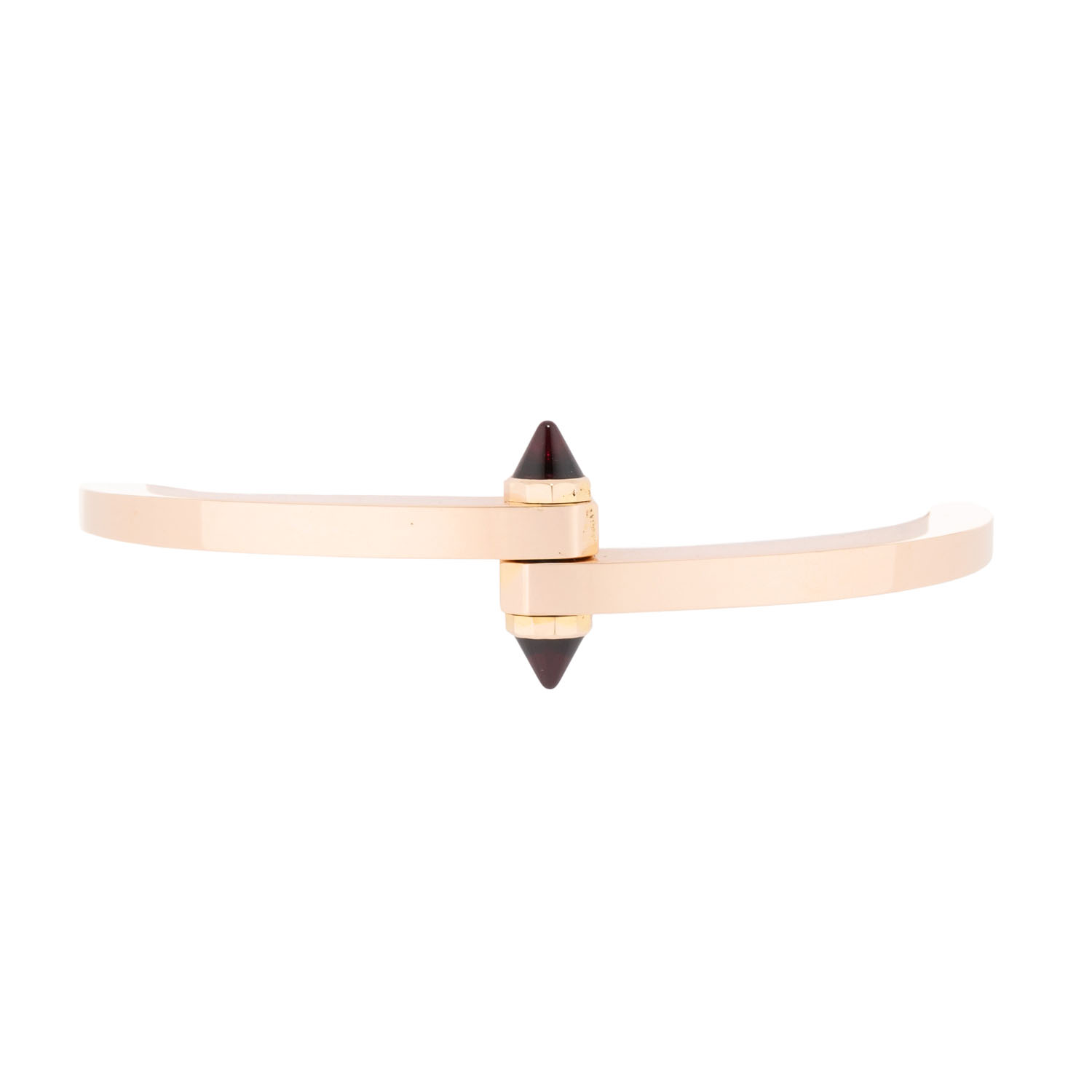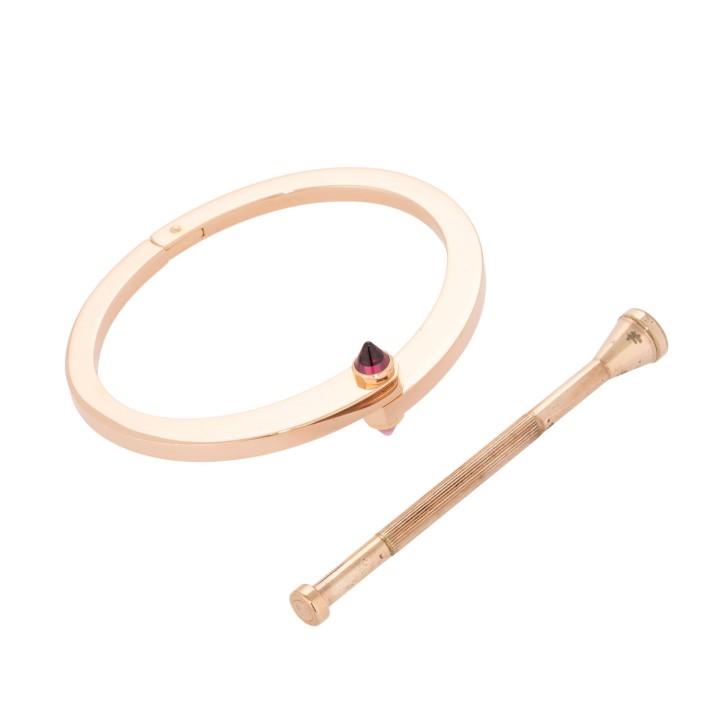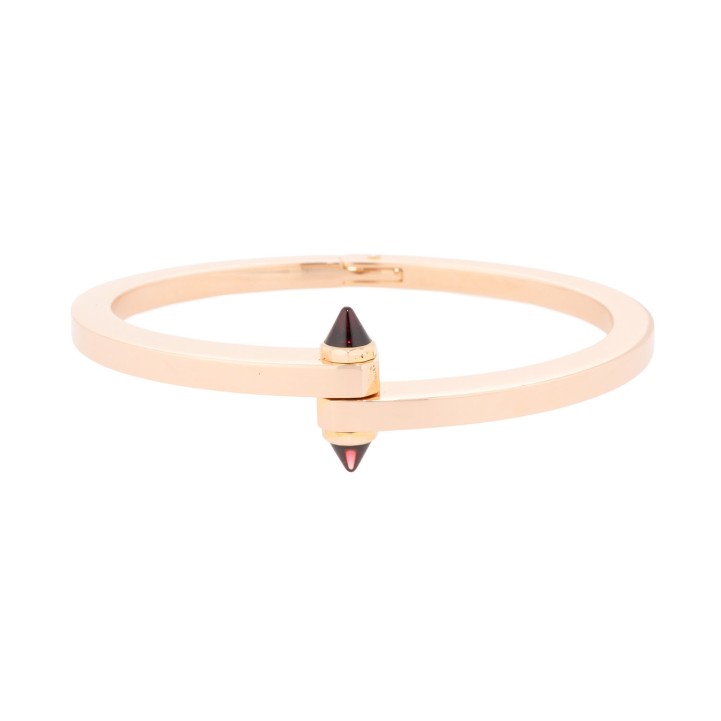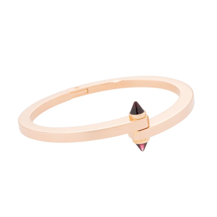 akzentuiert durch pyramidenförmige Rhodolith-Steine, Roségold 18K, 48,9 g, Innenumfang ca. 15,5 cm. ca. 1990er, Tragespuren, signiert Cartier, mit originalem Schraubendreher.