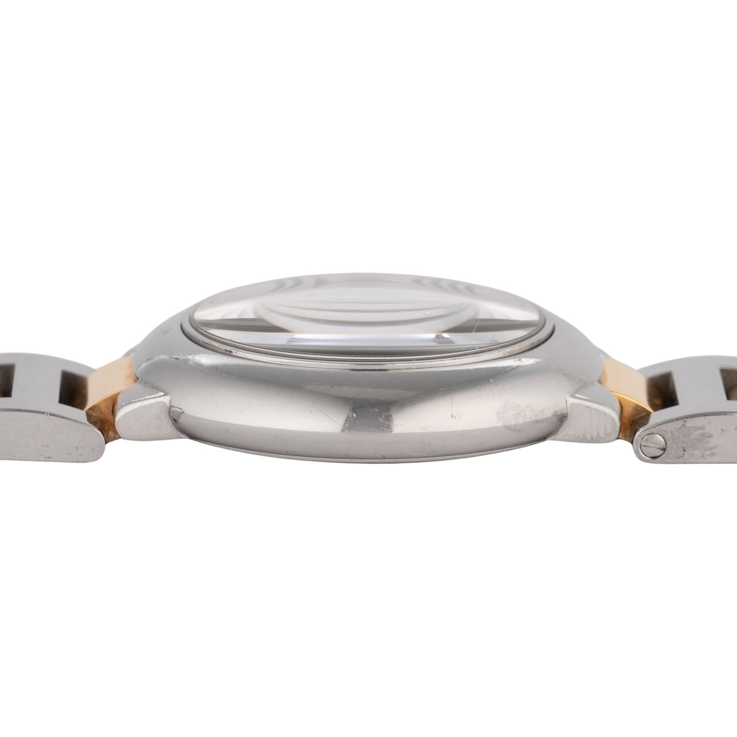 Edelstahl / Gelbgold 18K. Seriennummer 472156RX. Quarzwerk Kal. 057 in funktionsfähigem Zustand. Neue Batterie. Silberfarbenes Zifferblatt mit römischen Ziffern und Datumsanzeige. Gebläute Zeiger. Krone mit blauem Spahir Cabochon. Cartier Armband aus Edelstahl / 18K Gelbgold mit Faltschließe. Gebraucht, sichtbare Tragespuren am Gehäuse, Armband und Glas. Durchmesser ca. 28 mm (gemessen ohne Krone). Passend bis zu ca. 15,5 cm Handgelenkumfang.