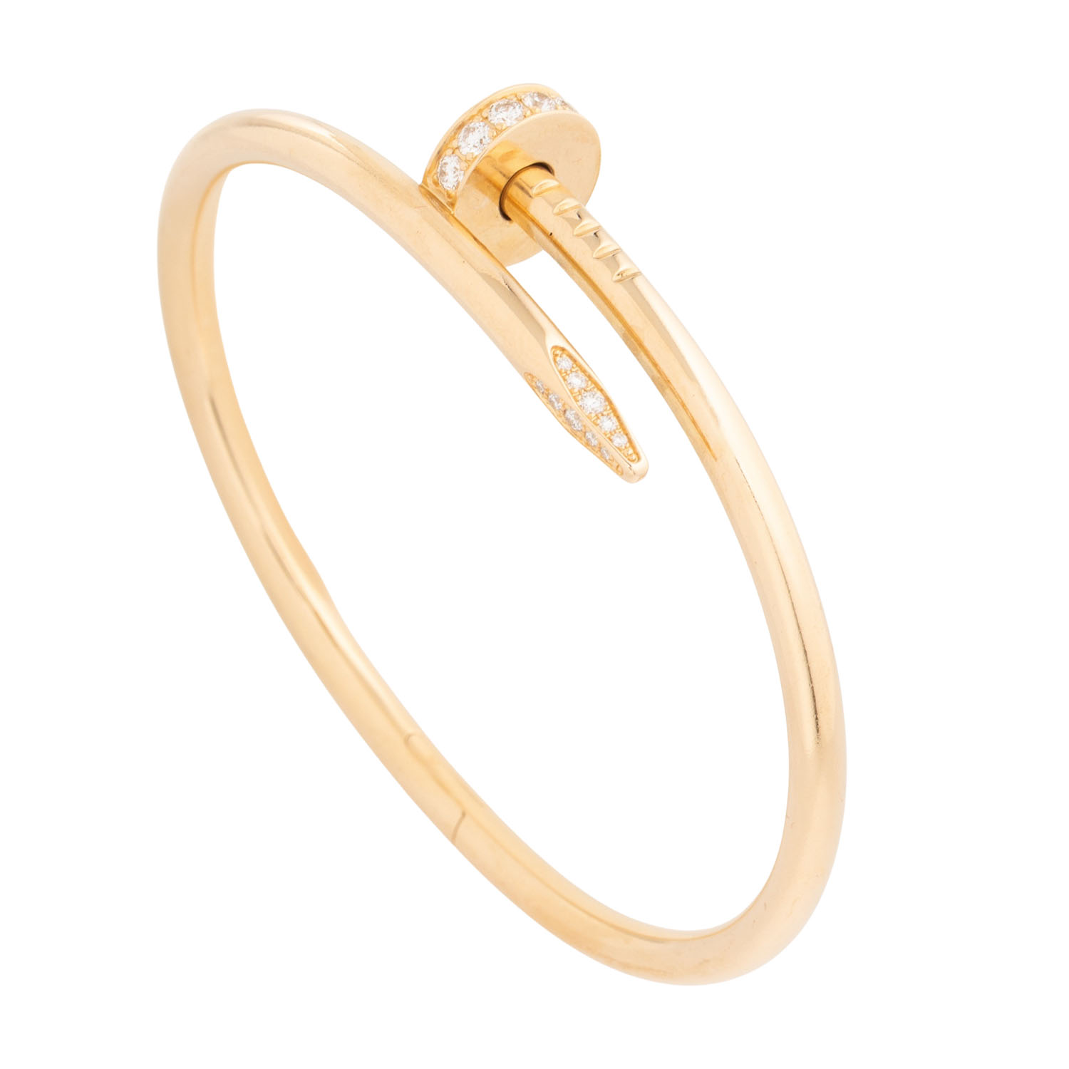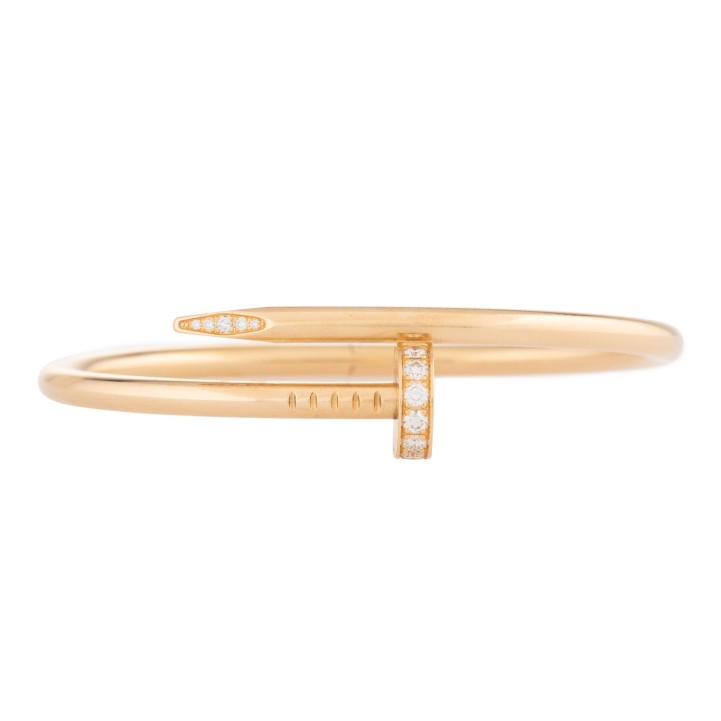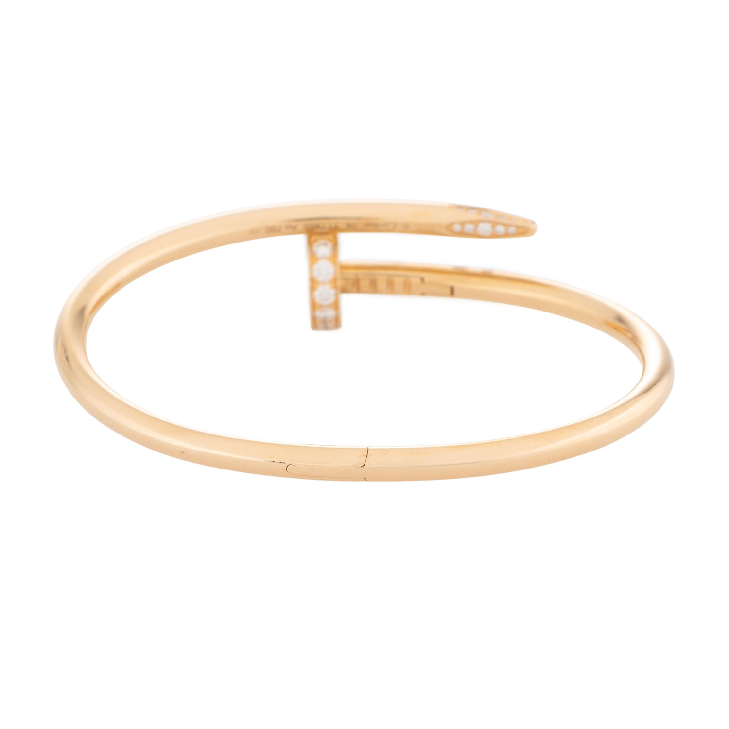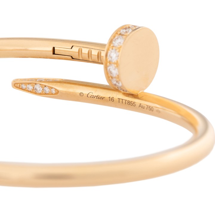 mit 32 Diamanten im Brillantschliff von zus. 0,58 ct, gute Farbe und Reinheit, GG 18 K, 30,7 g, IU: 17,5 cm, NP: 14.600 €, 21. Jh., guter Zustand. Original Cartier-Schmucketui mit Außenverpackung, Samttasche und Zertifikat anbei.