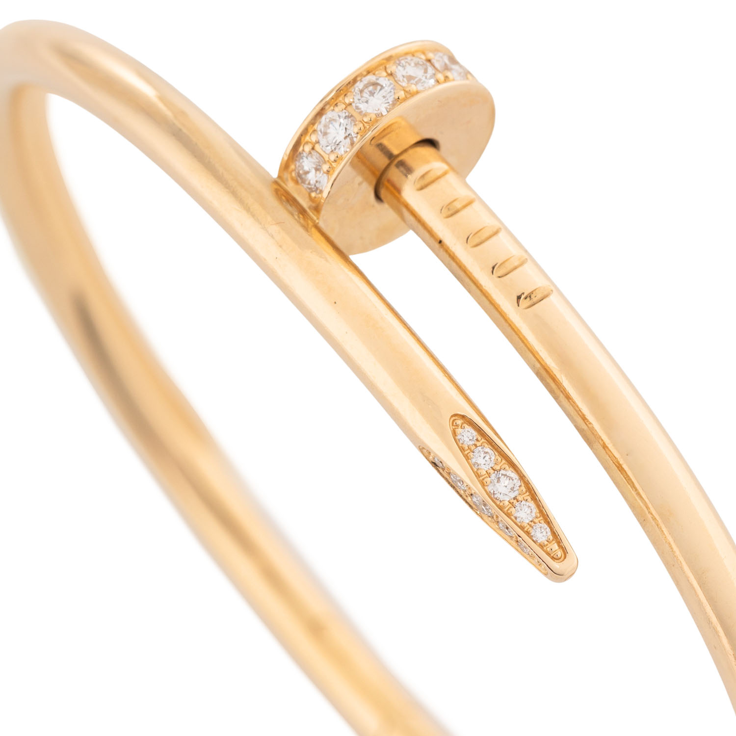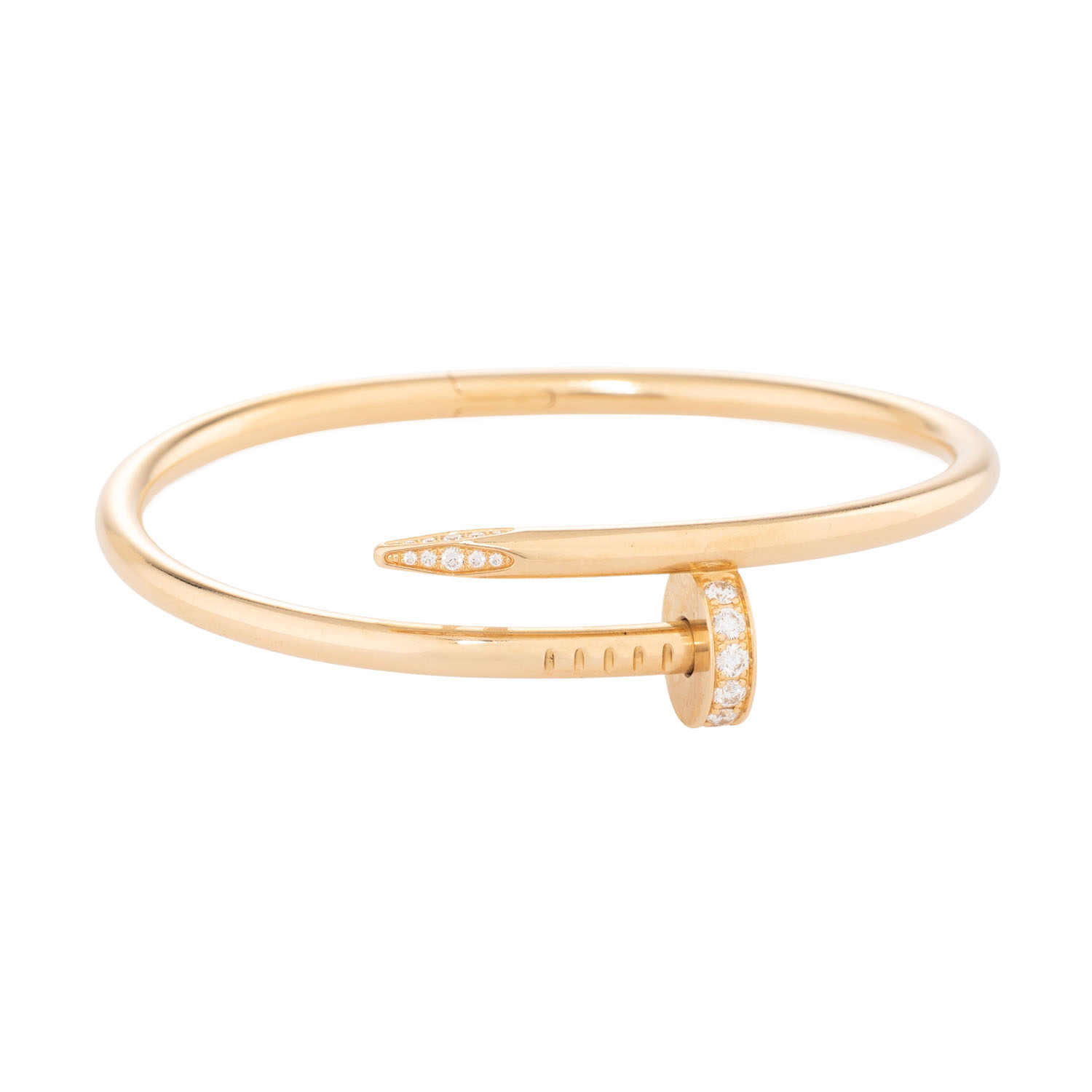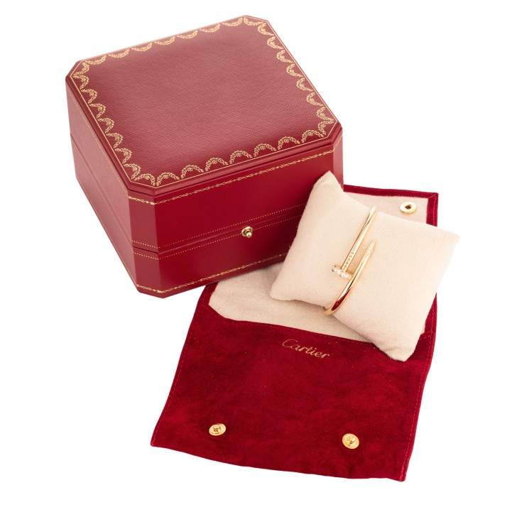 mit 32 Diamanten im Brillantschliff von zus. 0,58 ct, gute Farbe und Reinheit, GG 18 K, 30,7 g, IU: 17,5 cm, NP: 14.600 €, 21. Jh., guter Zustand. Original Cartier-Schmucketui mit Außenverpackung, Samttasche und Zertifikat anbei.