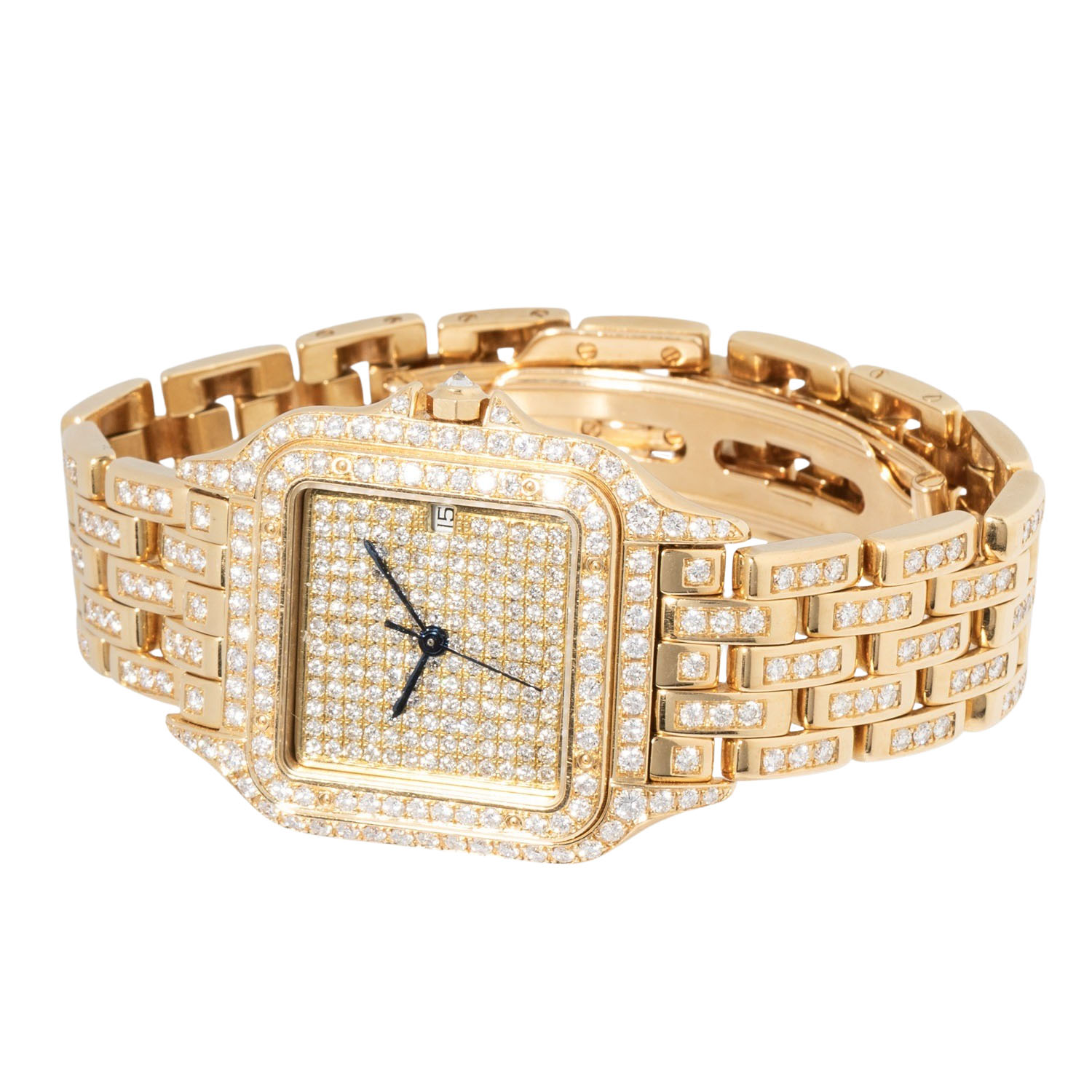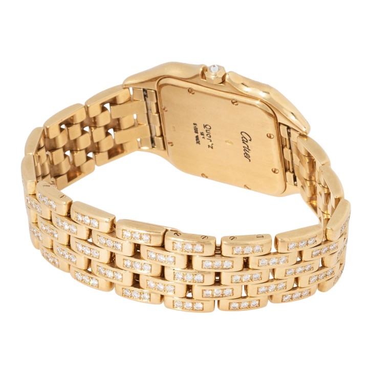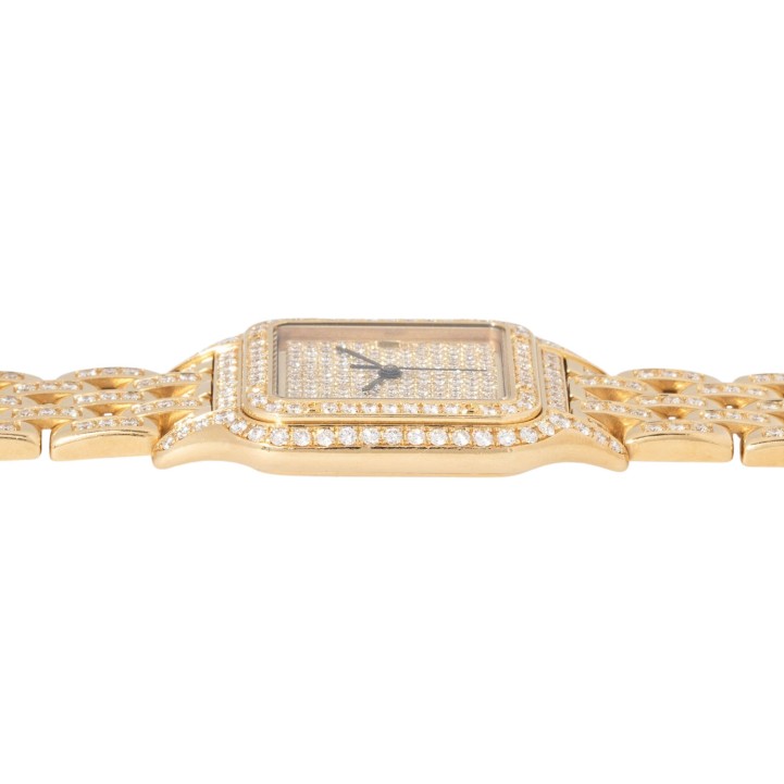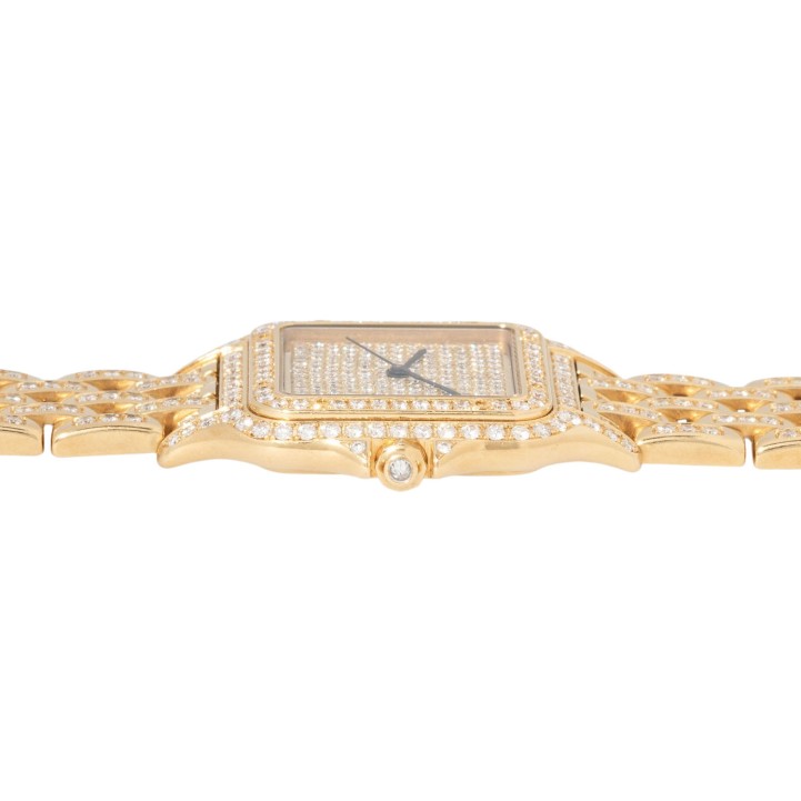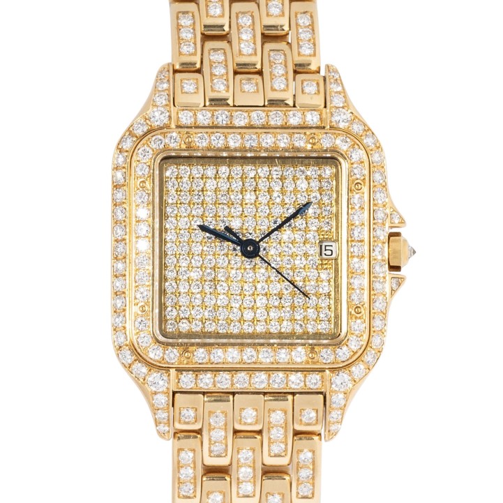 Gelbgold 18K. Gehäusenummer 682485. Quarzwerk in funktionsfähigem Zustand. Neue Batterie. Diamanten Zifferblatt (Aftermarked) mit Datumsanzeige. Gebläute Zeiger. Die Krone ist mit einem Diamanten besetzt. Cartier Armband in 18K Gelbgold mit Diamantenbesatz (Aftermarked) und Faltschließe. Die Lünette ist mit Factory Diamanten besetzt. Das Gehäuse um die Lünette herum und an den Bandanstößen ist ebenfalls mit Factory Diamanten besetzt. Guter Zustand mit Tragespuren. Durchmesser ca. 27,5 mm (gemessen ohne Krone). Passend bis zu ca. 15 cm Handgelenkumfang.