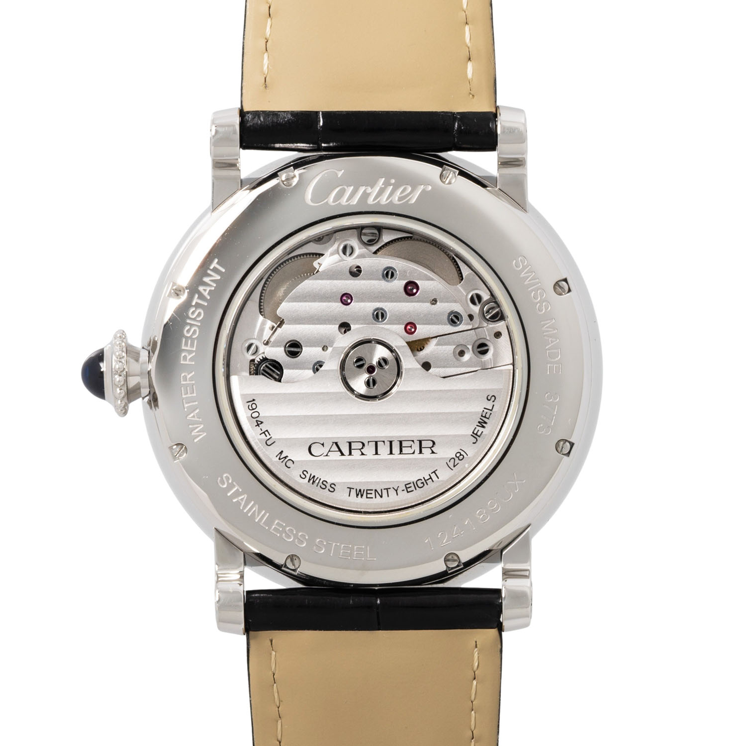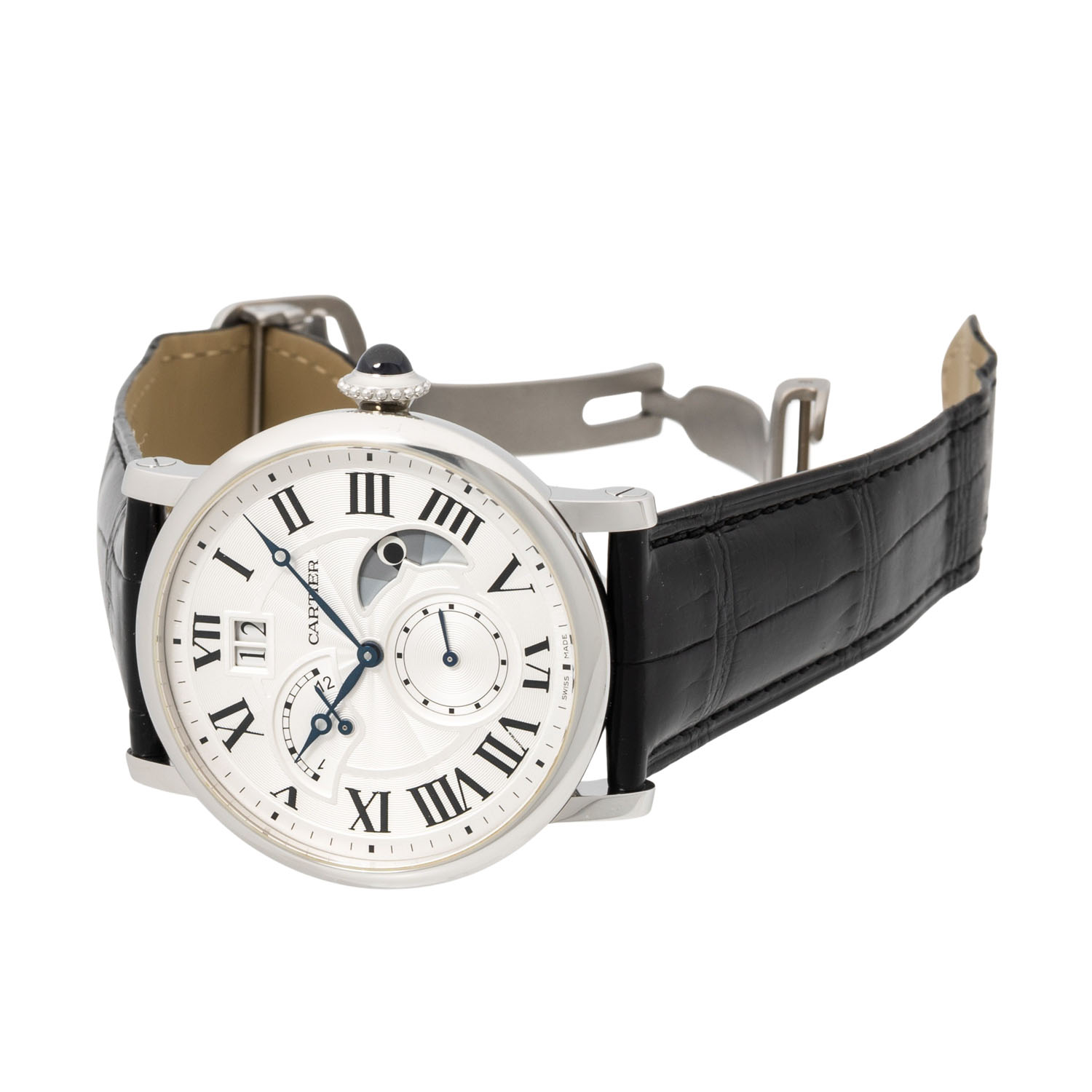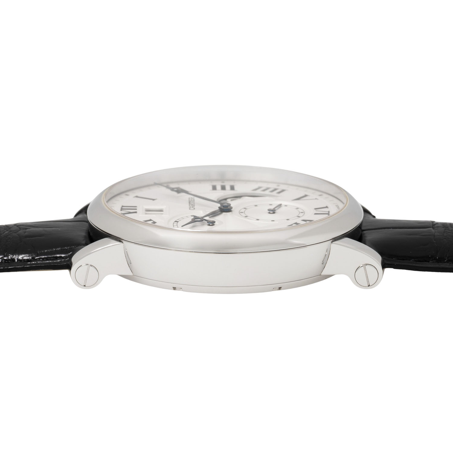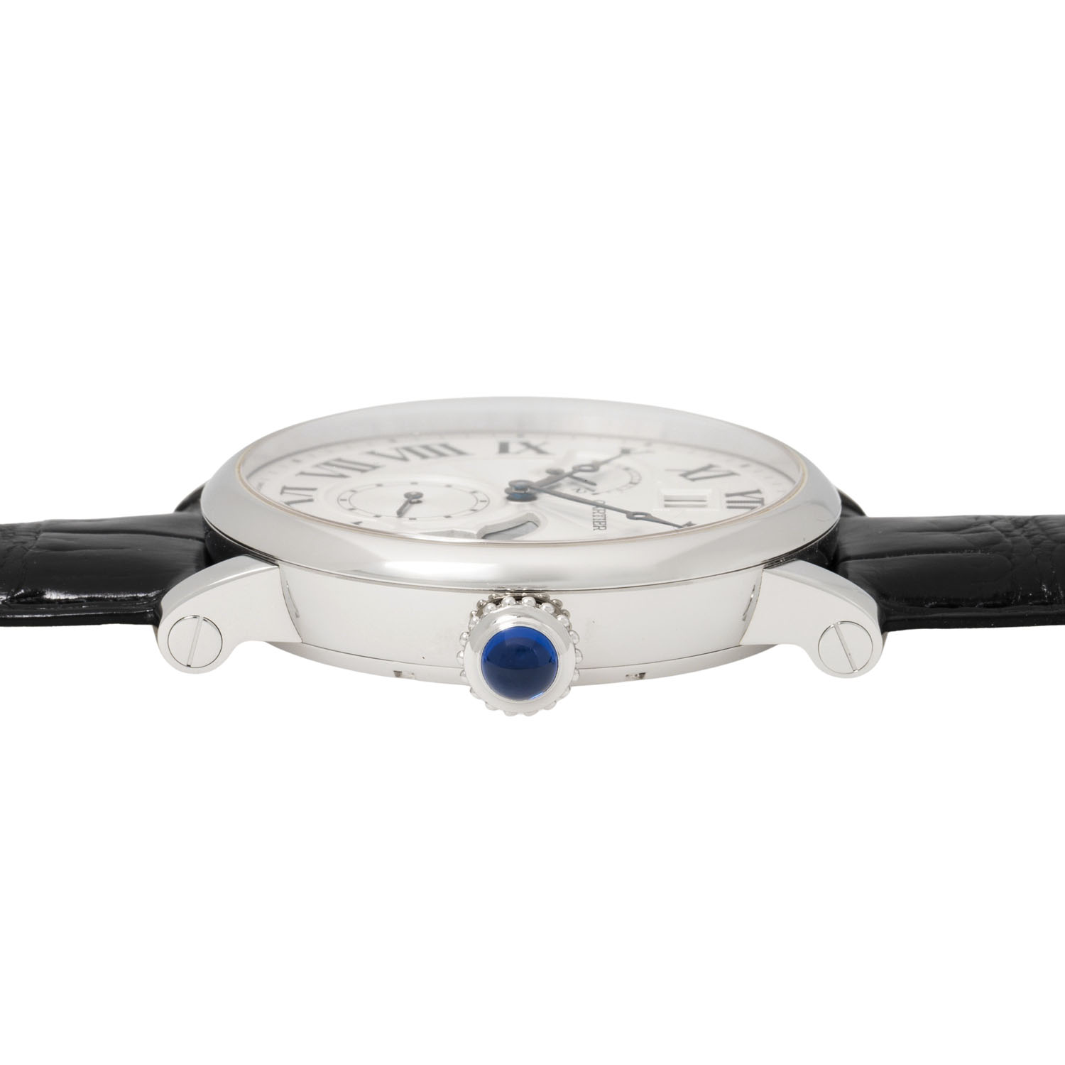 Edelstahl. Glasboden. Automatik-Werk Kal. 1904-FU MC mit sehr guten Gangwerten (+3 s/d, 273° Amplitude). Versilbertes, guillochiertes Zifferblatt mit römischen Ziffern, retrograder, zweiter Zeitzone bei 10 Uhr, Tag- und Nachtanzeige bei halb 3 und großer Datumsanzeige bei 12 Uhr. Gebläute Zeiger. Krone mit blauem Saphir Cabochon. Cartier Lederband mit Faltschließe. Sehr guter Zustand mit leichten Tragespuren. Mappe mit Anleitung und Garantieheft inkl. Garantiezertifikat anbei. Gekauft im Oktober 2014 in der Cartier Boutique Marina Bay Sands in Singapur. Durchmesser ca. 42 mm (gemessen ohne Krone). Passend bis zu ca. 20 cm Handgelenkumfang.