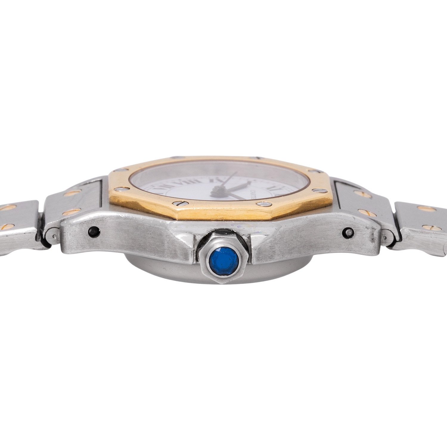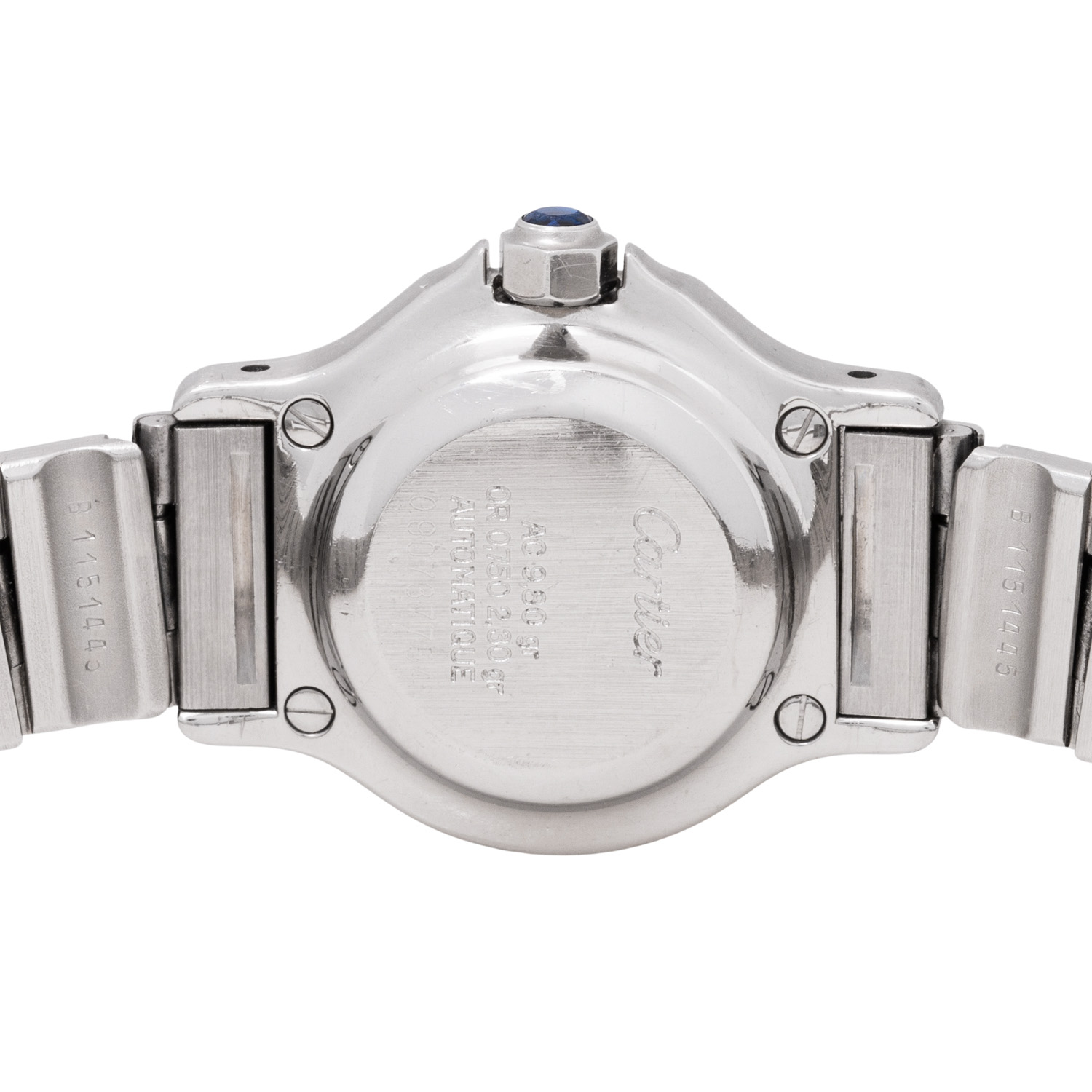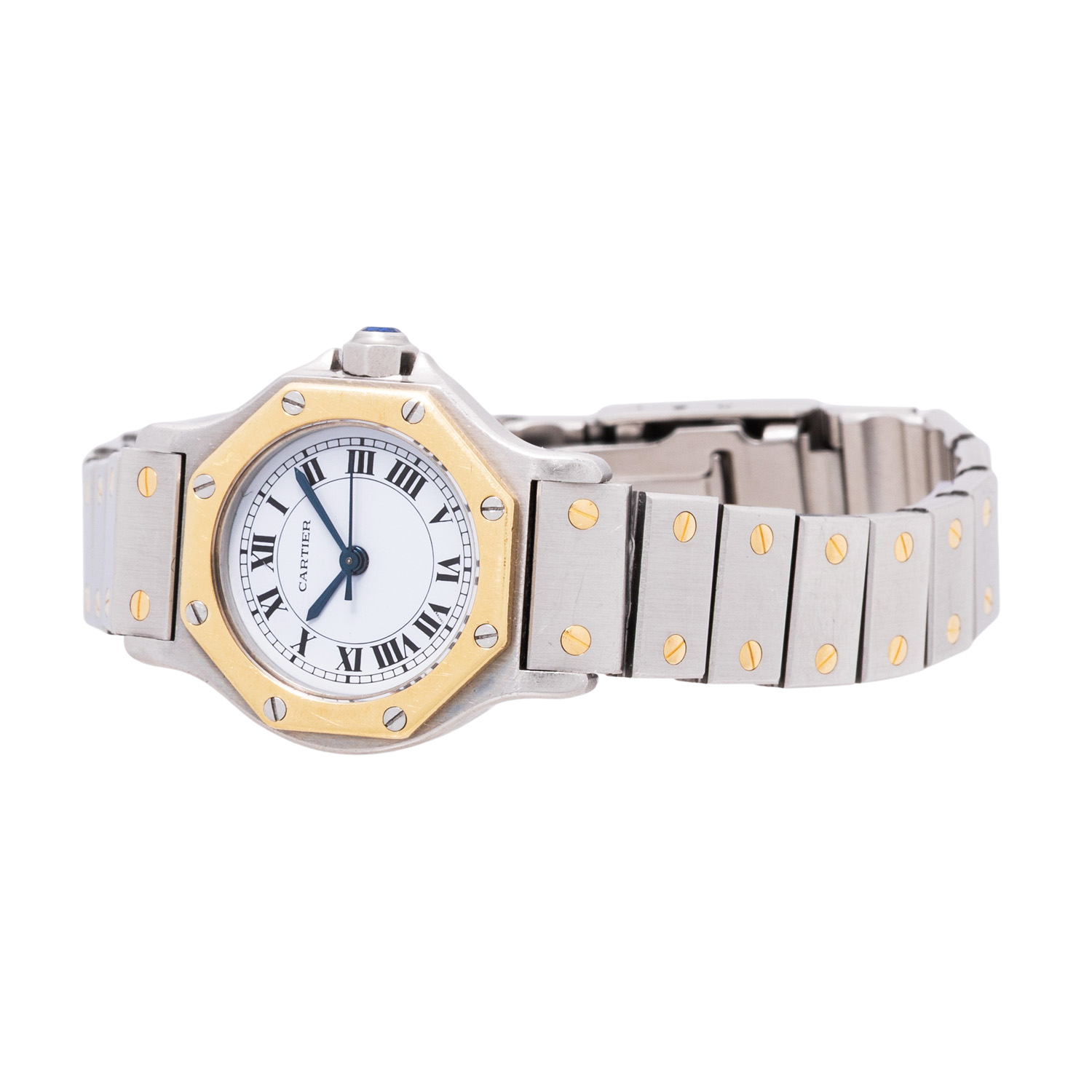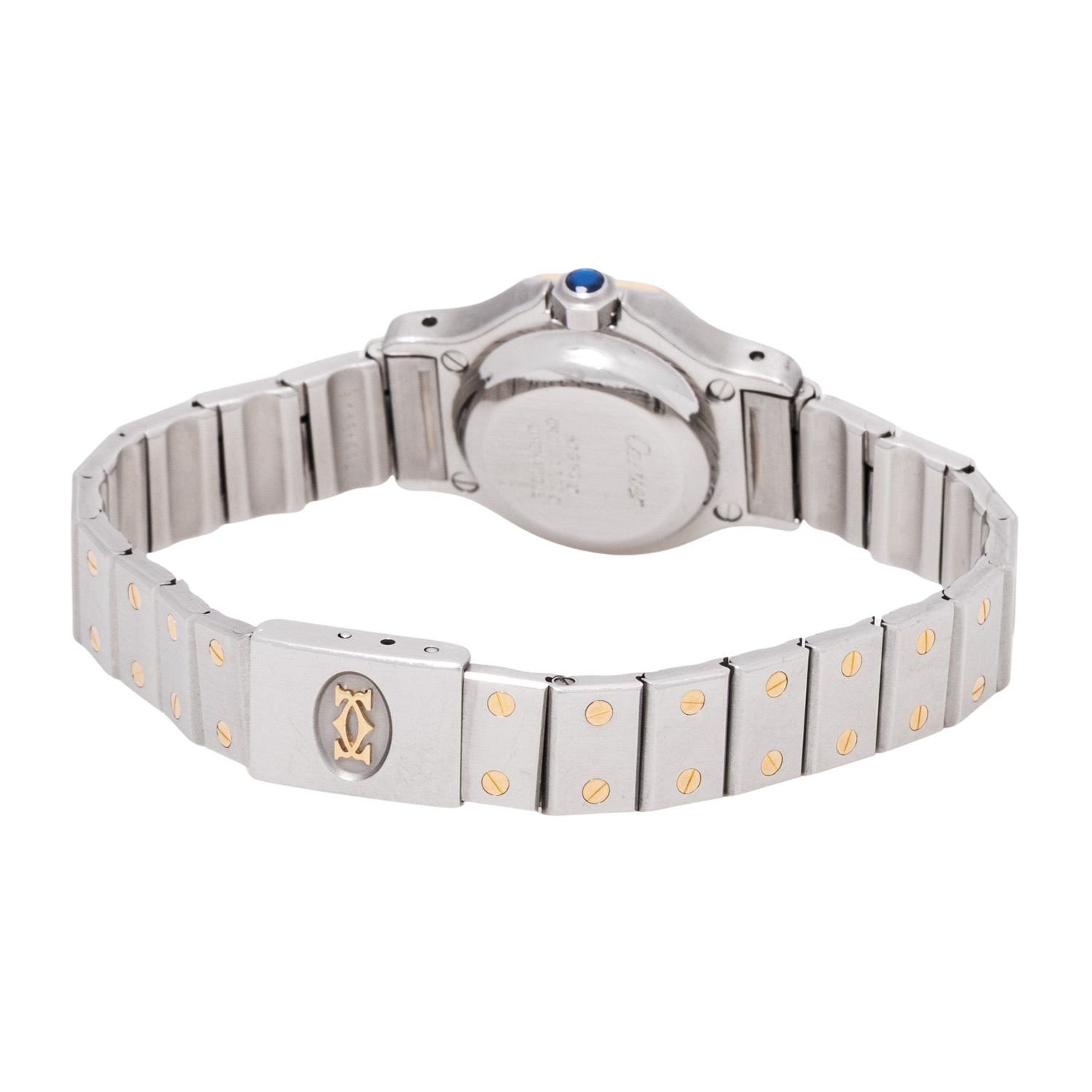 Edelstahl / Gelbgold 18K. Automatik-Werk Kal. 076. Gangwerte (+3s/d. 196°). Weißes Zifferblatt mit römischen Ziffern. Gebläute Zeiger. Krone mit blaue Saphir Cabochon. Cartier Armband in Edelstahl / Gelbgold (mit Stretch) 18K mit Faltschließe. Guter Zustand mit sichtbaren Tragespuren am Gehäuse, Lünette und Armband. Cartier Garantiekarte vom Kauf im Mai 1982 anbei. Durchmesser ca. 25 mm (gemessen ohne Krone). Passend bis zu ca. 17 cm Handgelenkumfang.