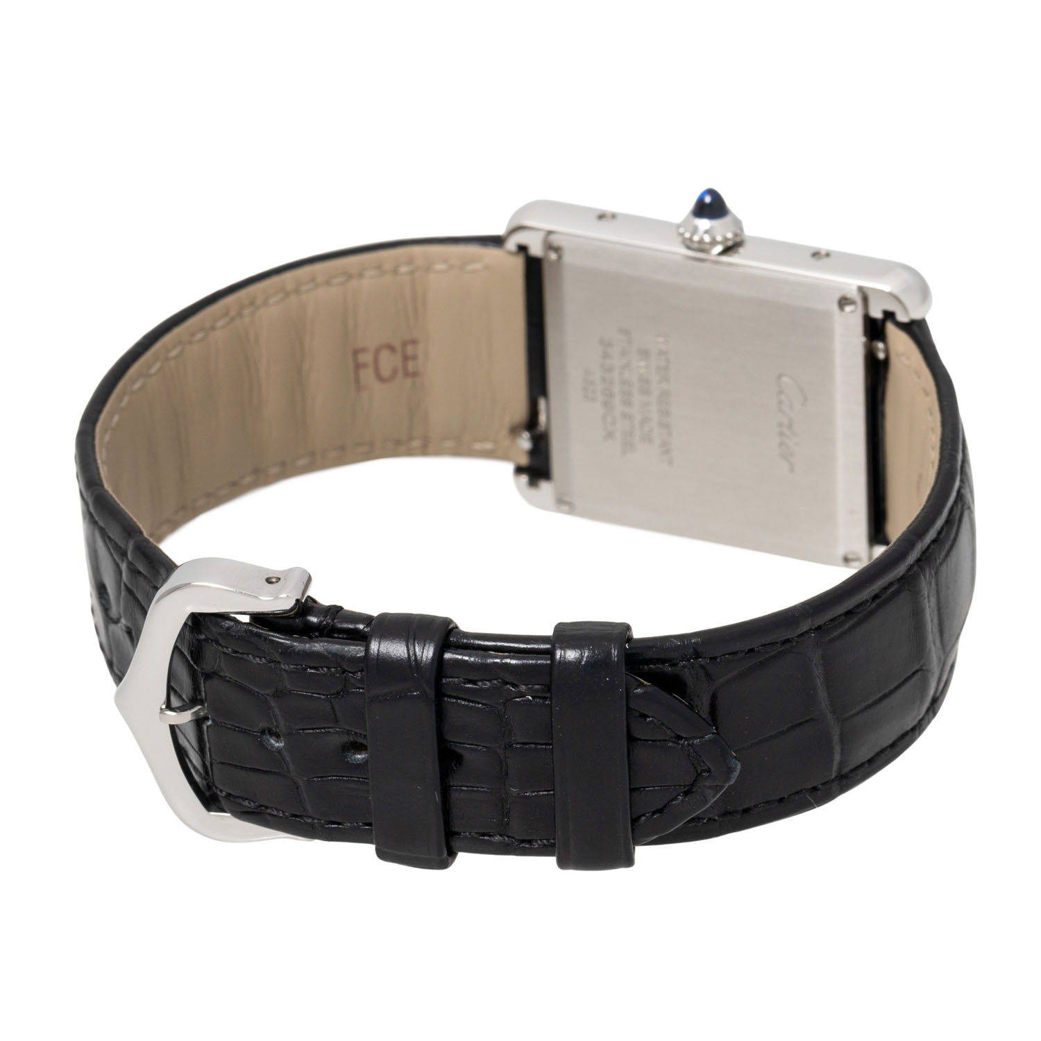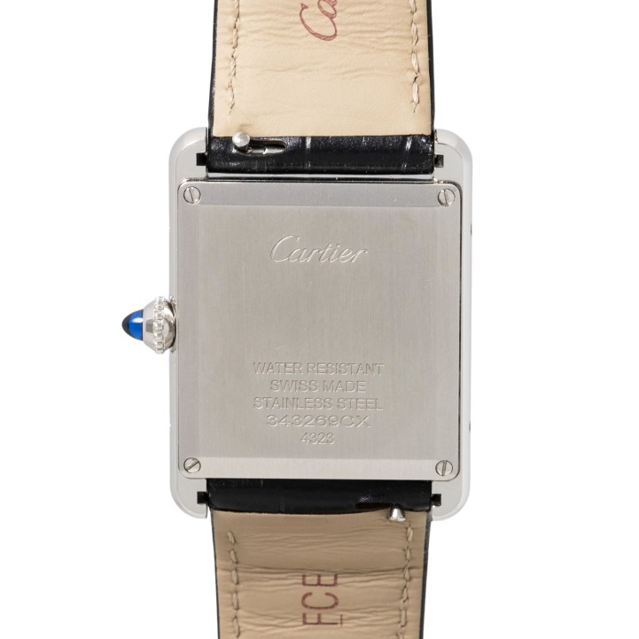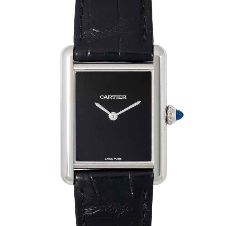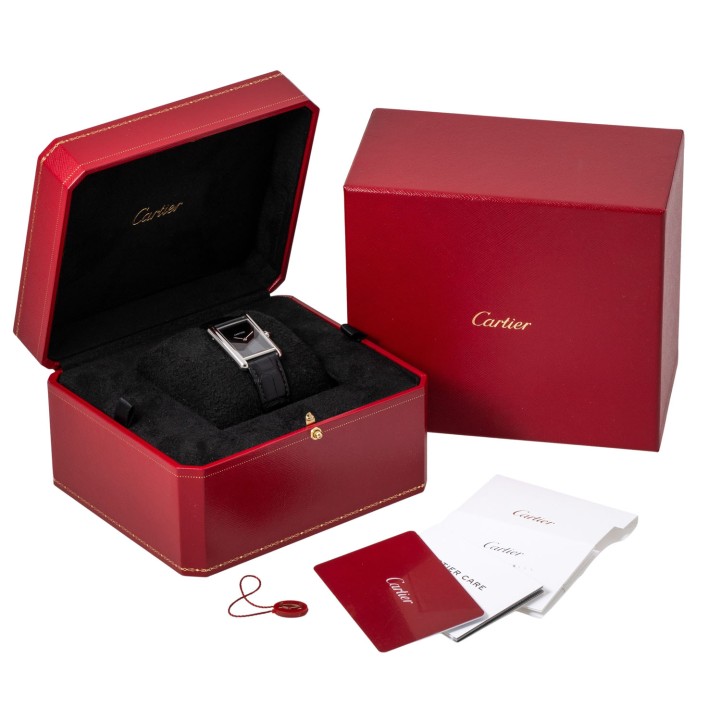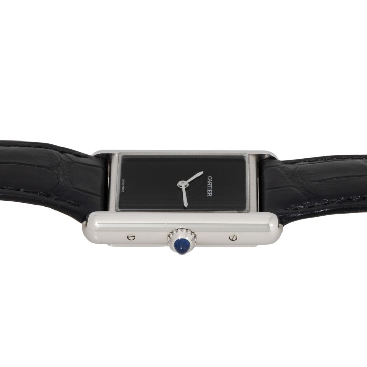 Edelstahl. Seriennummer 4323343269CX. Quarzwerk in funktionsfähigem Zustand. Neue Batterie. Schwarzes Zifferblatt mit silberfarbenen Zeigern. Krone mit blauem Saphir Cabochon. Schwarzes Cartier Lederband mit Cartier Dornschließe. Sehr guter Zustand mit minimalen Tragespuren. Original Box, Hang Tag, Anleitung, Glas- und Kronenschutz, Cartier Care Booklet und Garantiekarte vom Kauf im September 2022 anbei. Durchmesser ca. 25,5 mm (gemessen ohne Krone).